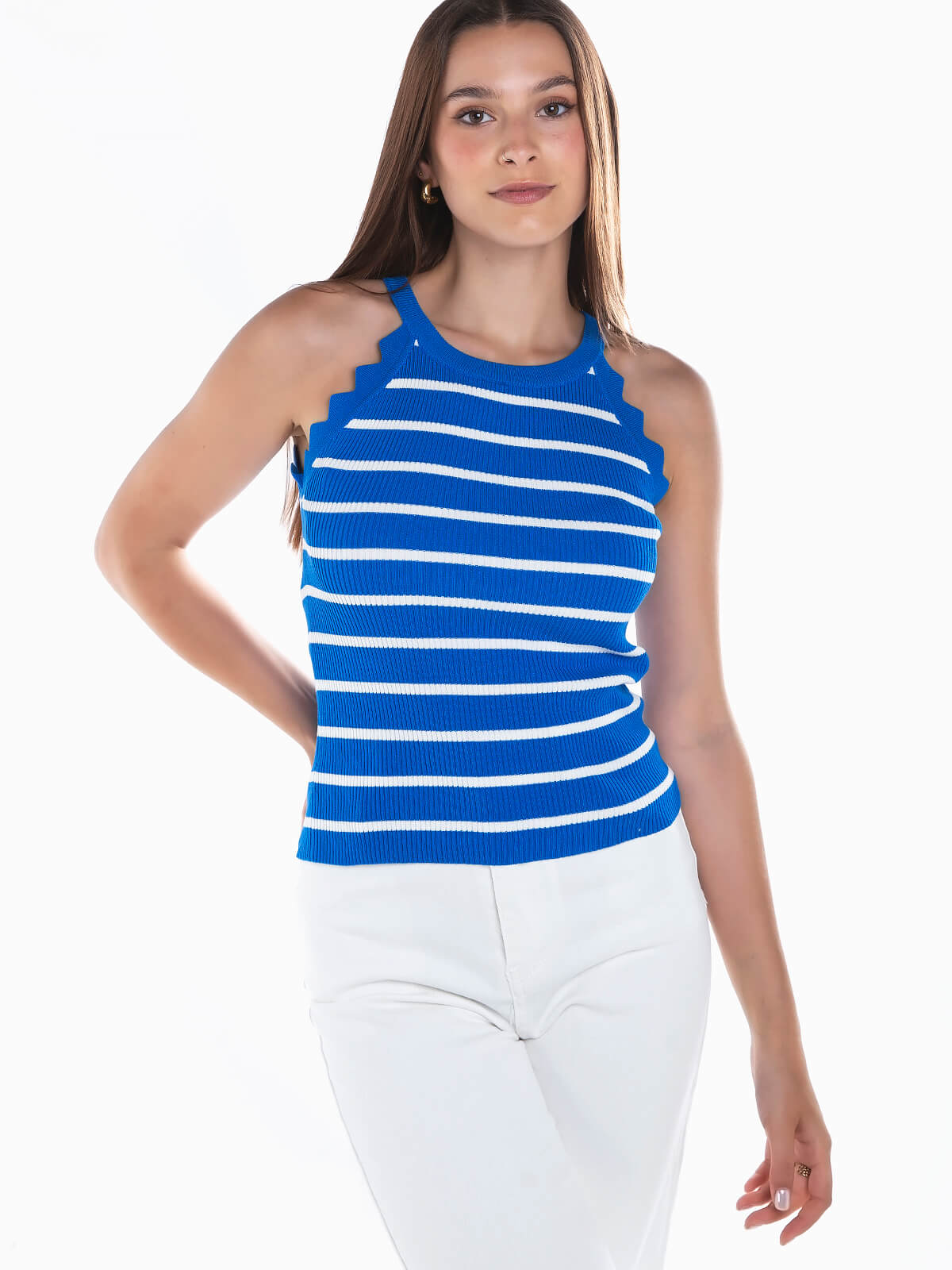 Top de malha canelada às riscas para senhora. Top justo com decote halter e pormenores recortados.