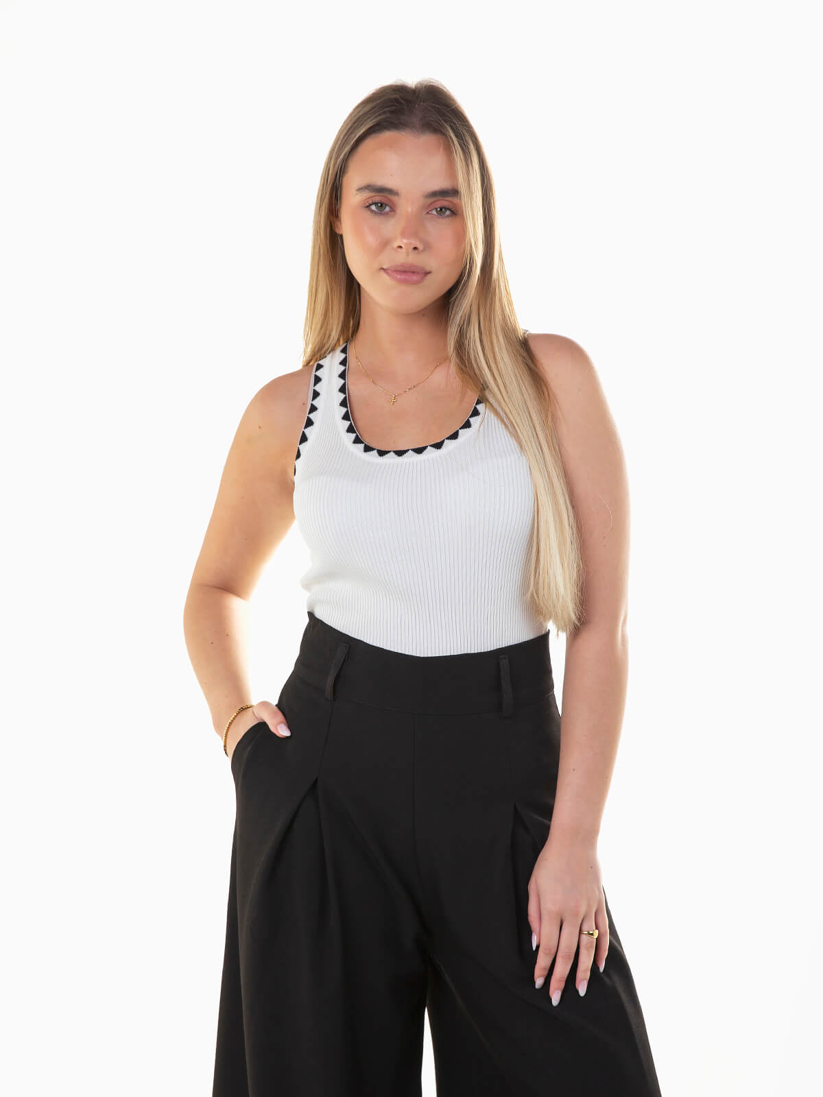 Top de malha canelada com debruns em contraste nas extremidades. Top com alças largas e decote redondo.