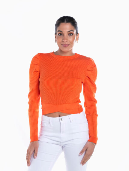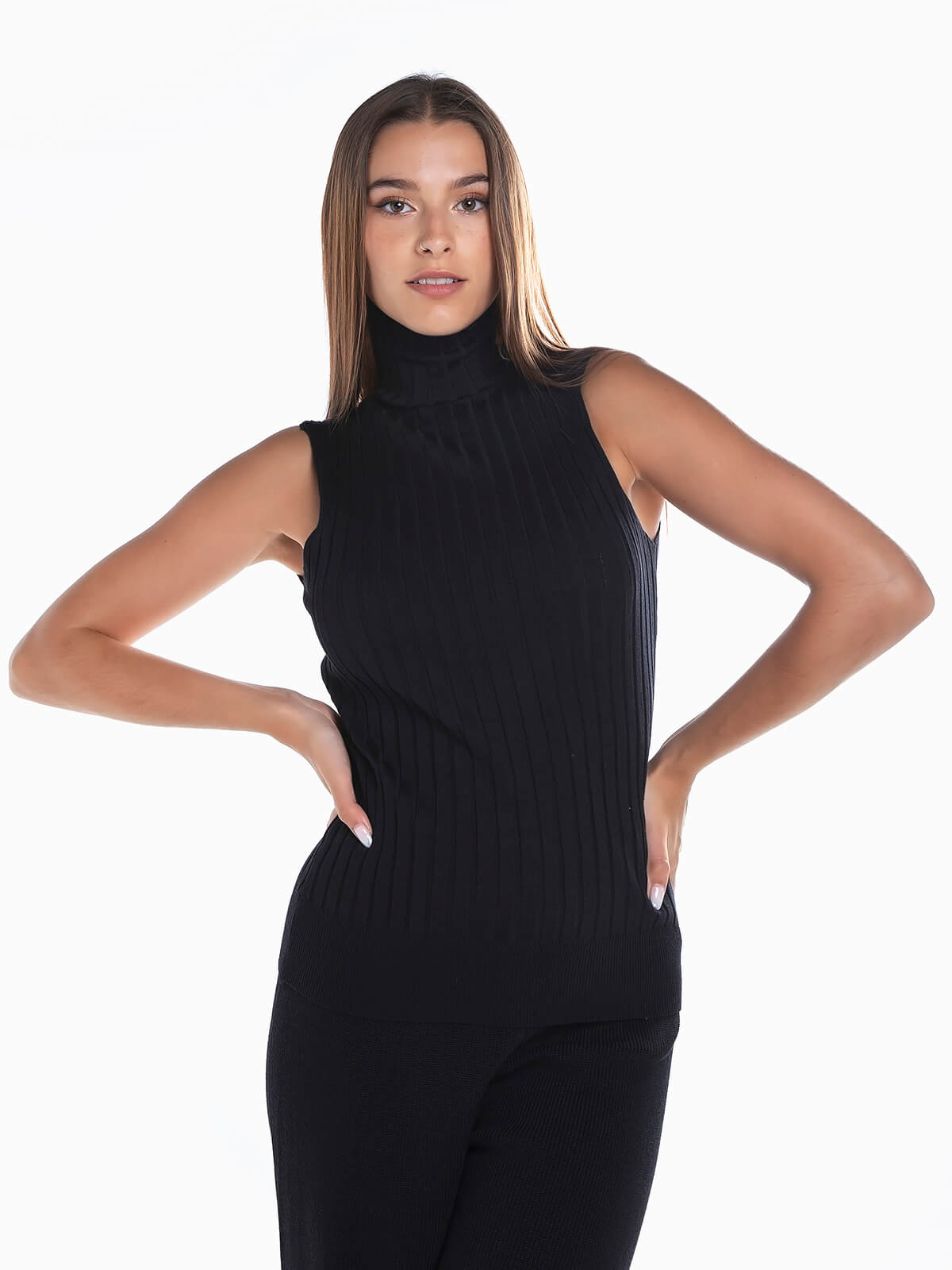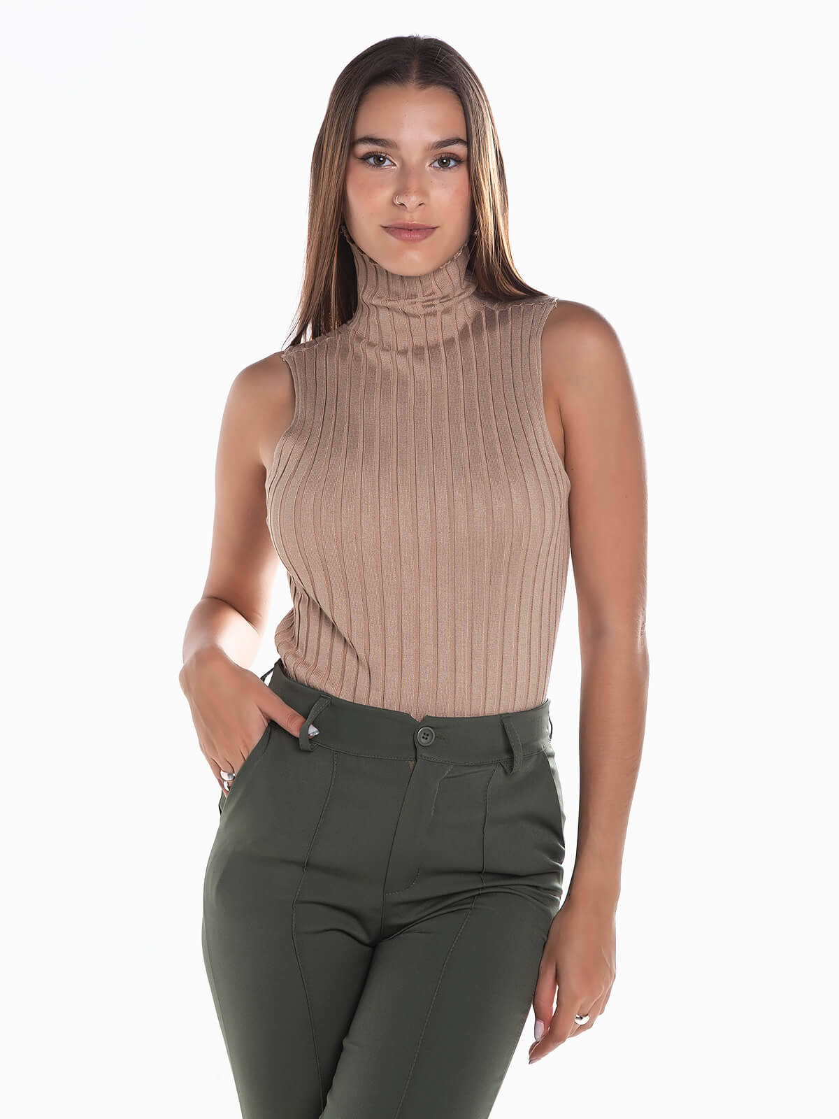 Top malha canelada com gola alta para senhora. Top elástico manga cava de corte justo.