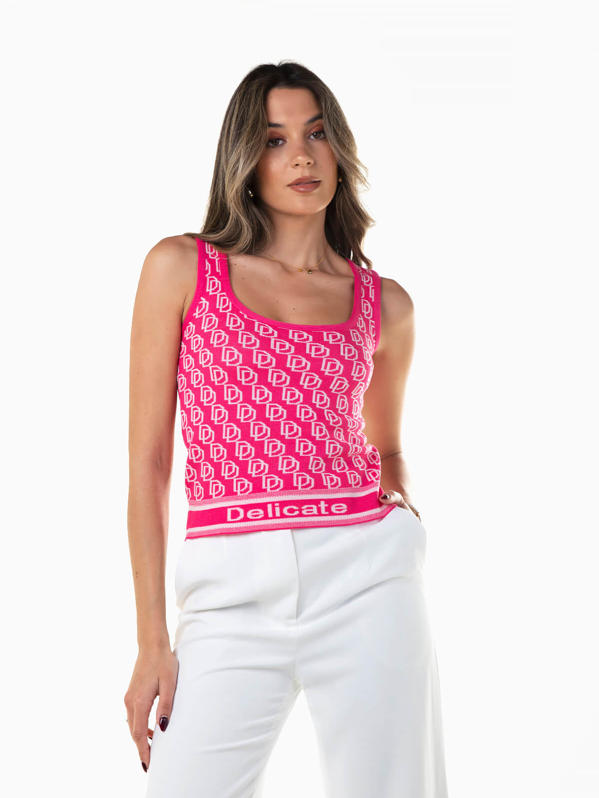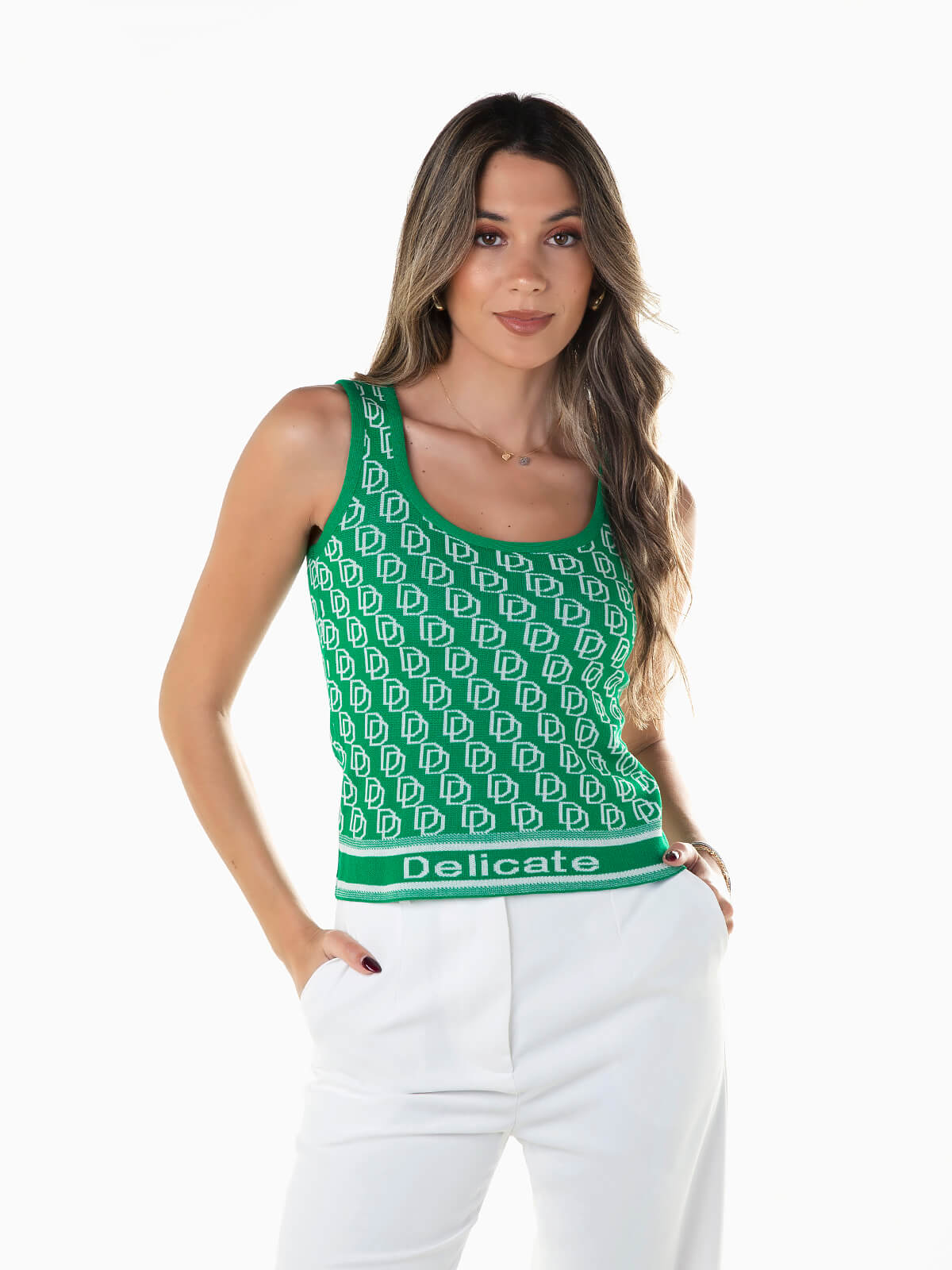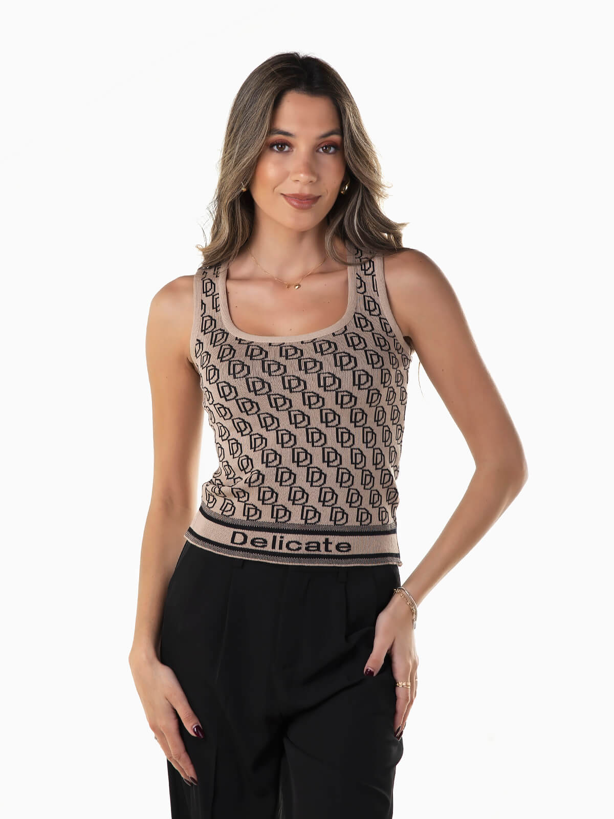 Top de malha com padrão e letras. Top alças com decote quadrado.