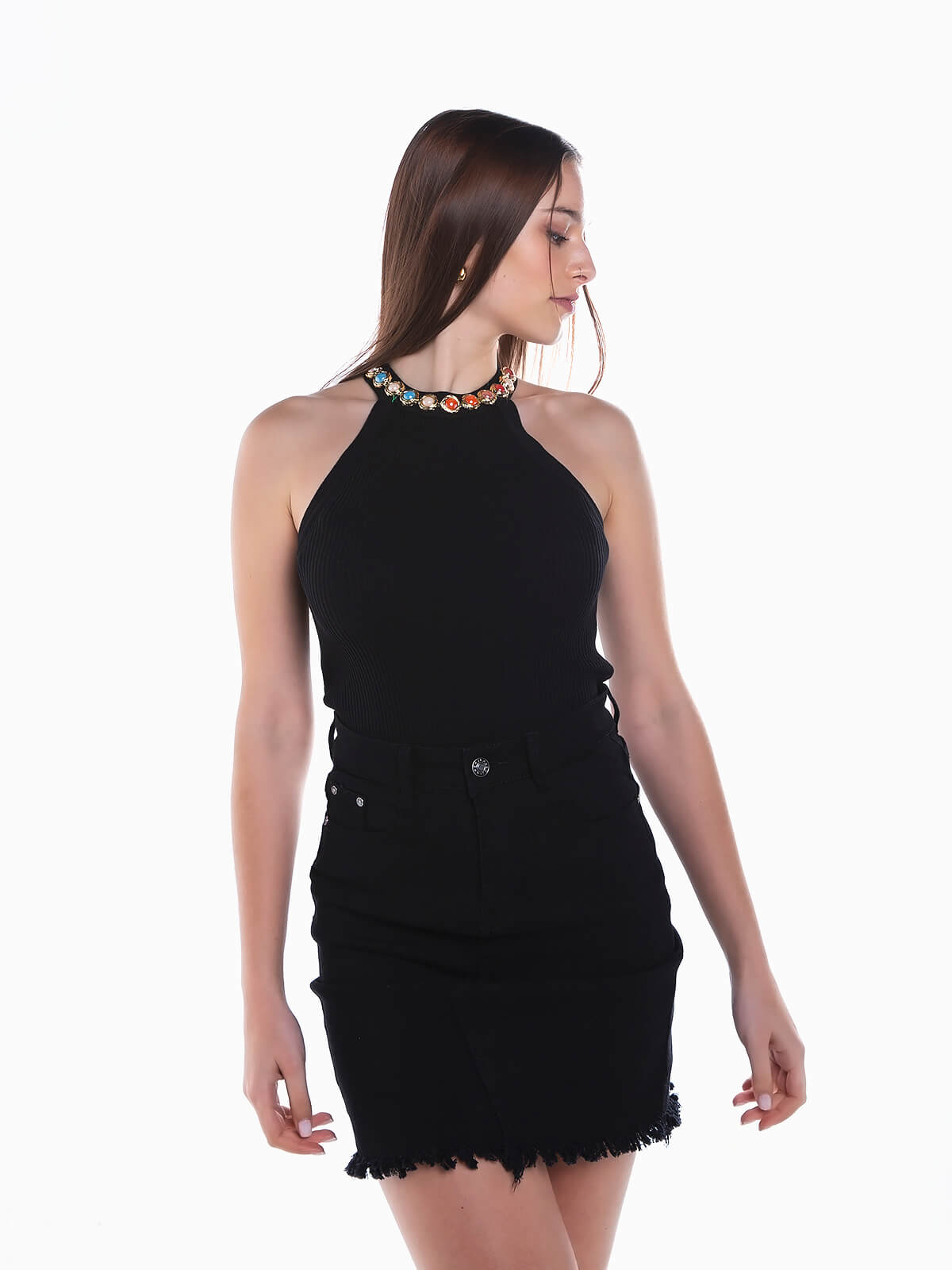 Top de malha com decote halter e aplicação de pérolas coloridas. Top justo em