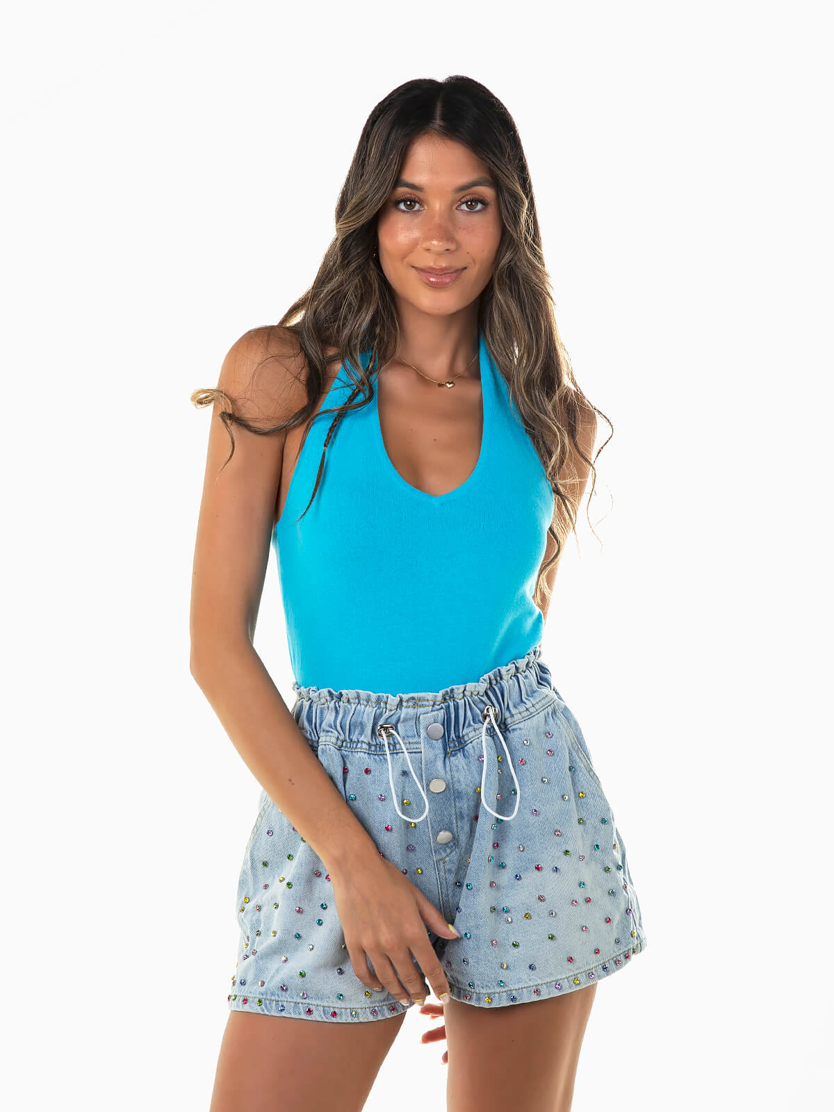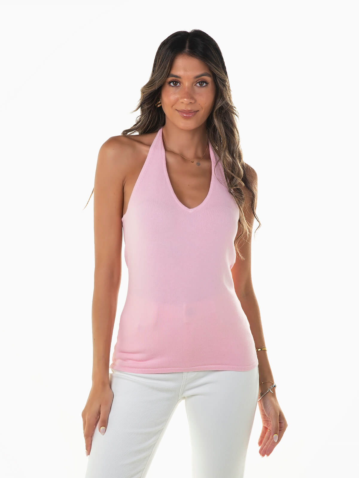 Top malha de algodão com decote halter e abertura. Top com costas descobertas.