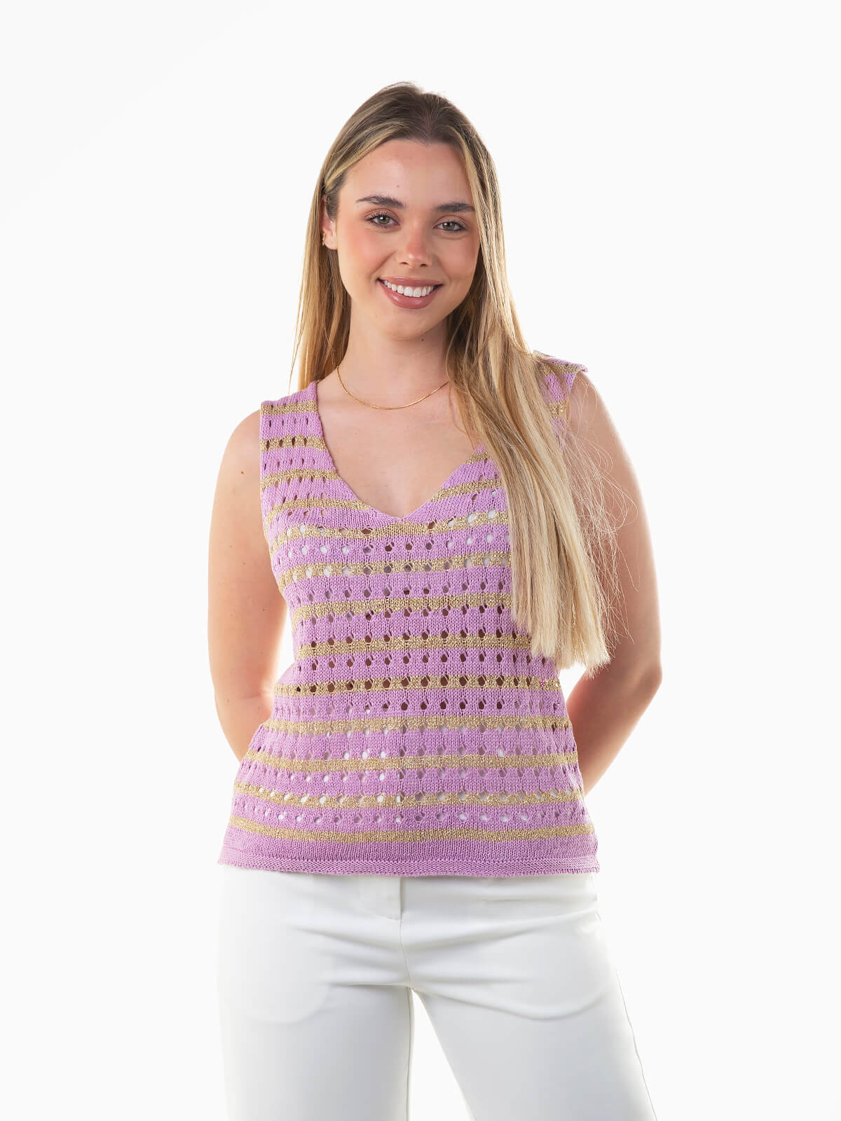 Top em malha perfurada com fios luréx para efeito brilhante. Top sem mangas com decote em V.