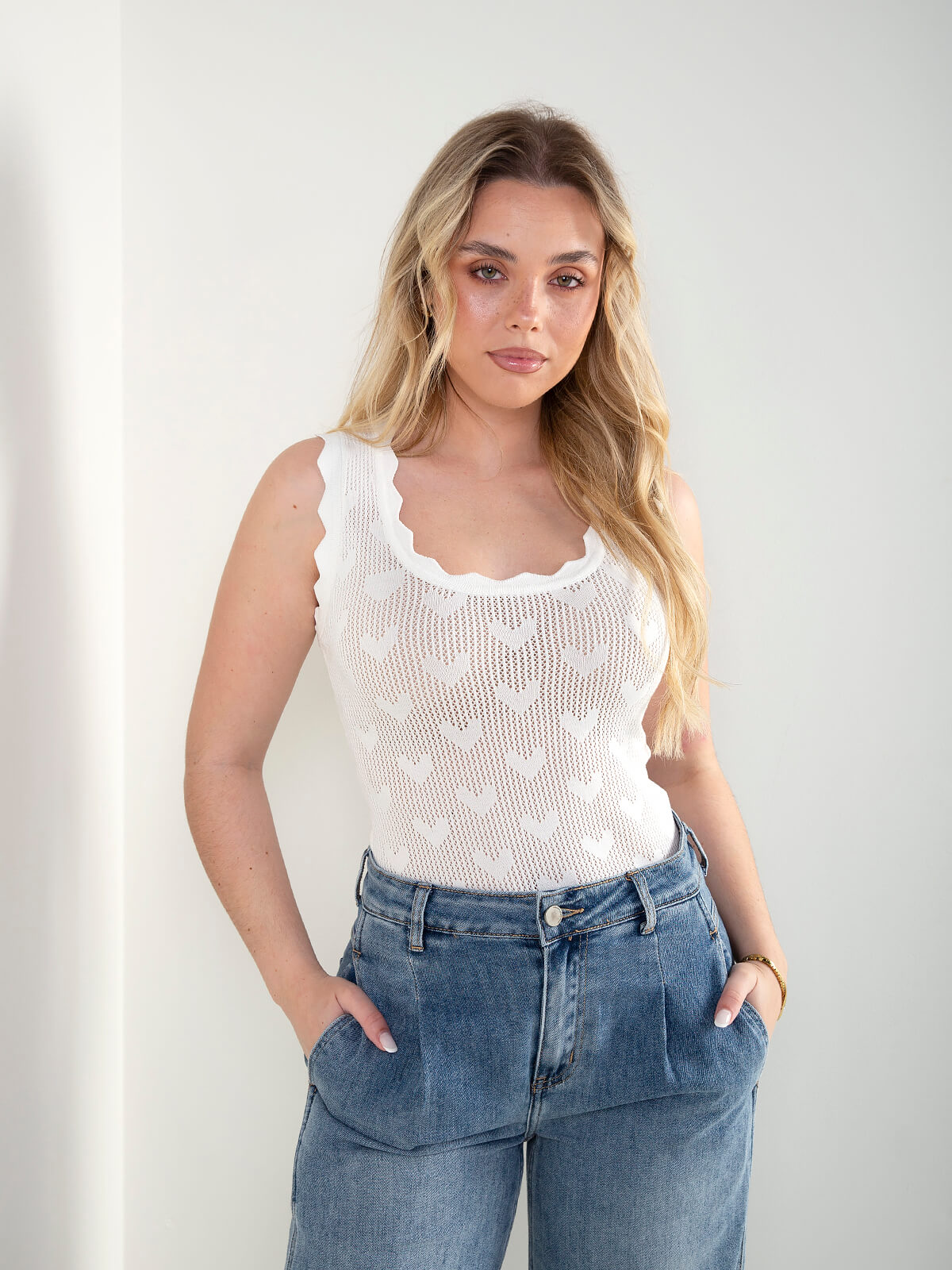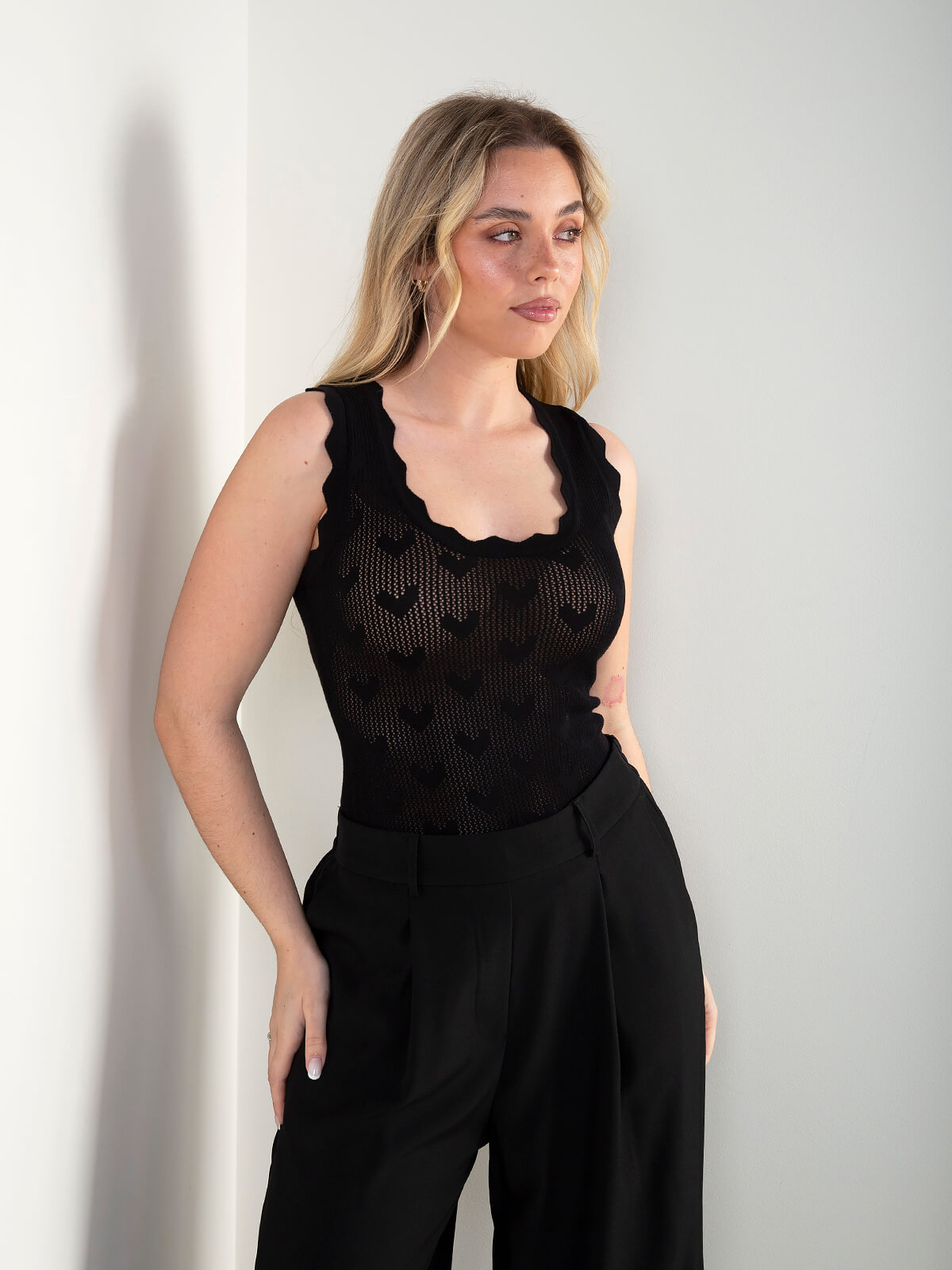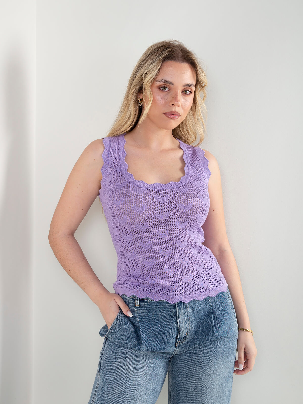 Top em malha rendilhada com pormenor de corações. Top semitransparente com manga cava e decote redondo. Acabamentos recortados.