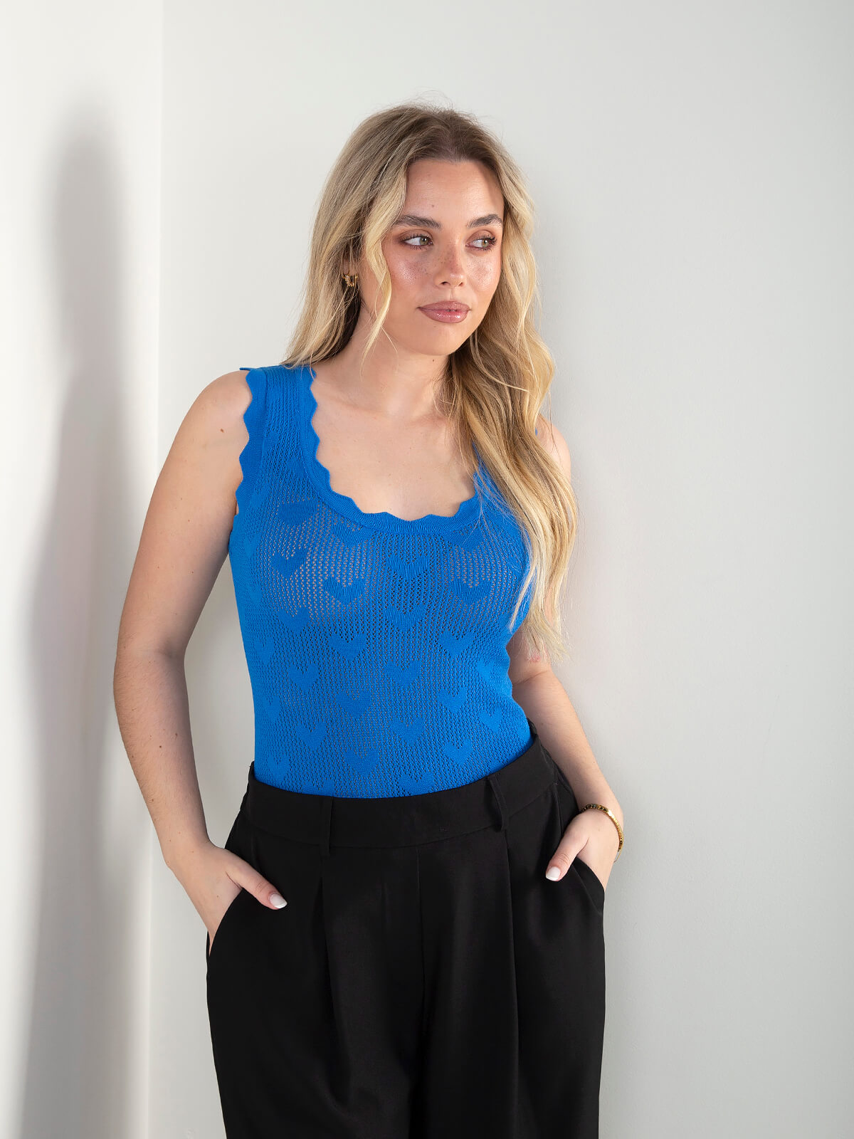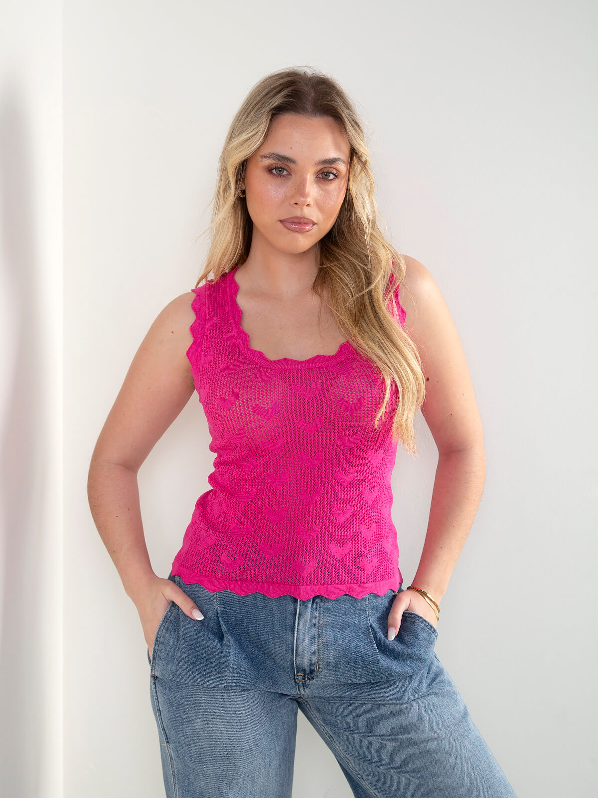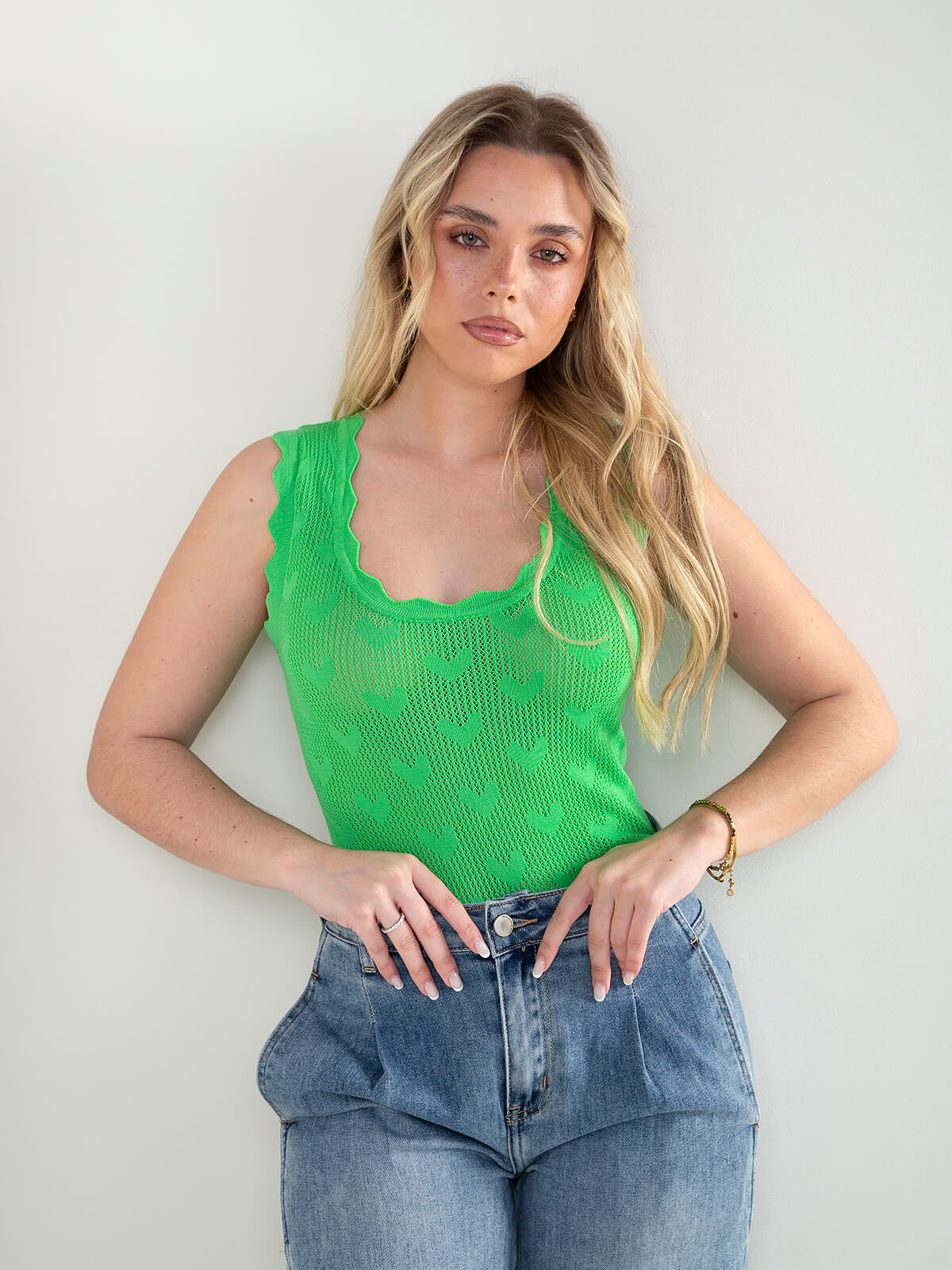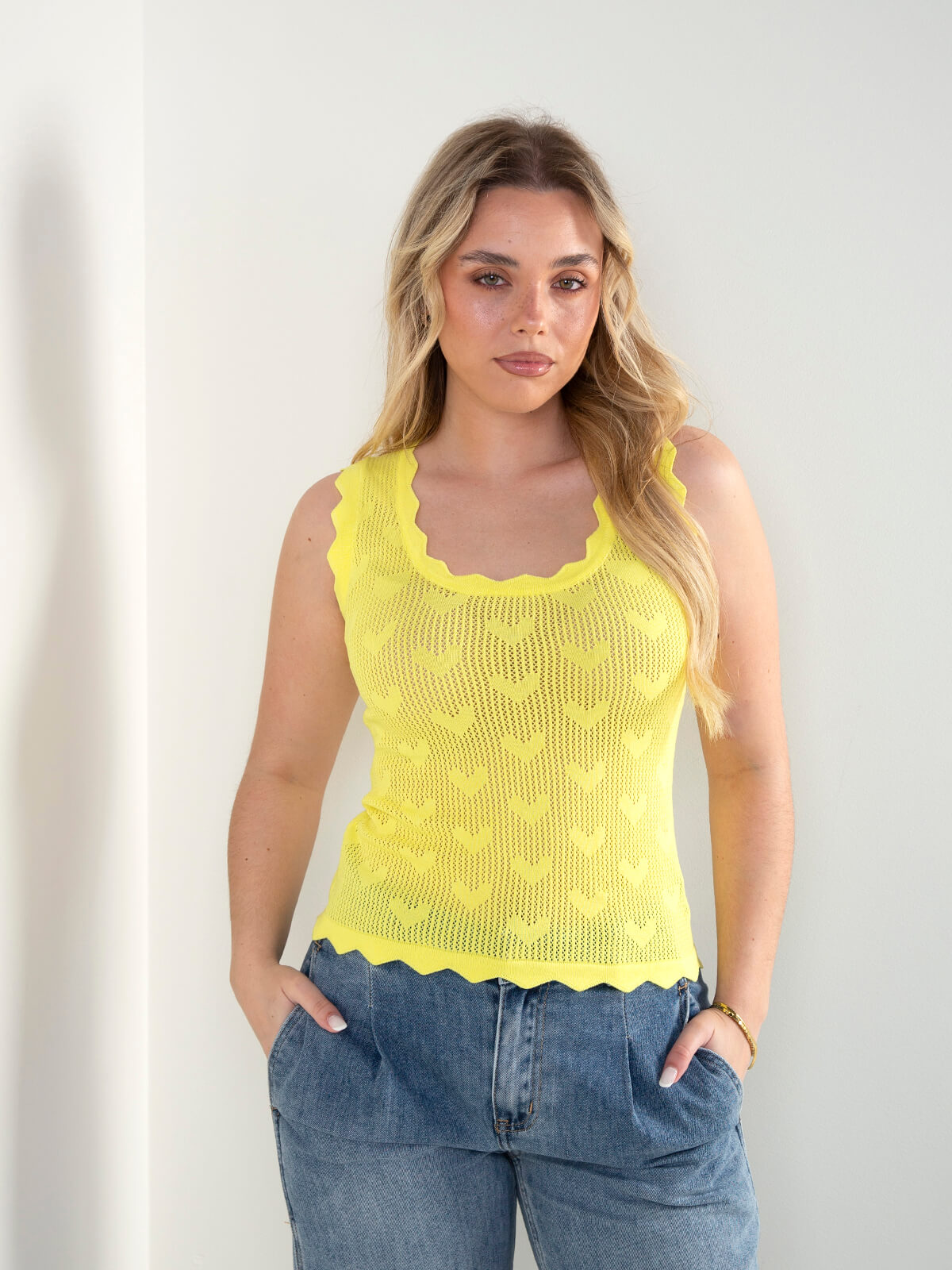 Top em malha rendilhada com pormenor de corações. Top semitransparente com manga cava e decote redondo. Acabamentos recortados.