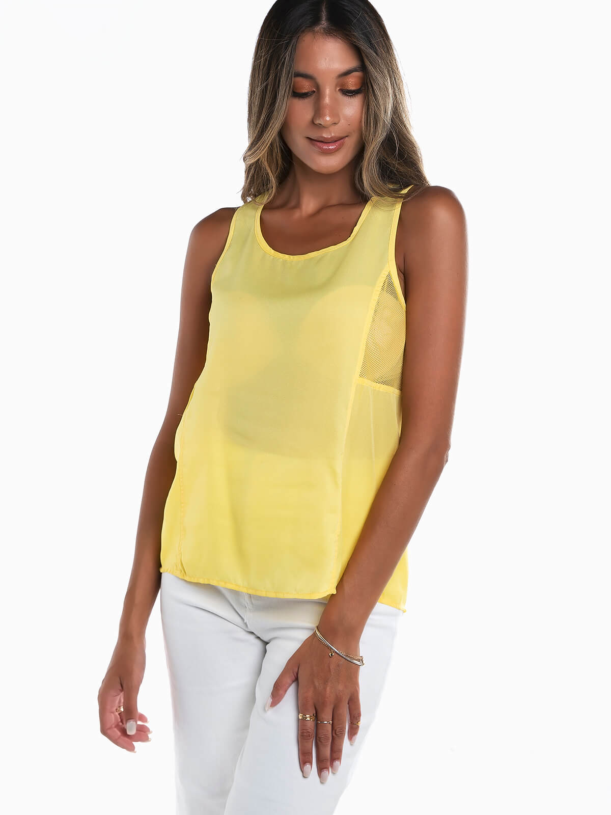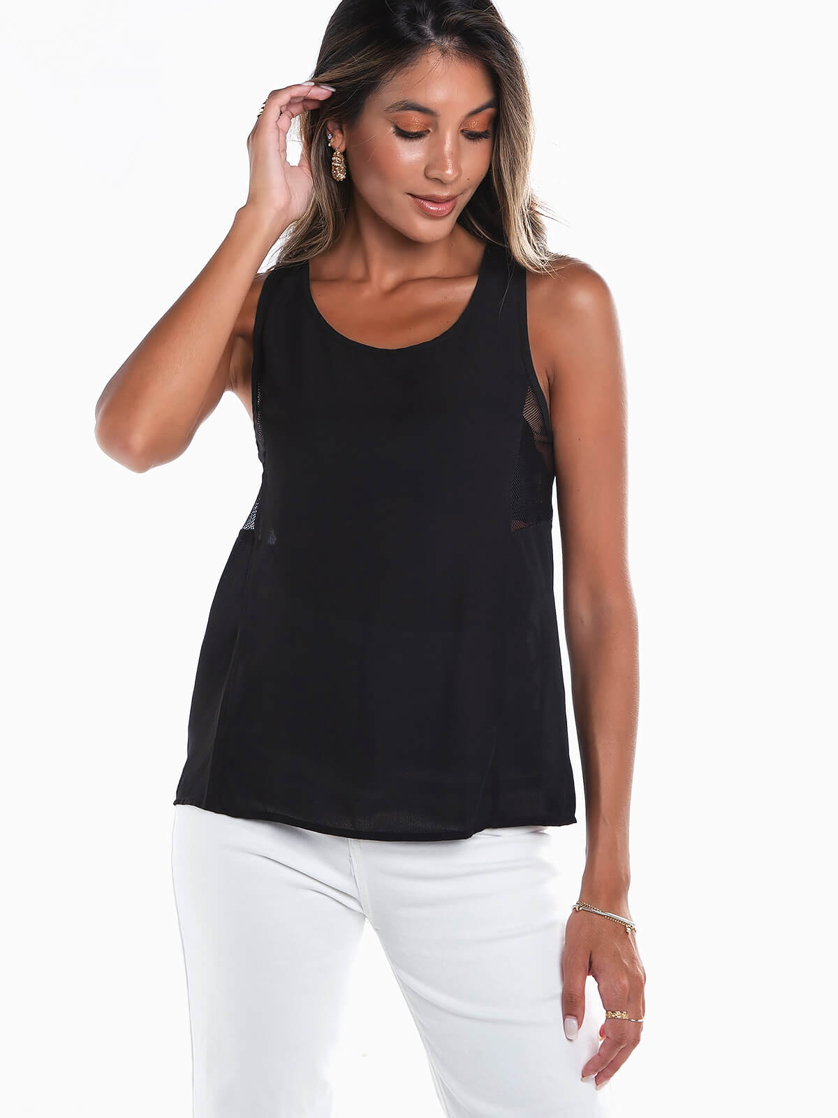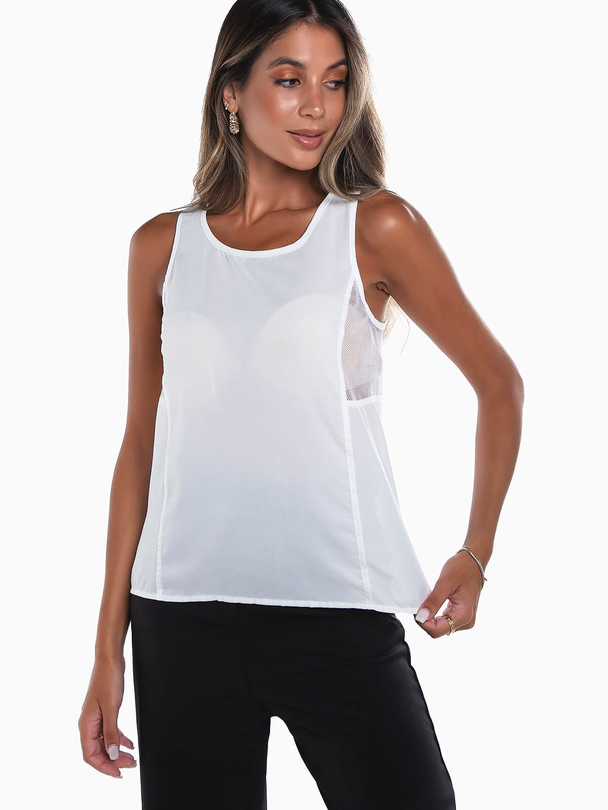 Top de manga cava combinado com tecido perfurado e renda. Top com transparência e decote redondo.