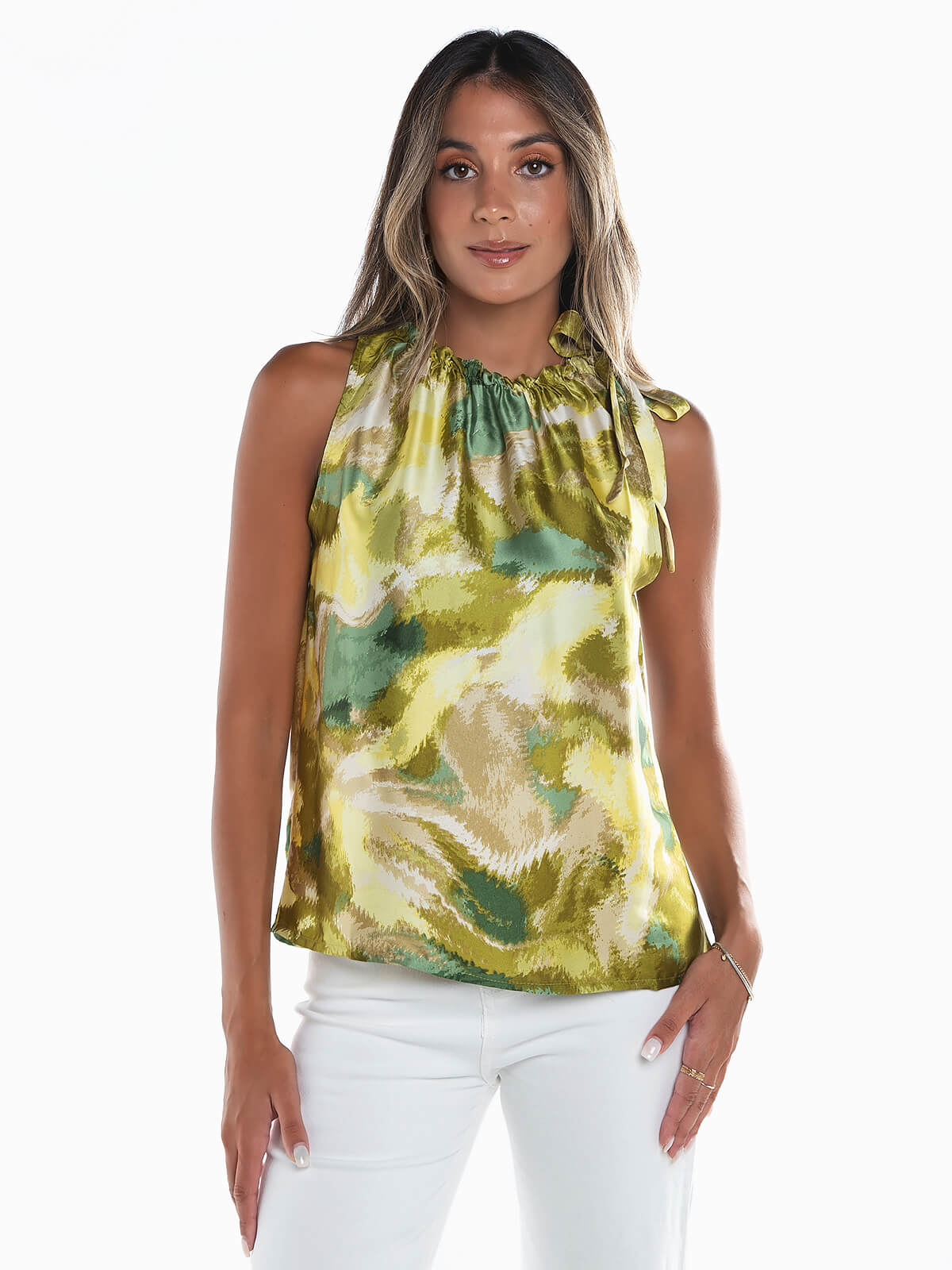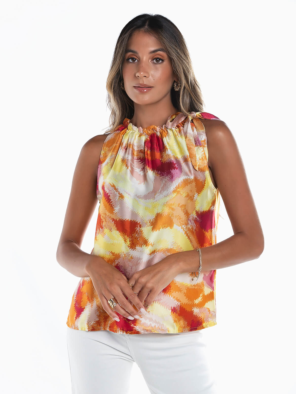 Top de manga cava com estampado abstrato colorido. Top para senhora com decote halter e tecido para laço.