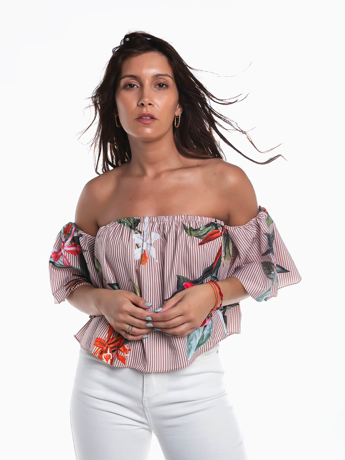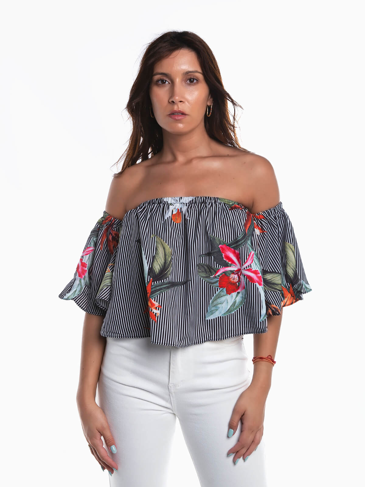 Top de ombros descobertos às riscas e flores. Crop top de manga curta com elástico no decote.