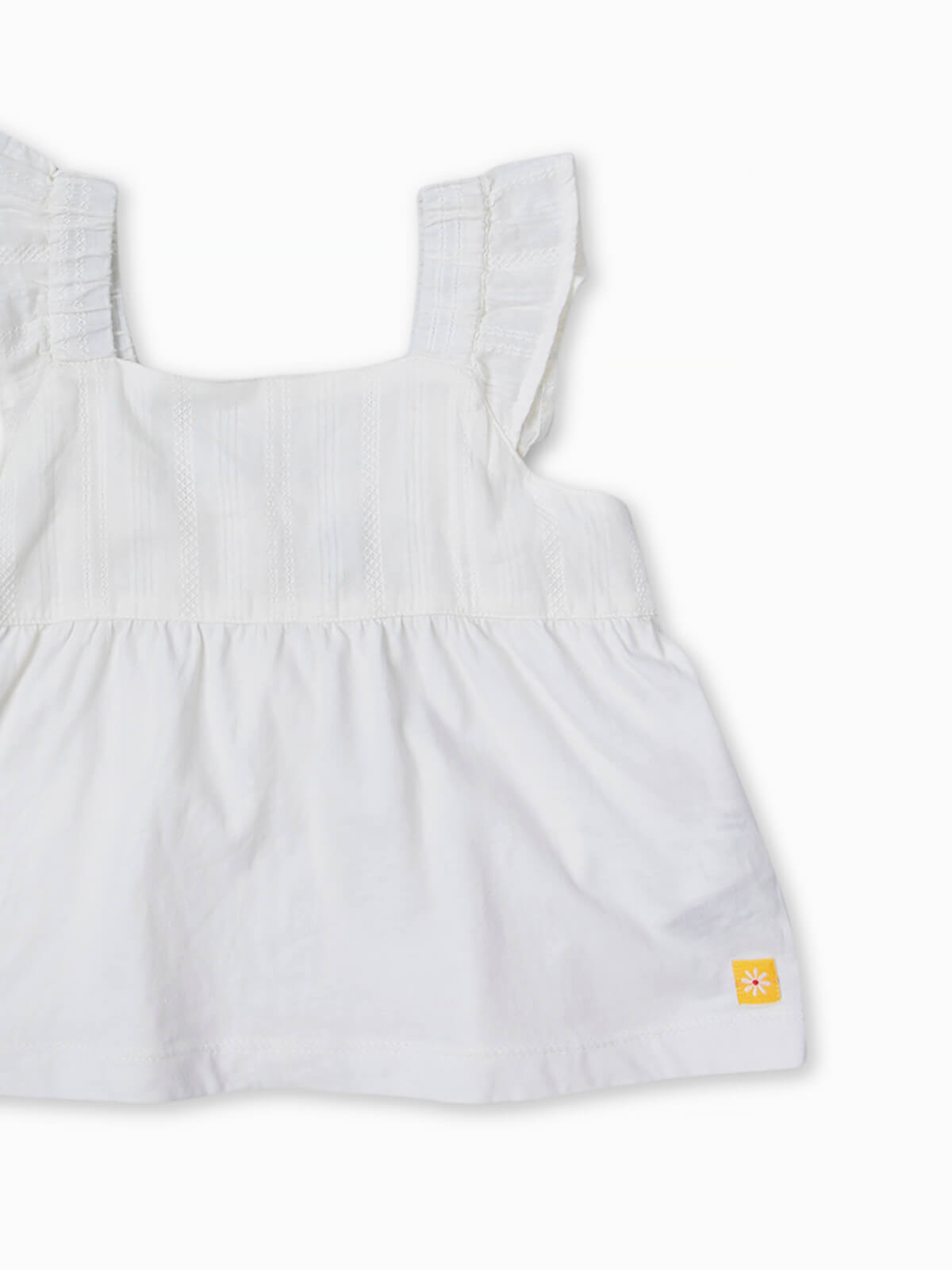 Top pérola de alças para bebé menina. Top em tecido 100% algodão com pormenor elástico e encaixe de folho. Aperto posterior de botão.