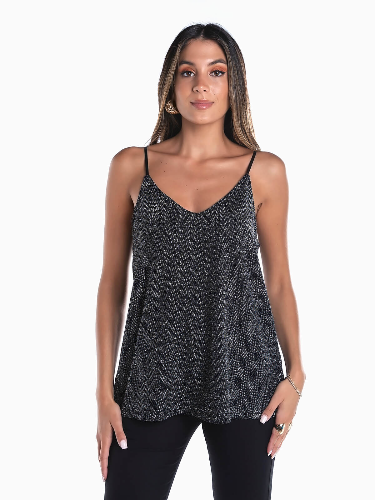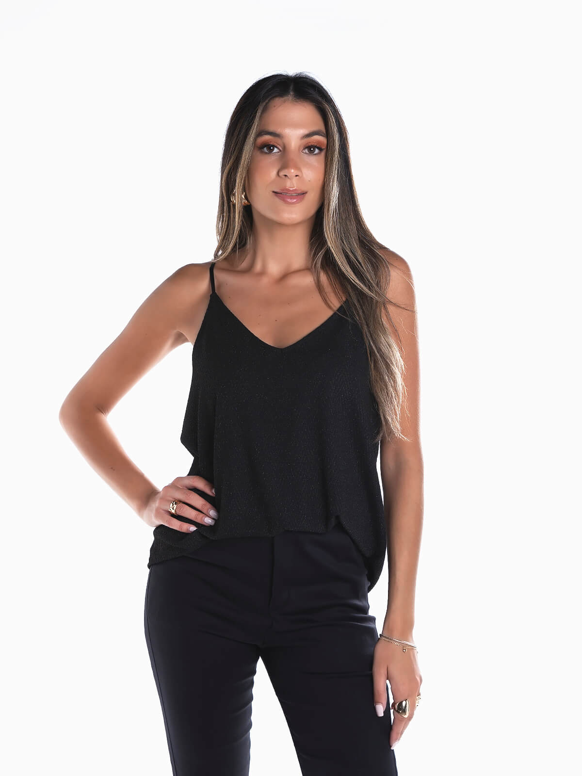 Top preto com fios luréx para efeito brilhante. Top fluído de alças com decote em bico.