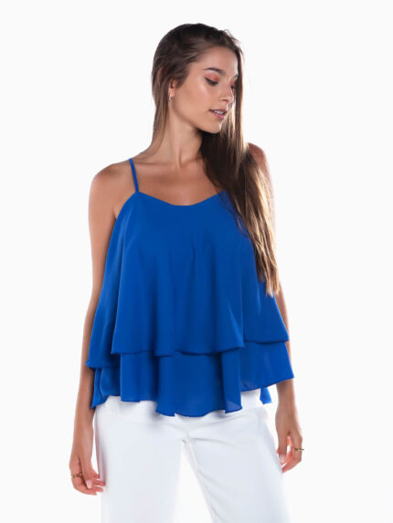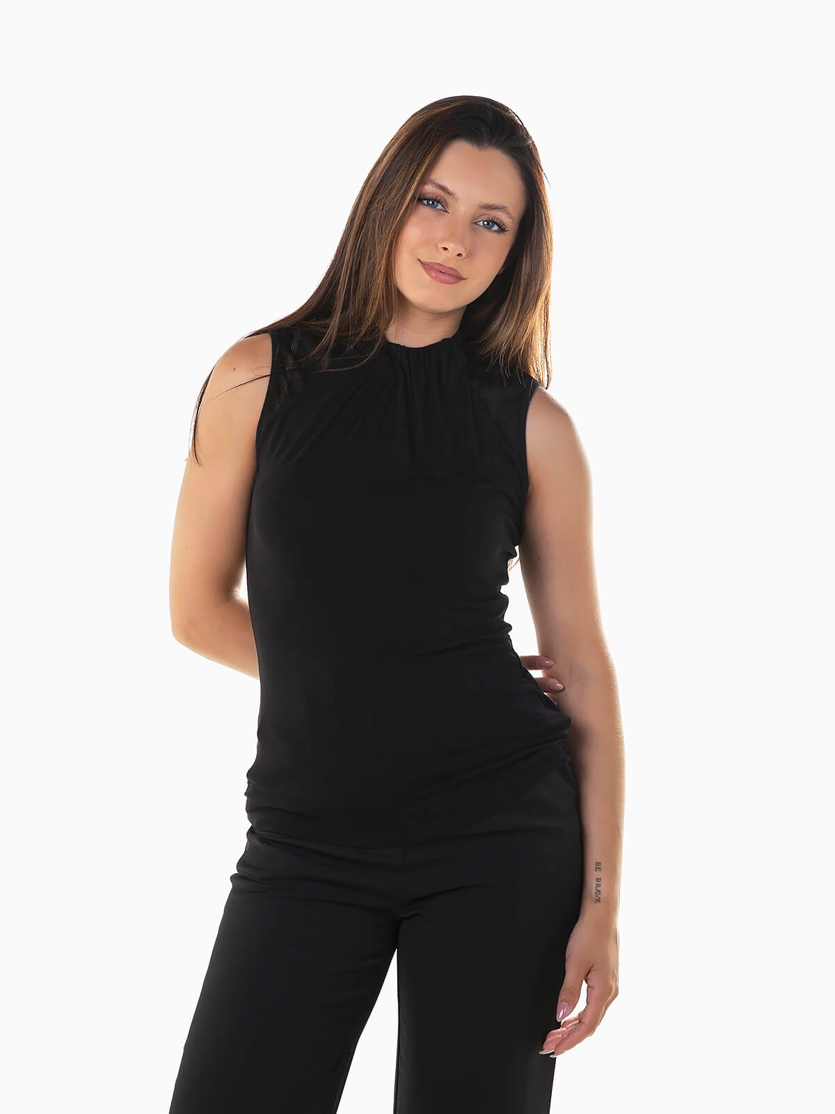 Top preto sem mangas para senhora. Top com decote halter drapeado e pormenores perfurados. Aperto posterior de 3 botões.