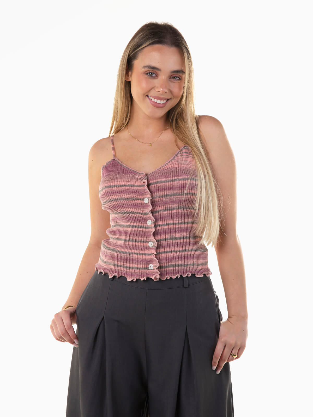 Top malha canelada com riscas e aperto frontal de botões. Top alças finas com acabamentos rolling. Decote em V.