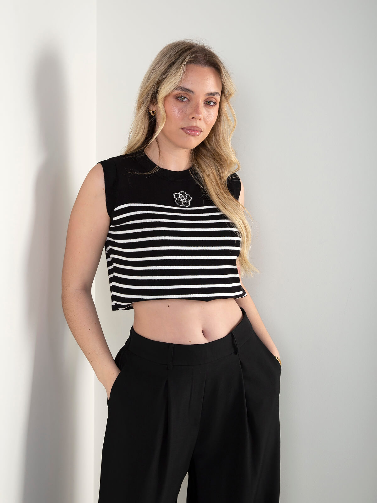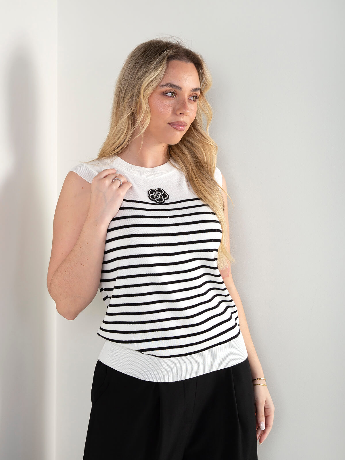 Top de malha sem mangas com padrão às riscas e detalhe frontal em contraste. Com corte leve e confortável, é uma peça prática para o dia a dia, fácil de conjugar com diferentes estilos e looks.