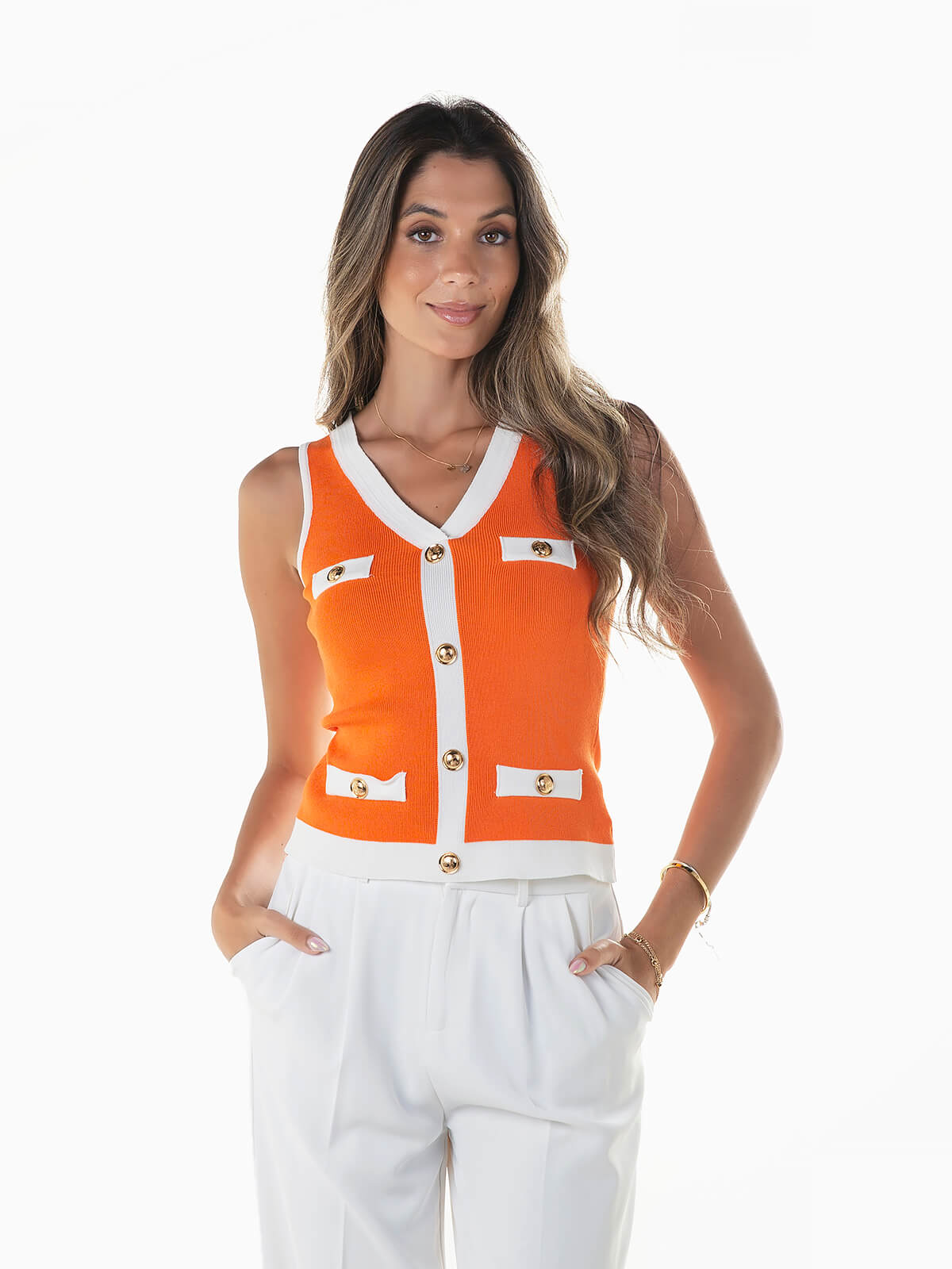 Top sem mangas com botões dourados decorativos. Top malha com extremidades em contraste e decote em V.