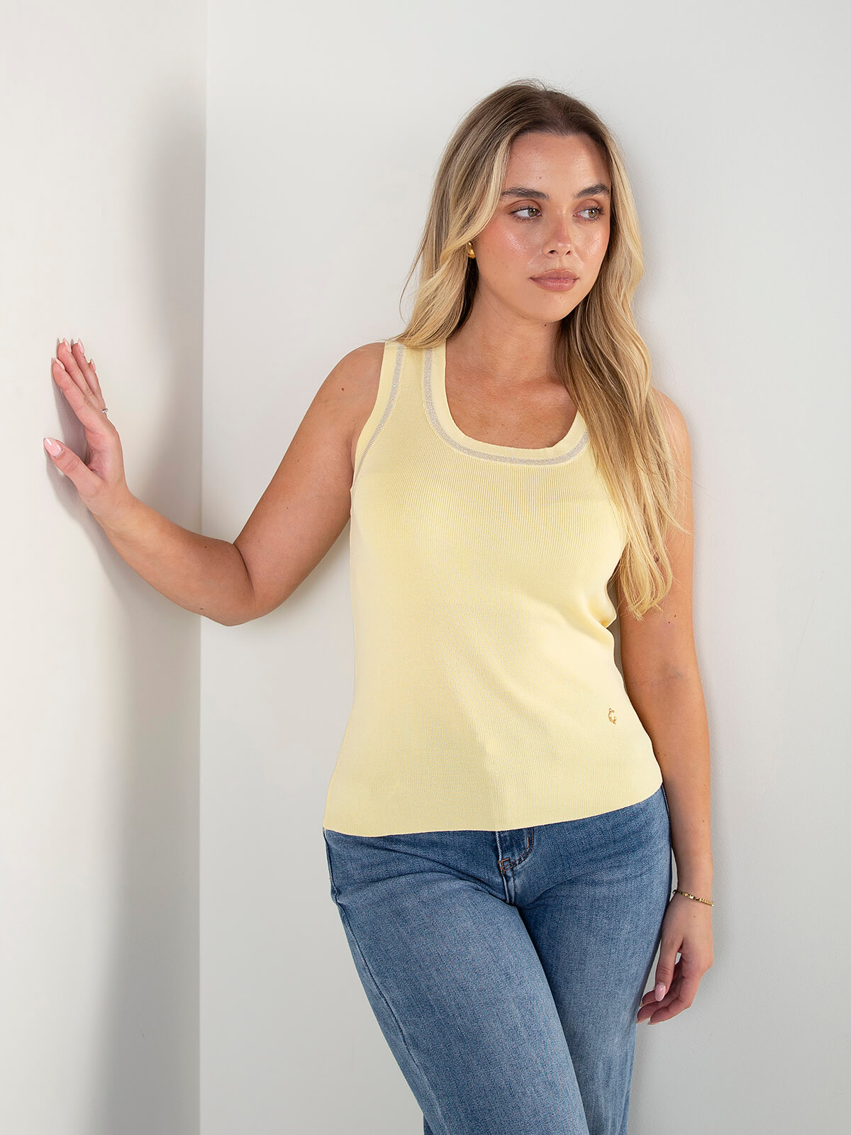 Top sem mangas com acabamento brilhante no decote. Modelo leve e confortável, ideal para looks de verão com um toque subtil de brilho.