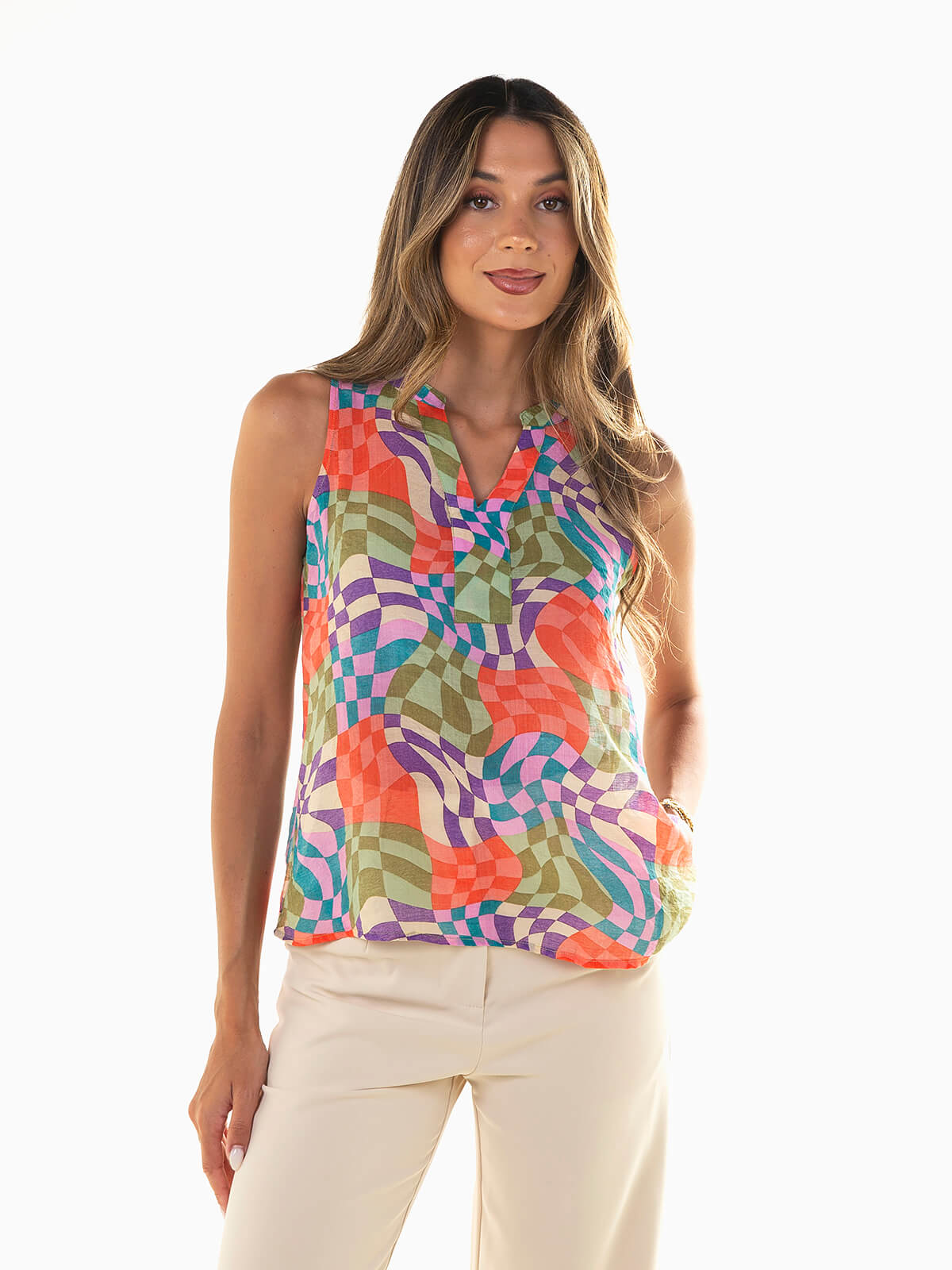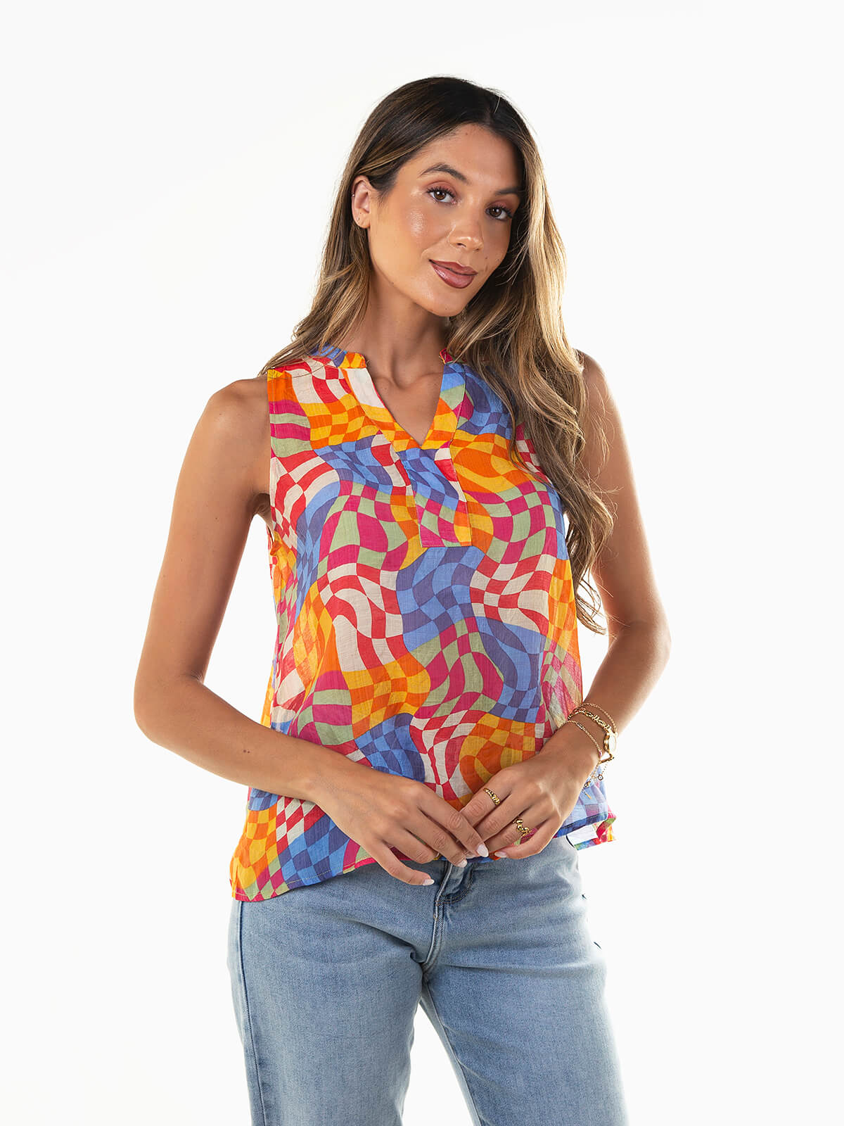 Top sem mangas com padrão geométrico. Modelo semitransparente com gola mao e abertura em V, ideal para looks leves e modernos.