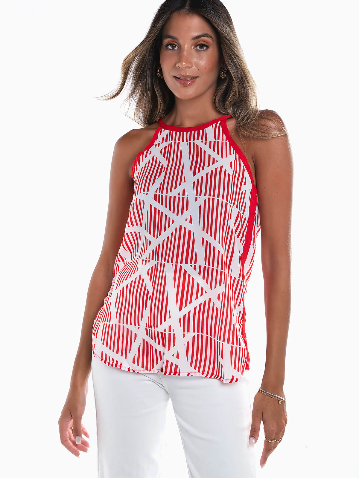Top vermelho de manga cava para senhora. Top às riscas com decote halter e detalhe aberto. Aperto posterior de laço.