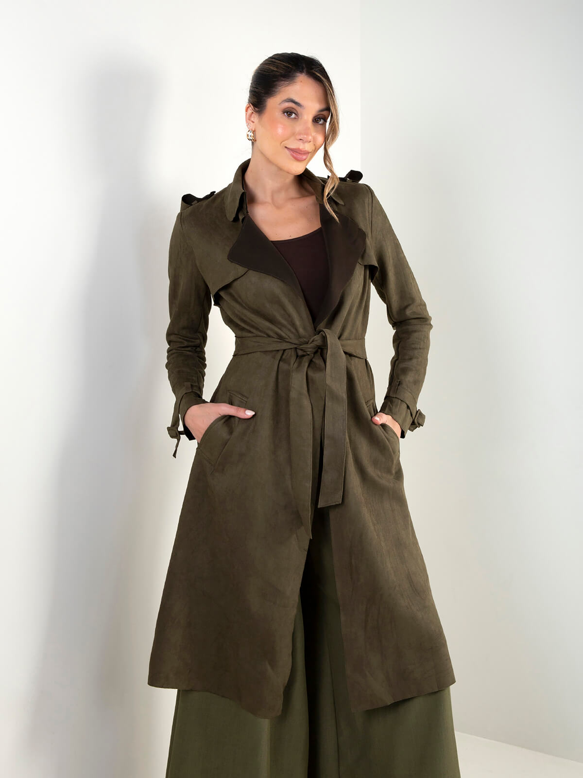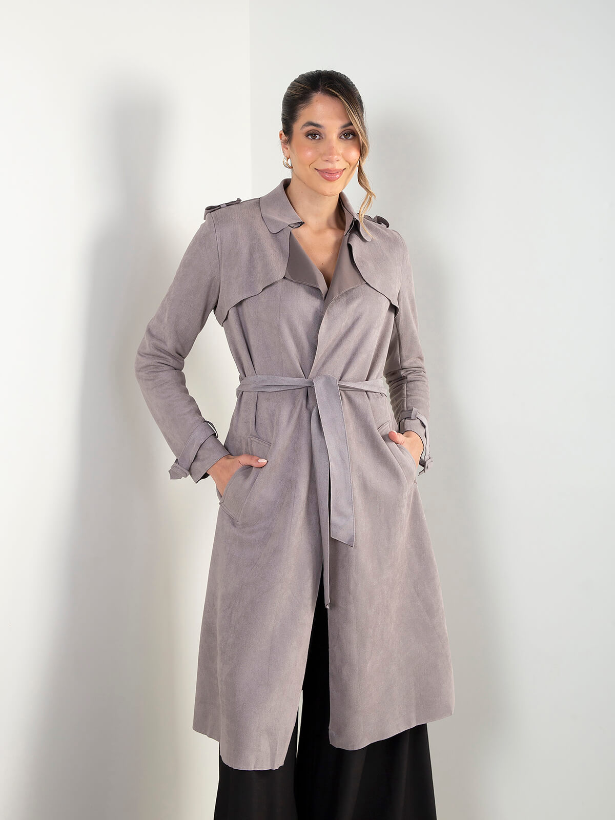 Trench coat para senhora em efeito camurça fina, com design intemporal e cinto ajustável. 2 bolsos. Modelo elegante e versátil, ideal para completar looks de meia-estação com um toque sofisticado.