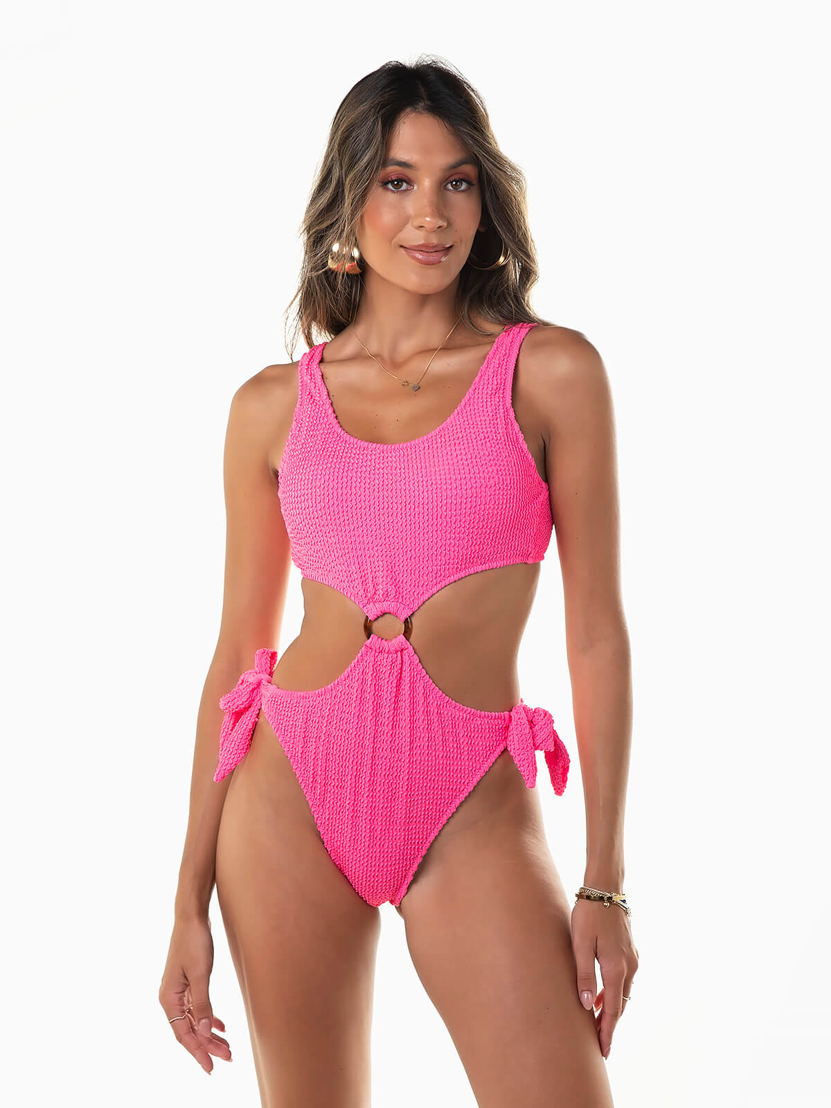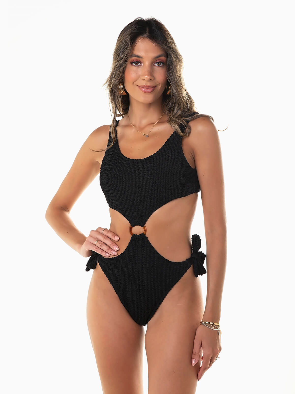 Triquíni em tecido com textura e pormenor de argola. Fato de banho cut out com cobertura parcial. Possui almofada removível no peito. Decote redondo e aperto de laços nas laterais e parte posterior.