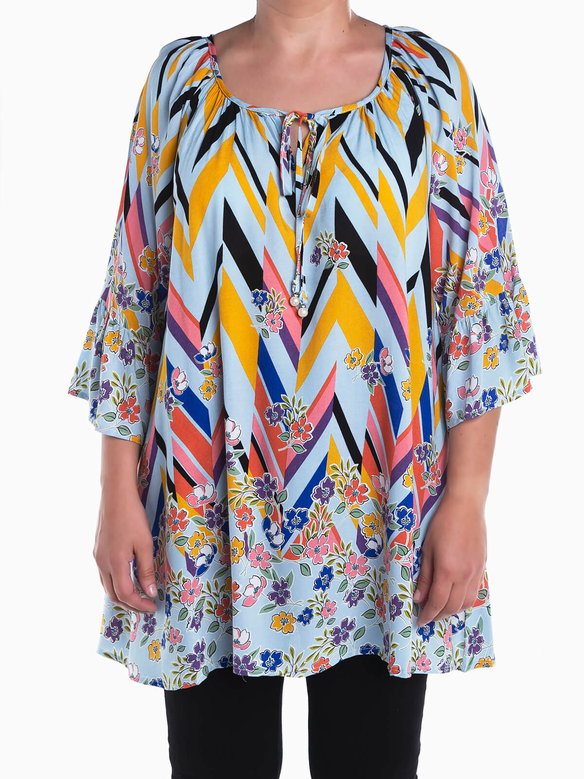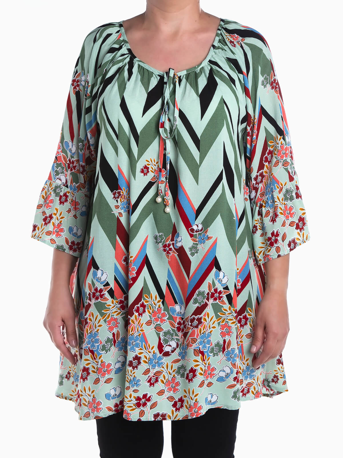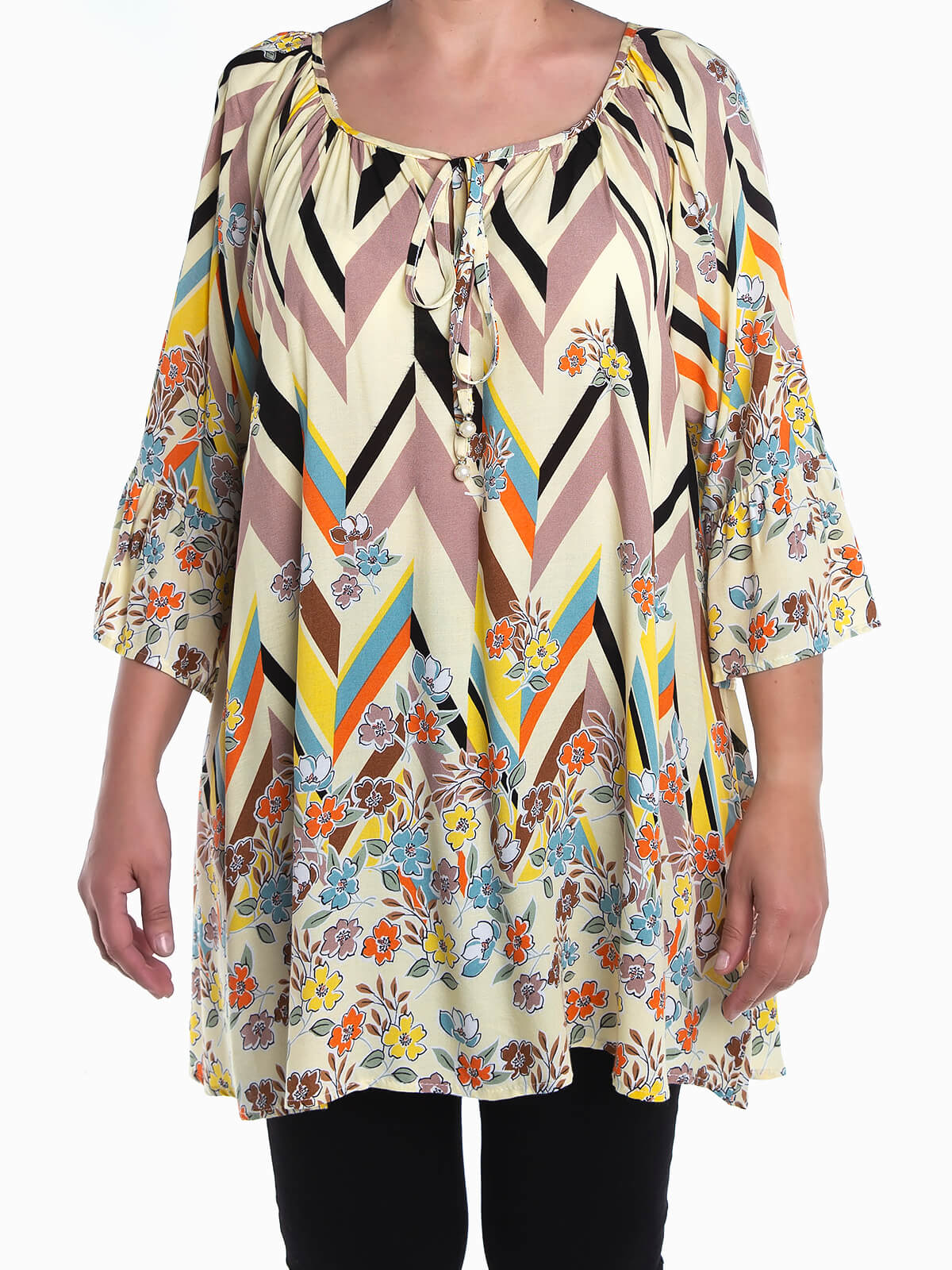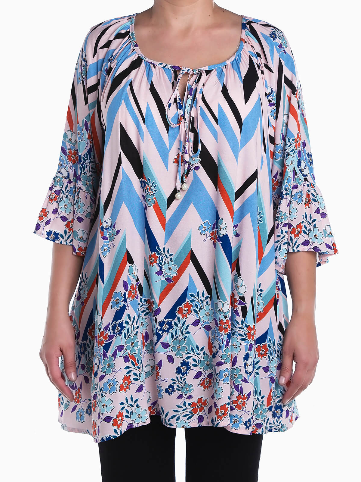 Túnica comprida com estampado abstrato combinado com flores. Blusa com manga 3/4 acabada em folho. Decote redondo e cordão para laço.
