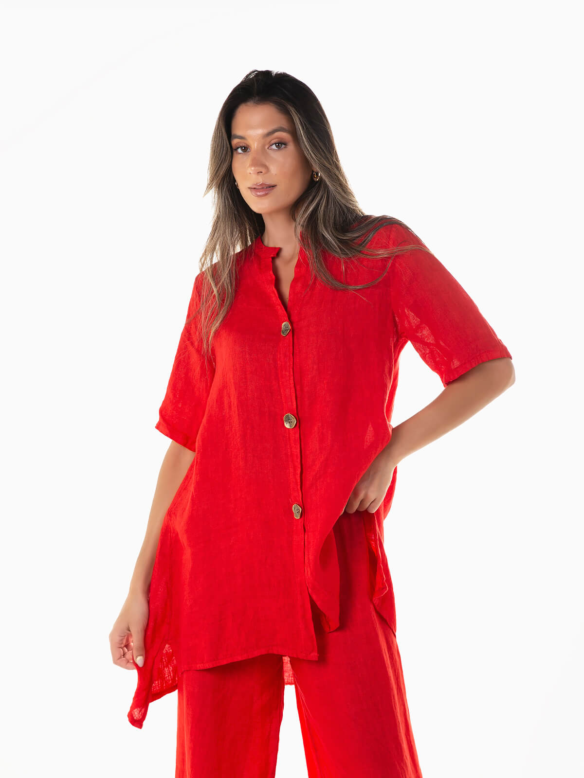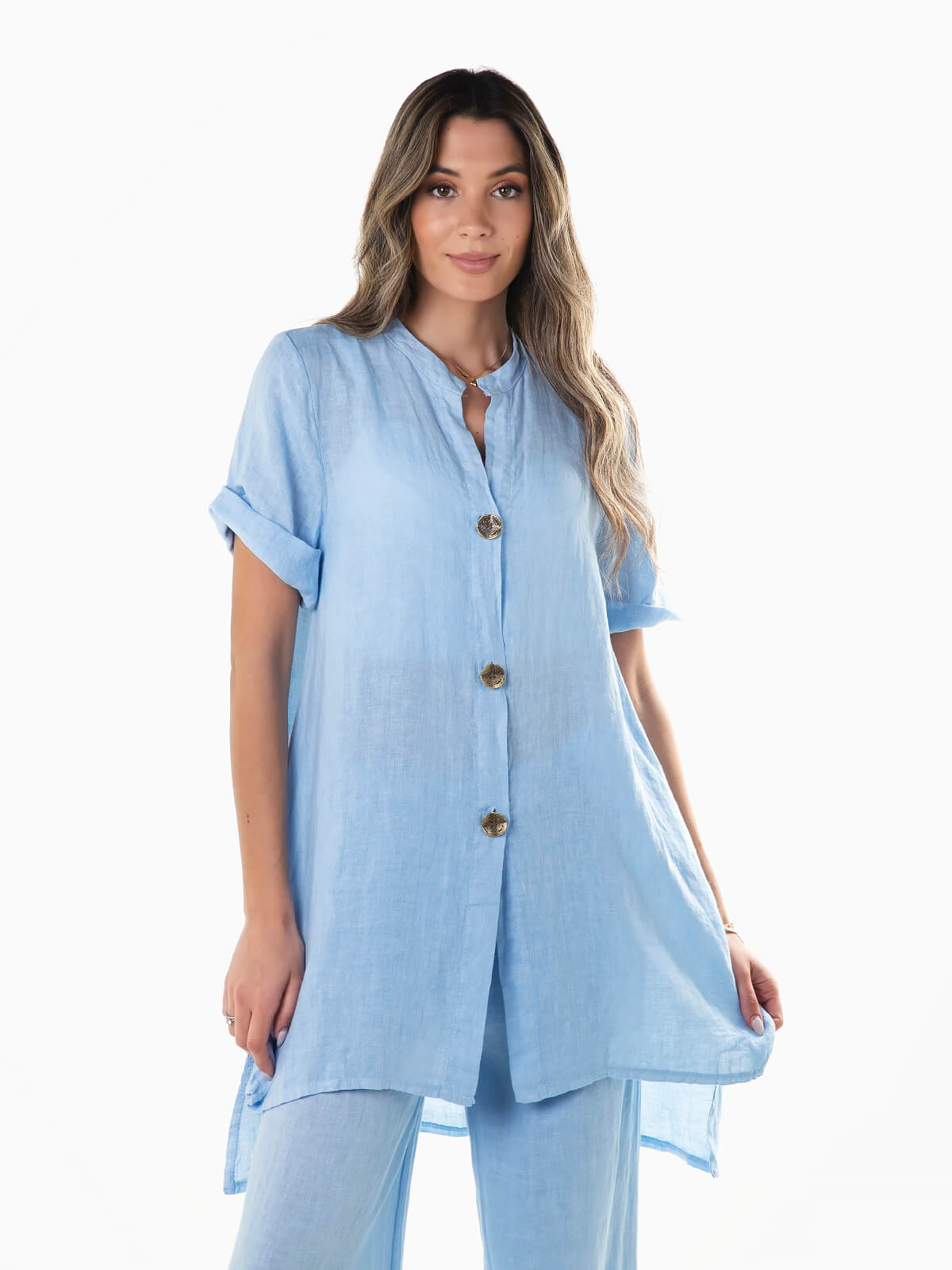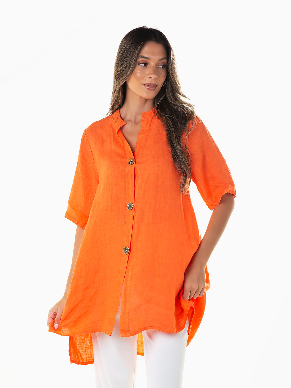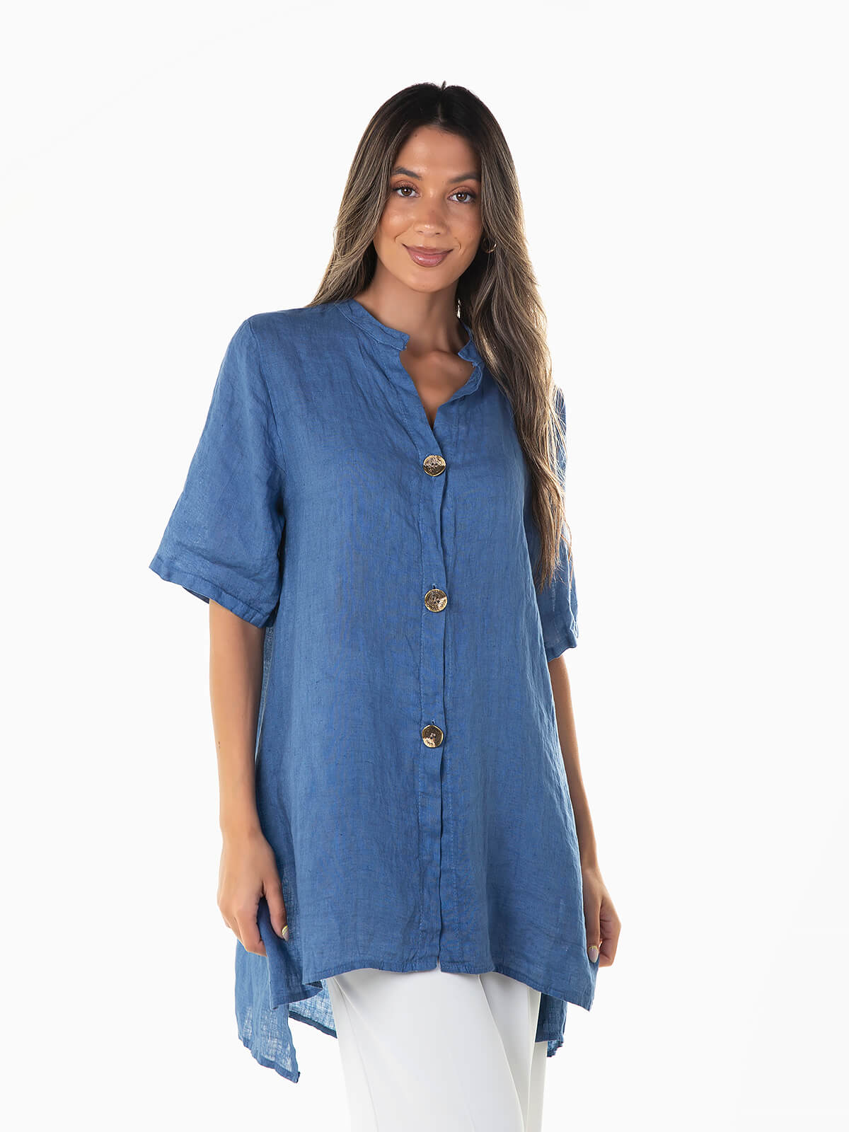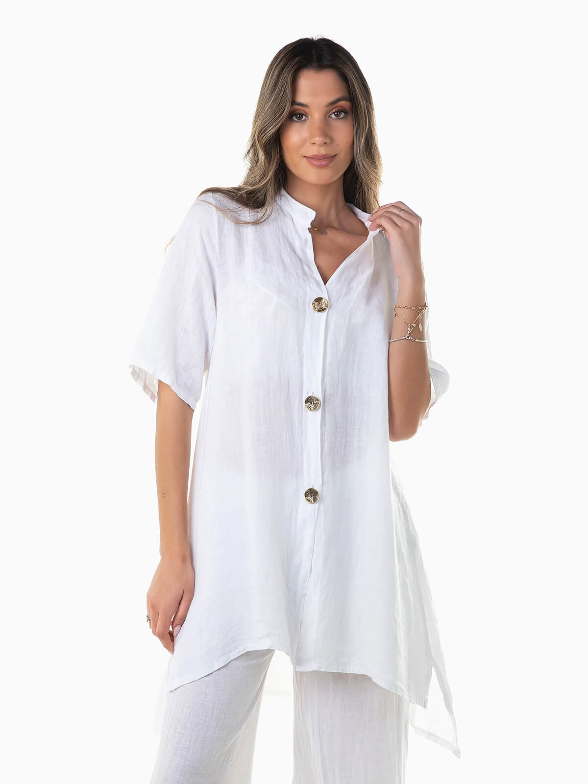 Túnica em tecido 100% linho, respirável e com durabilidade excecional. Túnica fluída com meia manga e cós arredondado mais comprido atrás. Aperto de botões dourados.