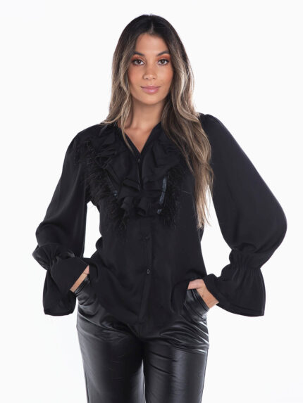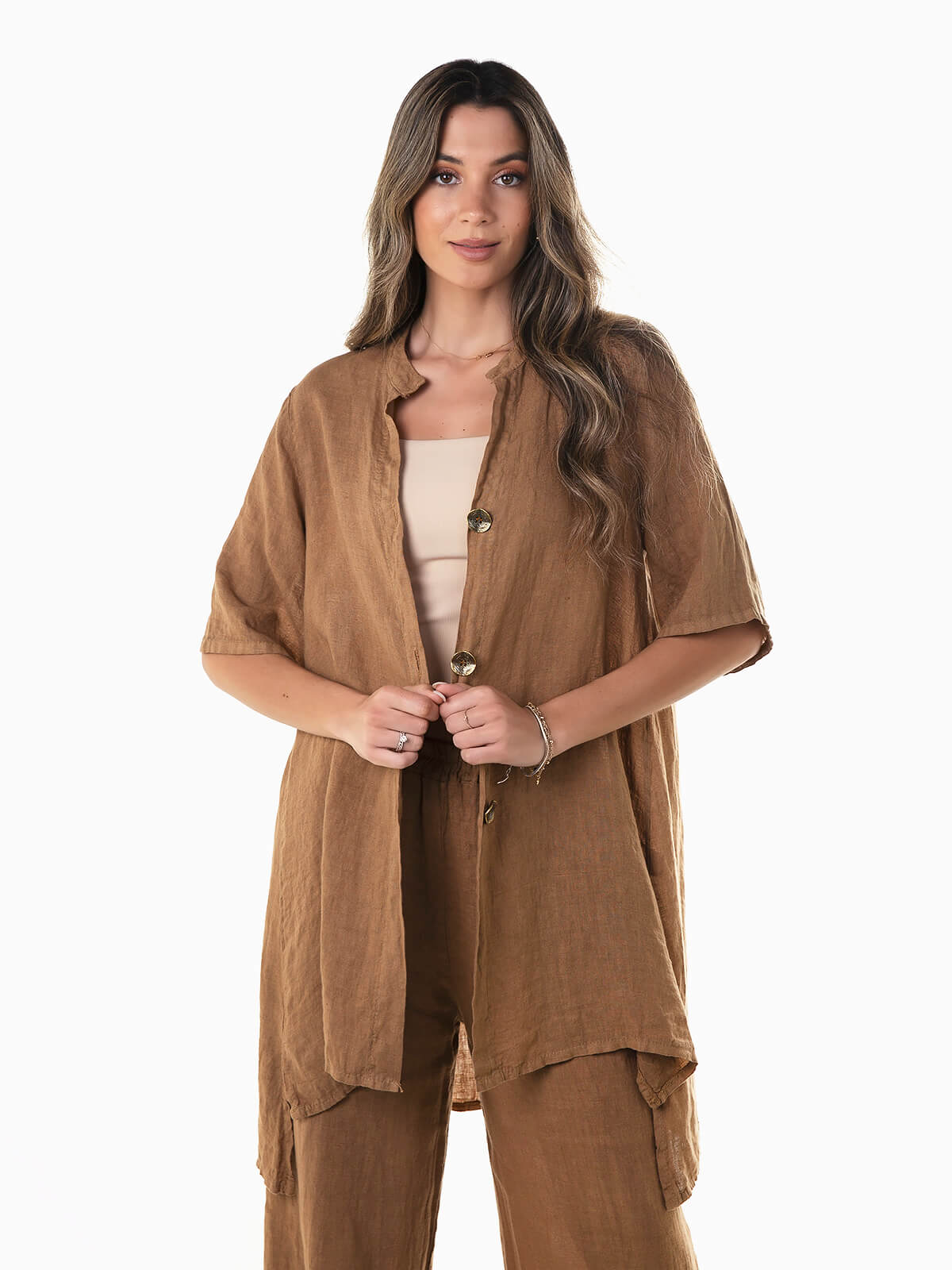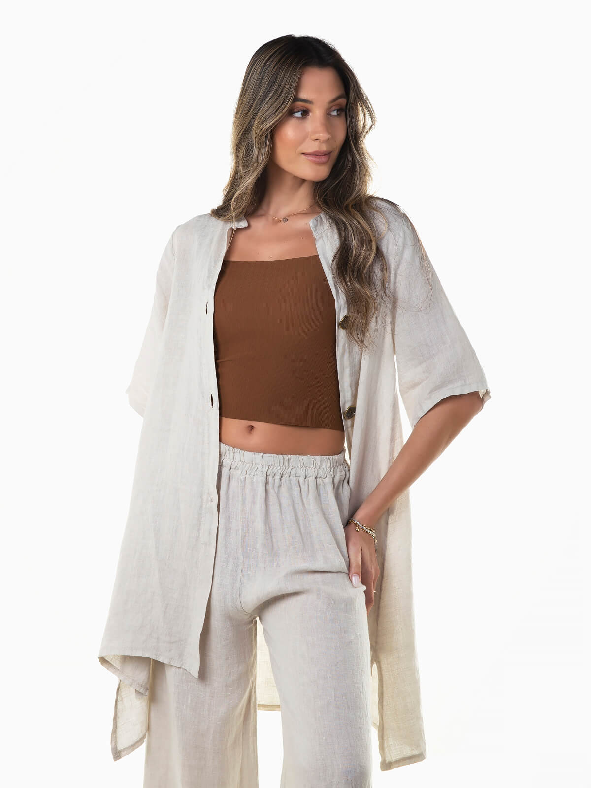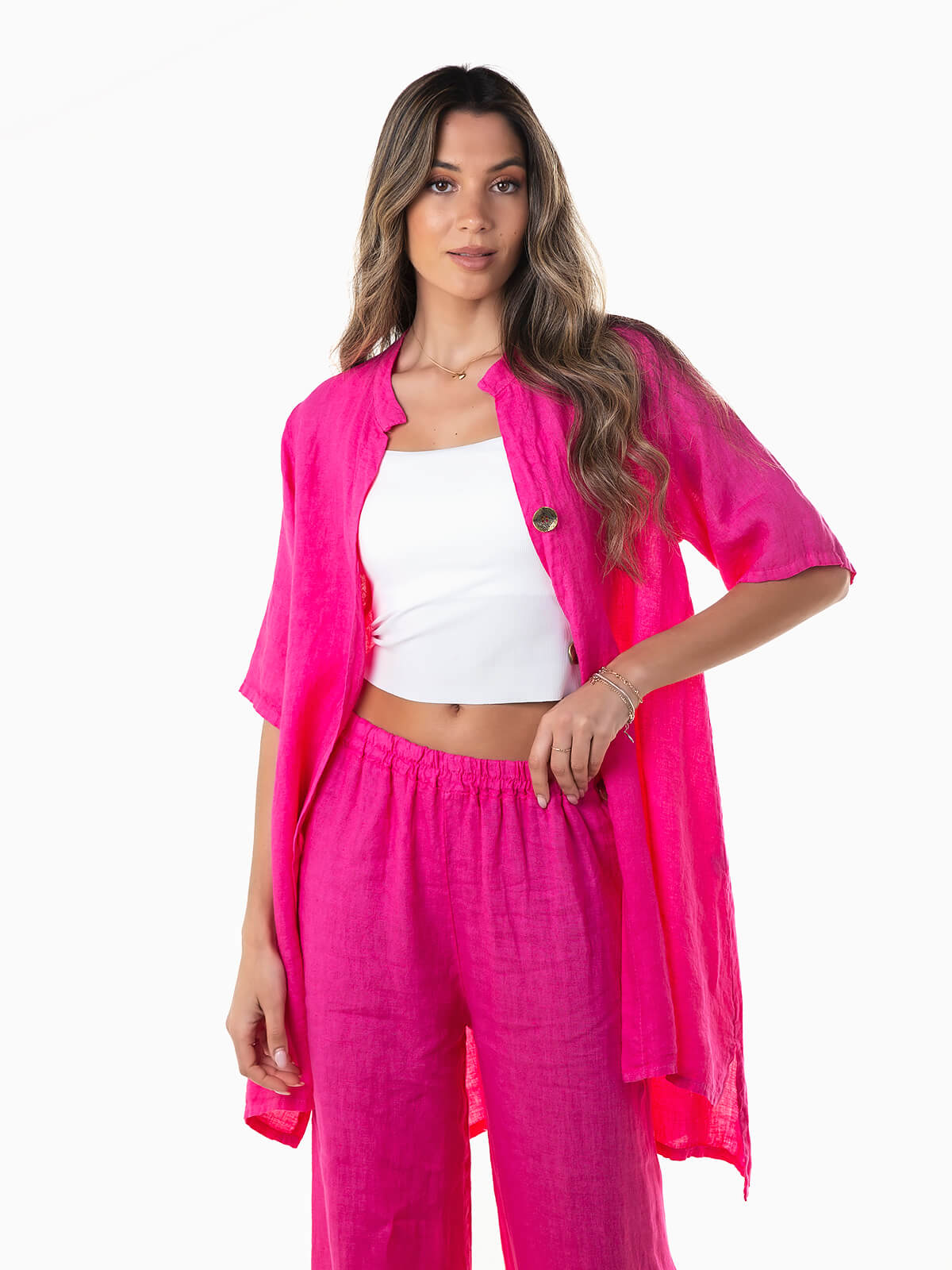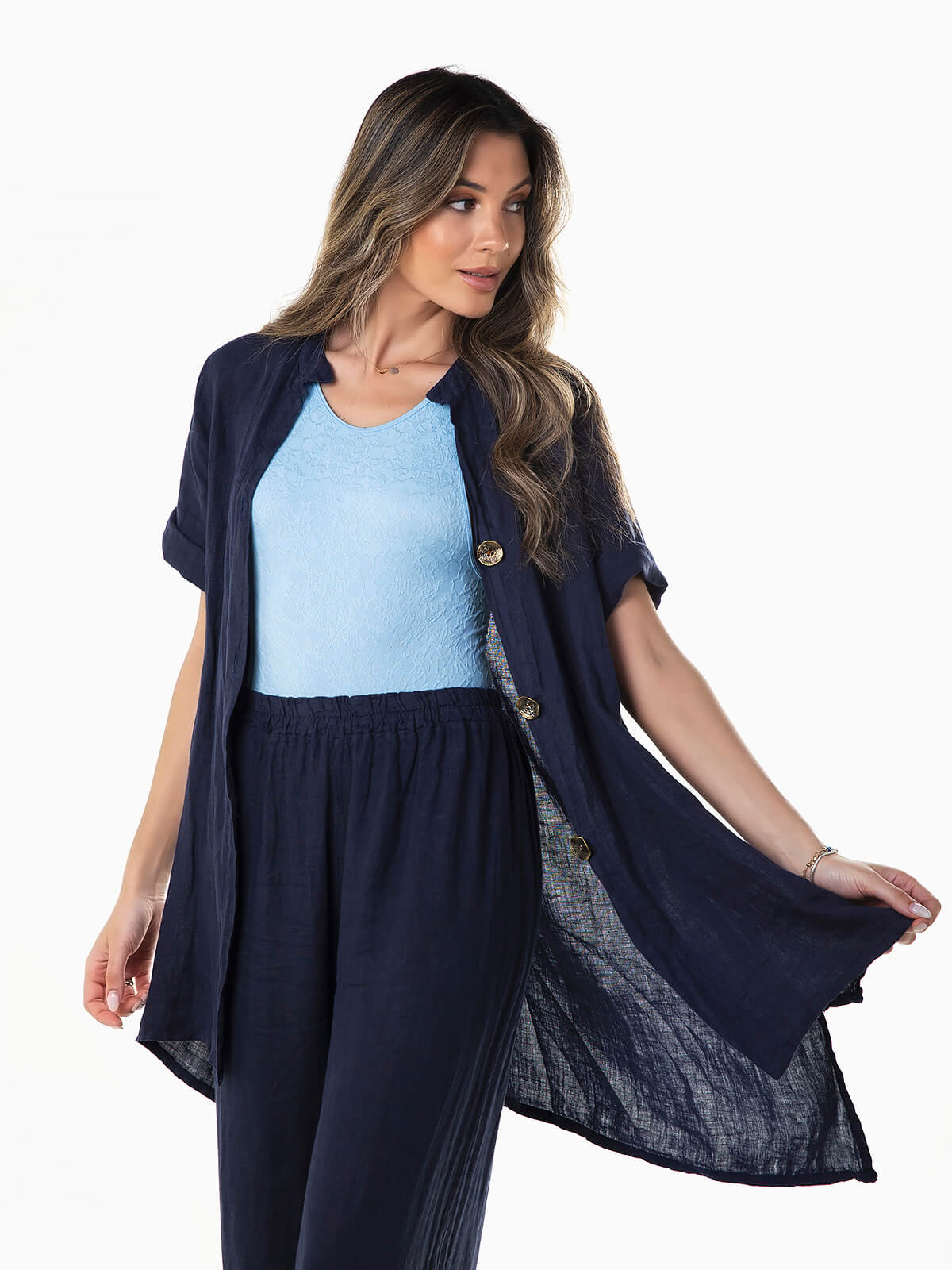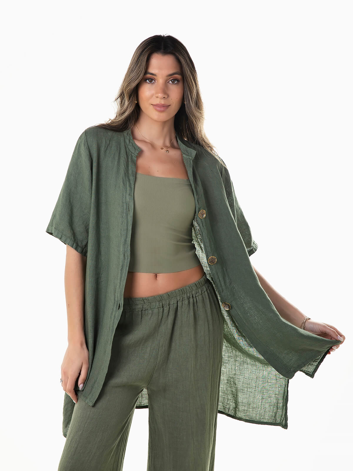 Túnica em tecido 100% linho, respirável e com durabilidade excecional. Túnica fluída com meia manga e cós arredondado mais comprido atrás. Aperto de botões dourados.