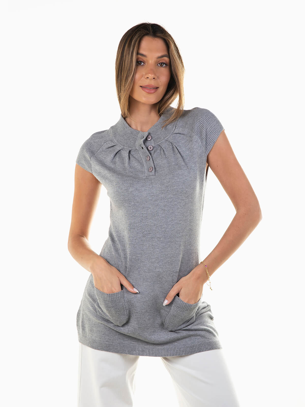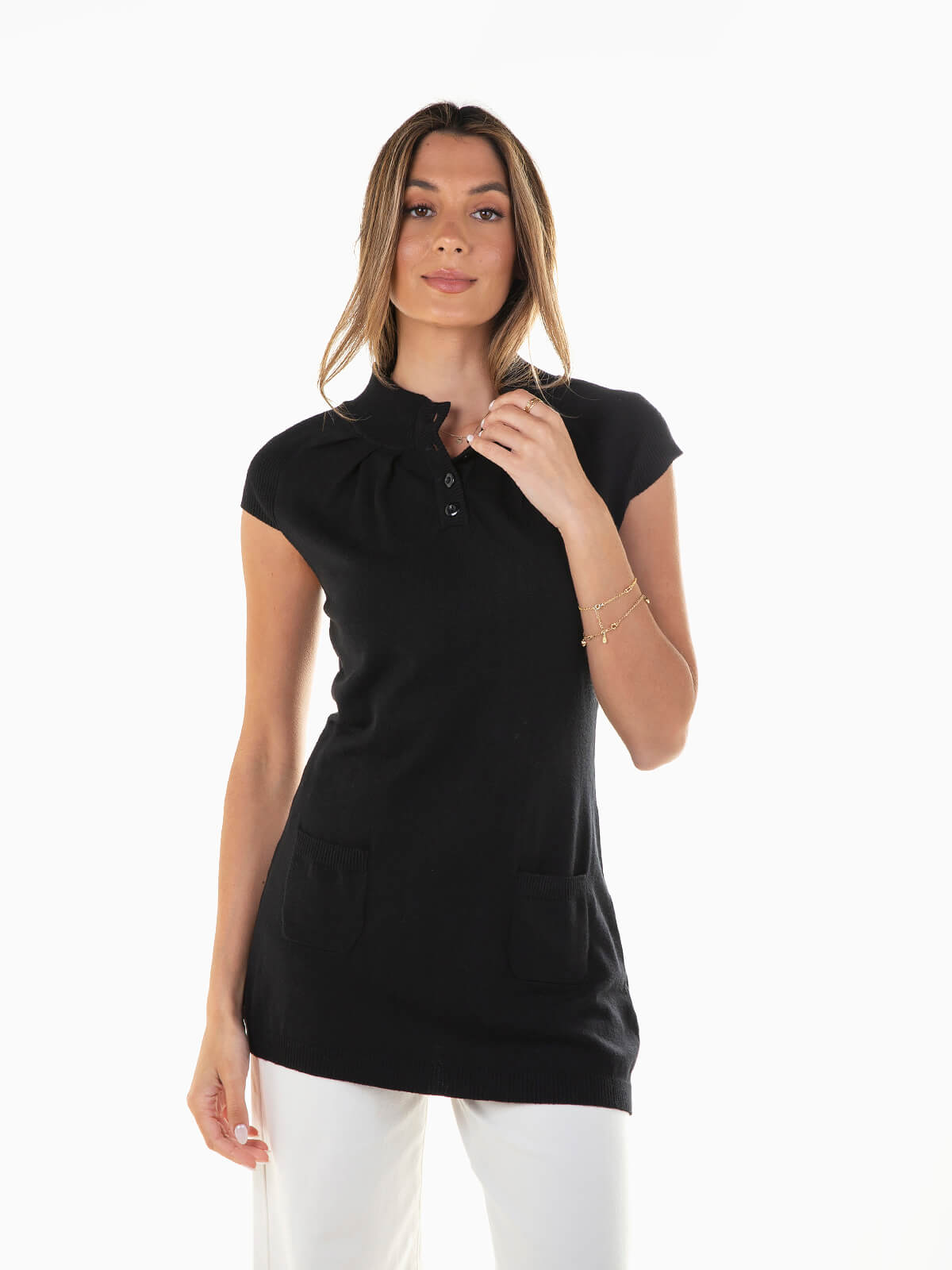 Túnica de malha com mini manga para mulher. Túnica com gola subida e aperto frontal de botões. Pormenor de pinças e 2 bolsos. Acabamentos canelados. Ideal para usar com calças ou leggings, num look elegante e descontraído.
