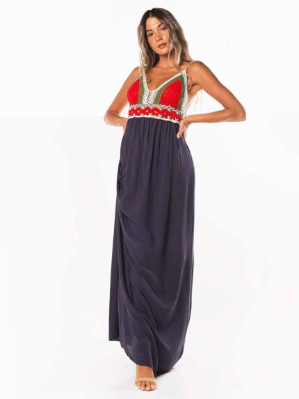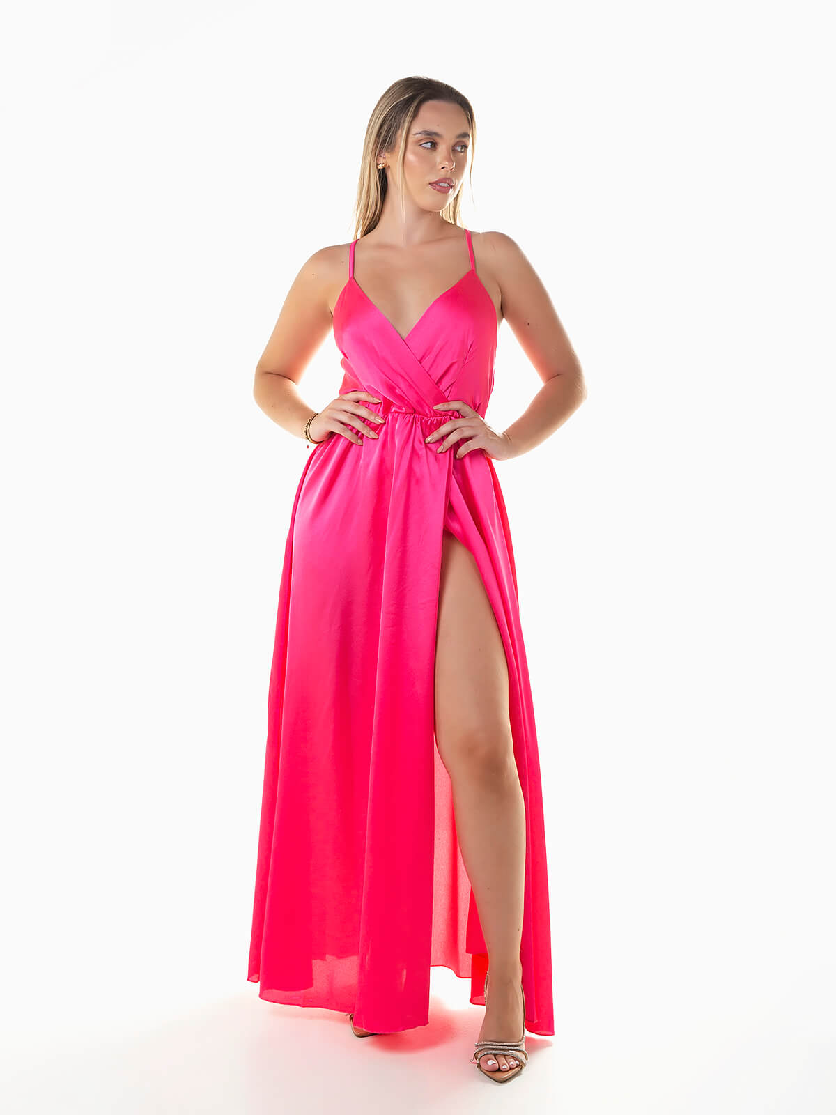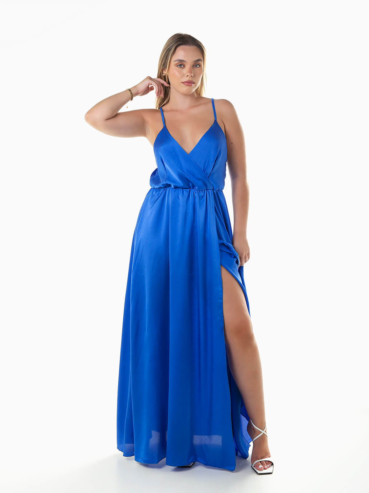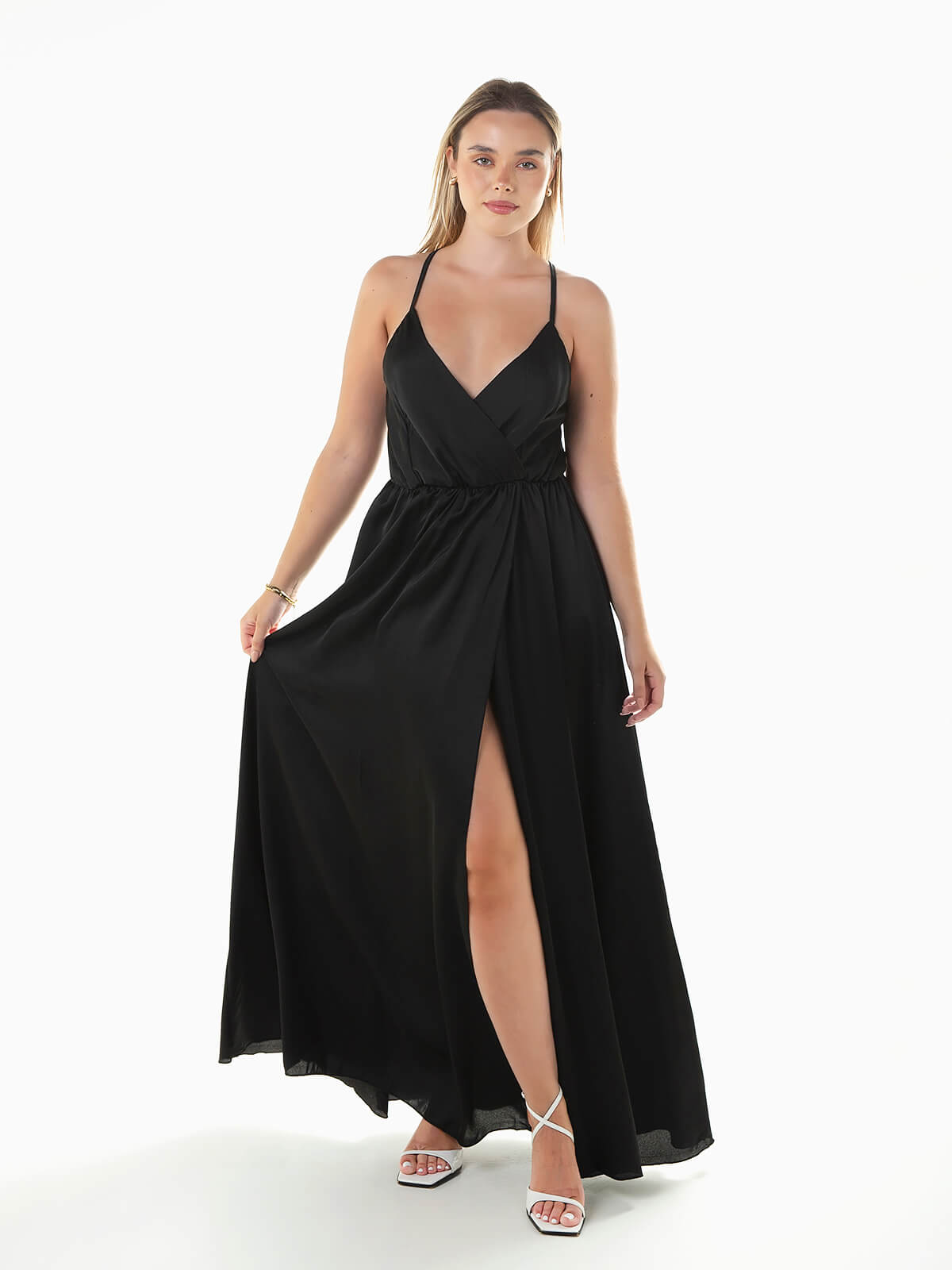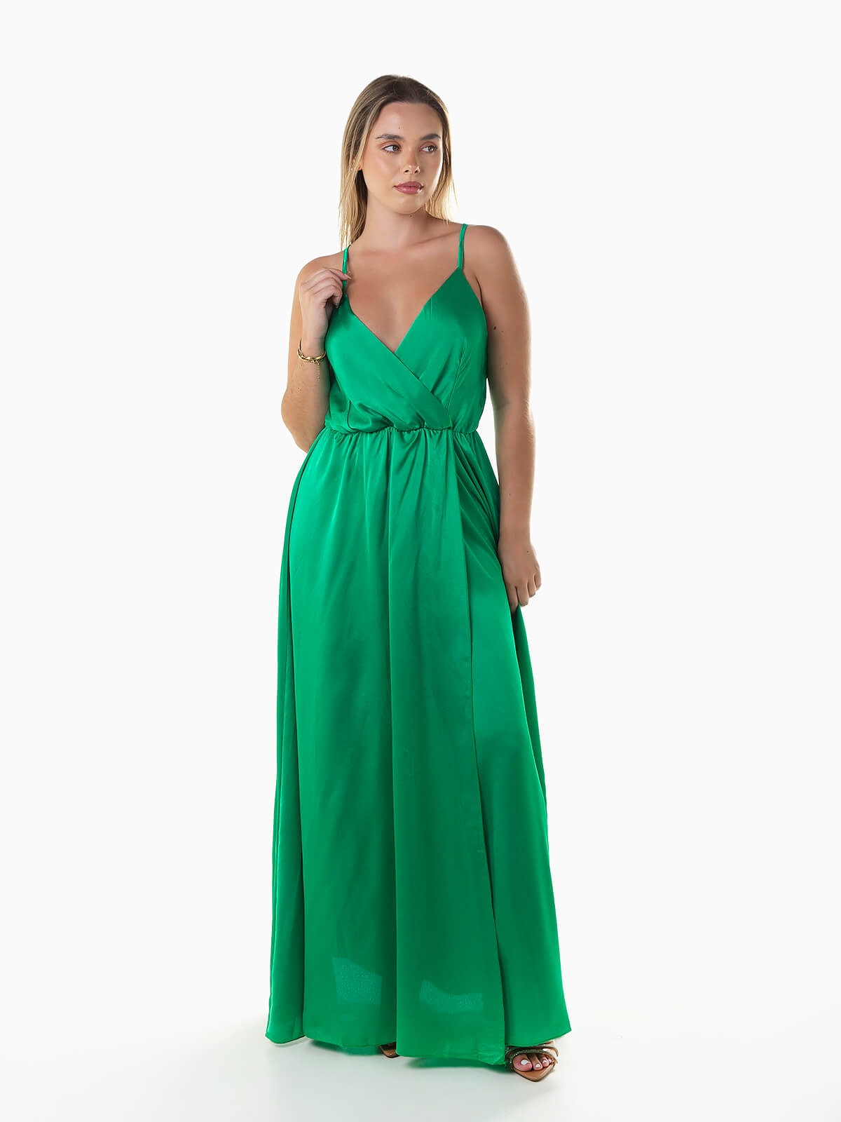 Vestido de alças finas reguláveis cruzadas na parte posterior. Vestido comprido acetinado com decote cruzado e elástico na cintura. Abertura à frente.