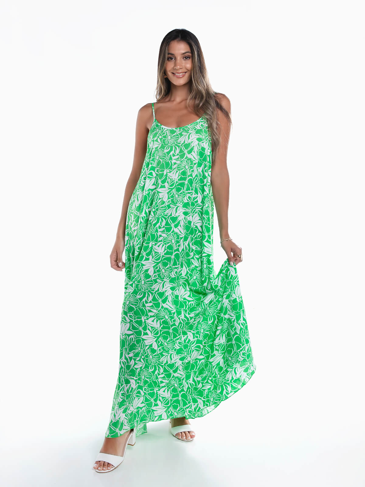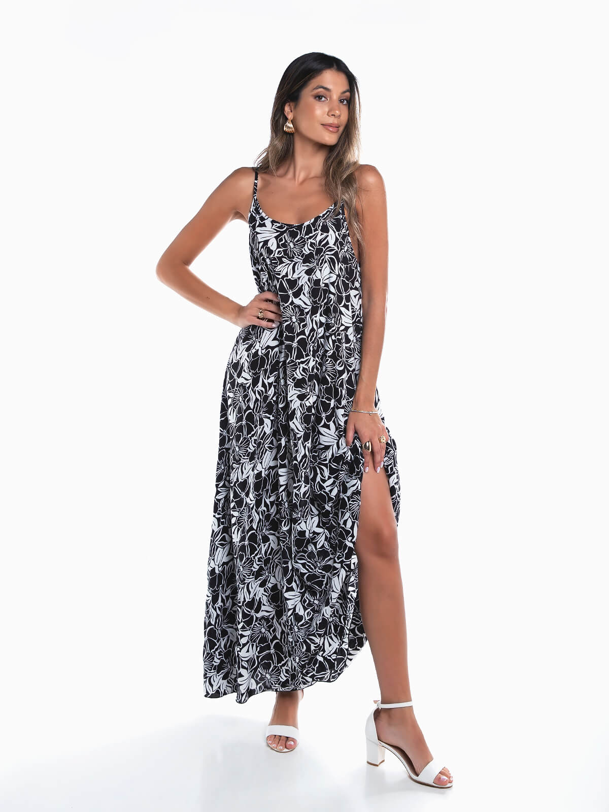 Vestido comprido estampado floral com alças finas reguláveis. Vestido fluído em tecido 100% algodão com decote redondo.