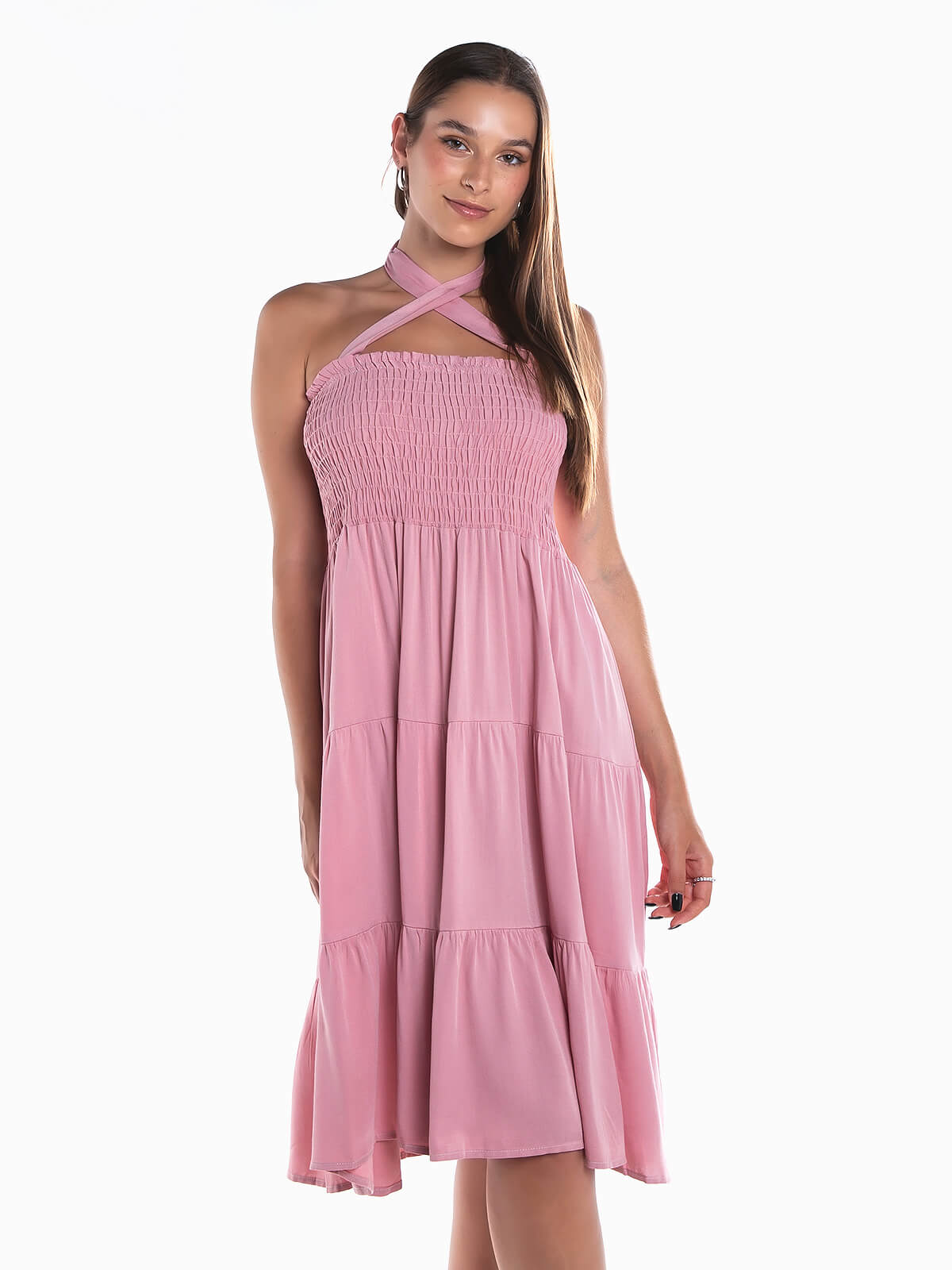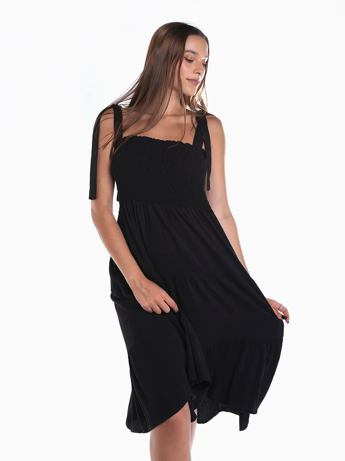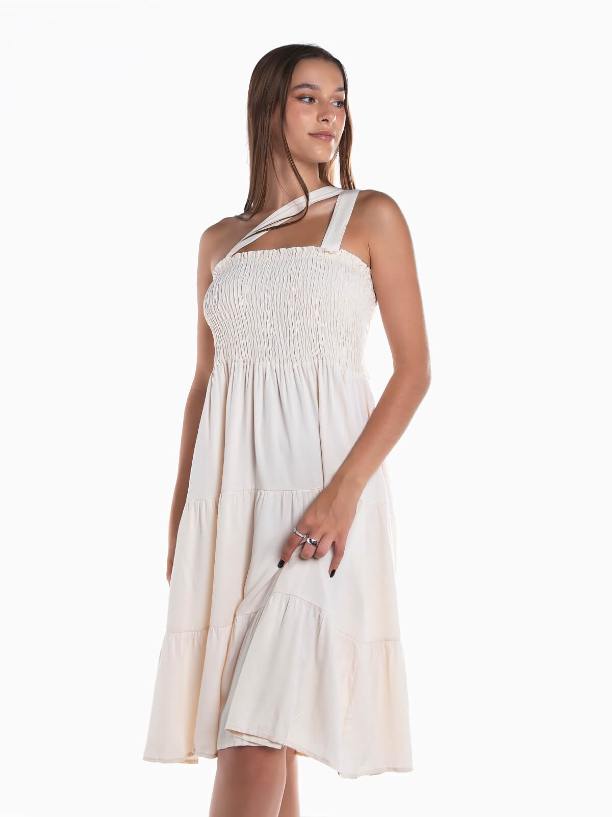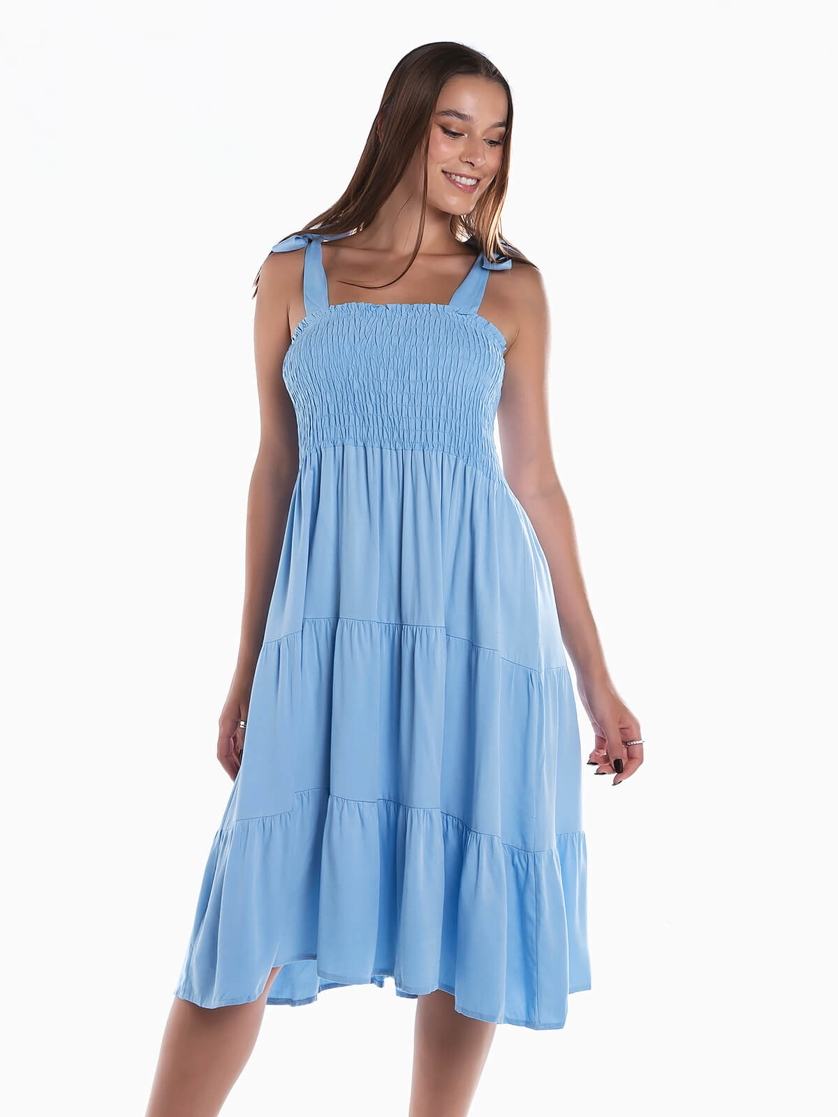 Vestido de alças em tecido para laço e peito em franzido smock. Vestido curto com encaixe de folhos. Decote quadrado.