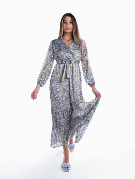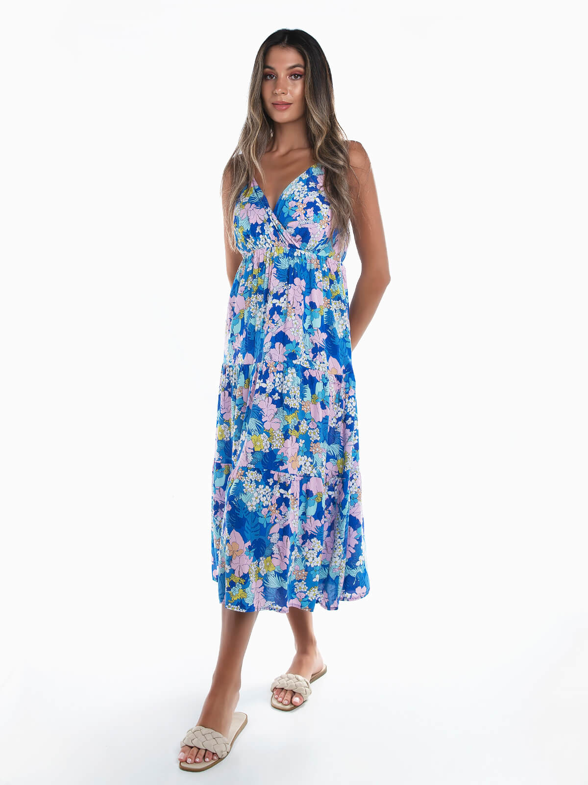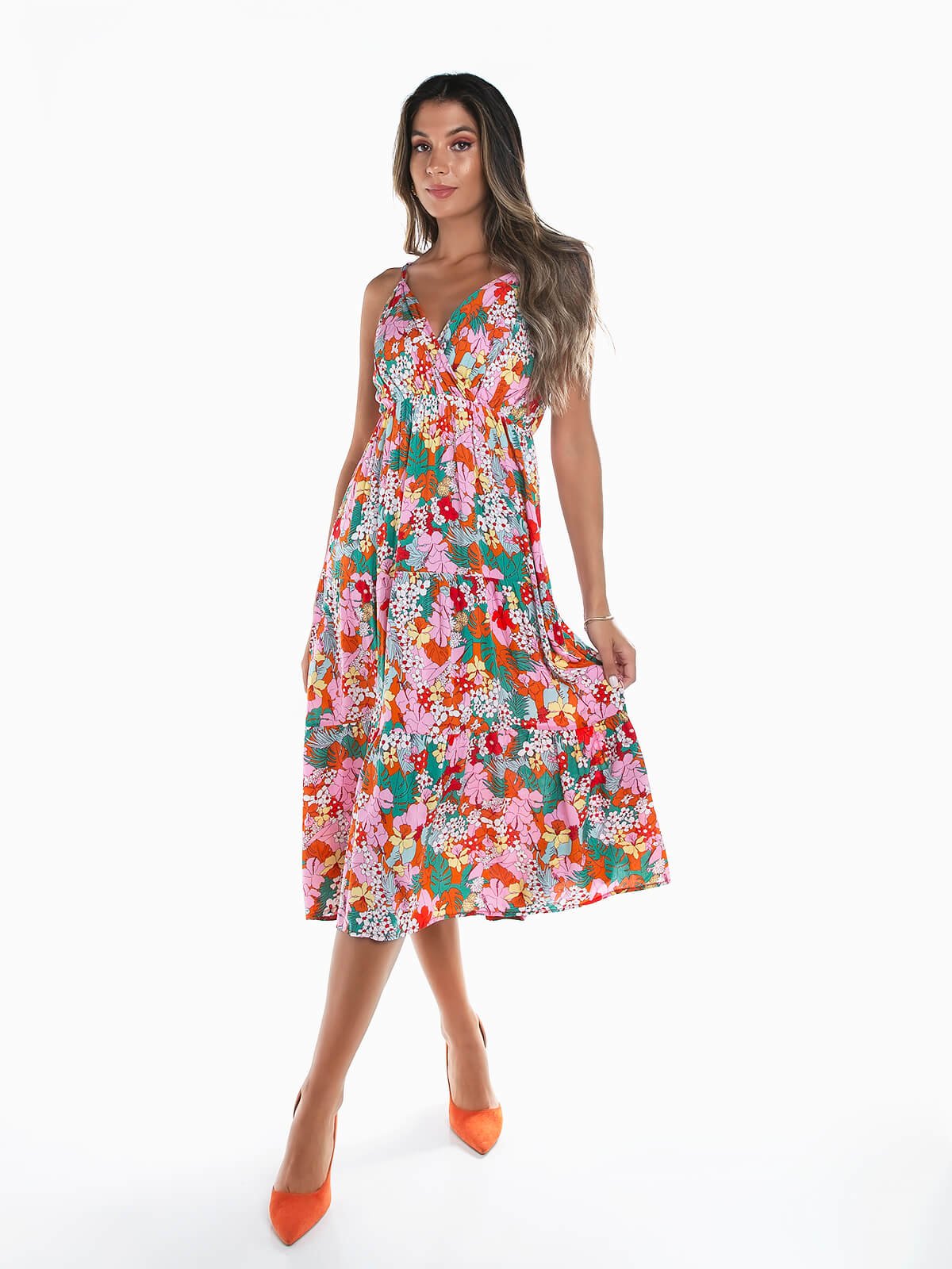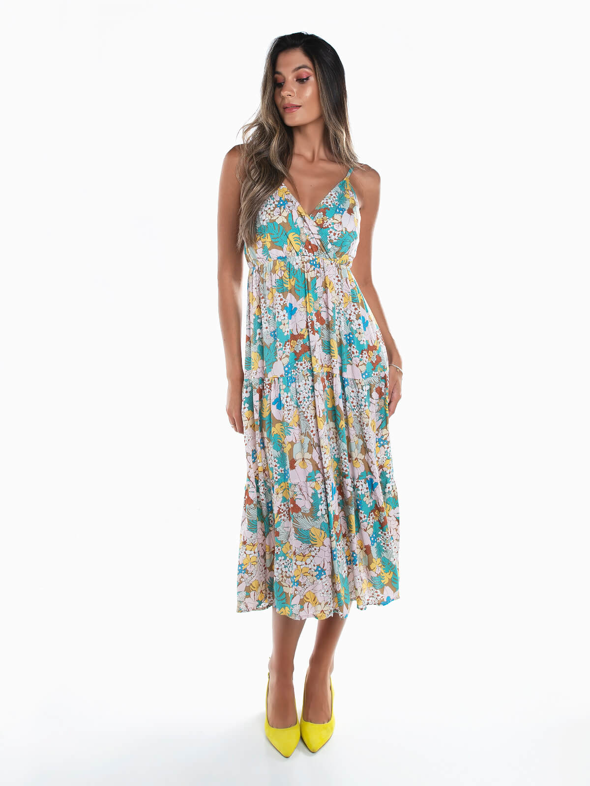 Vestido midi de alças reguláveis com estampado floral. Vestido fluído com encaixe de folhos e cintura elástica. Decote cruzado.