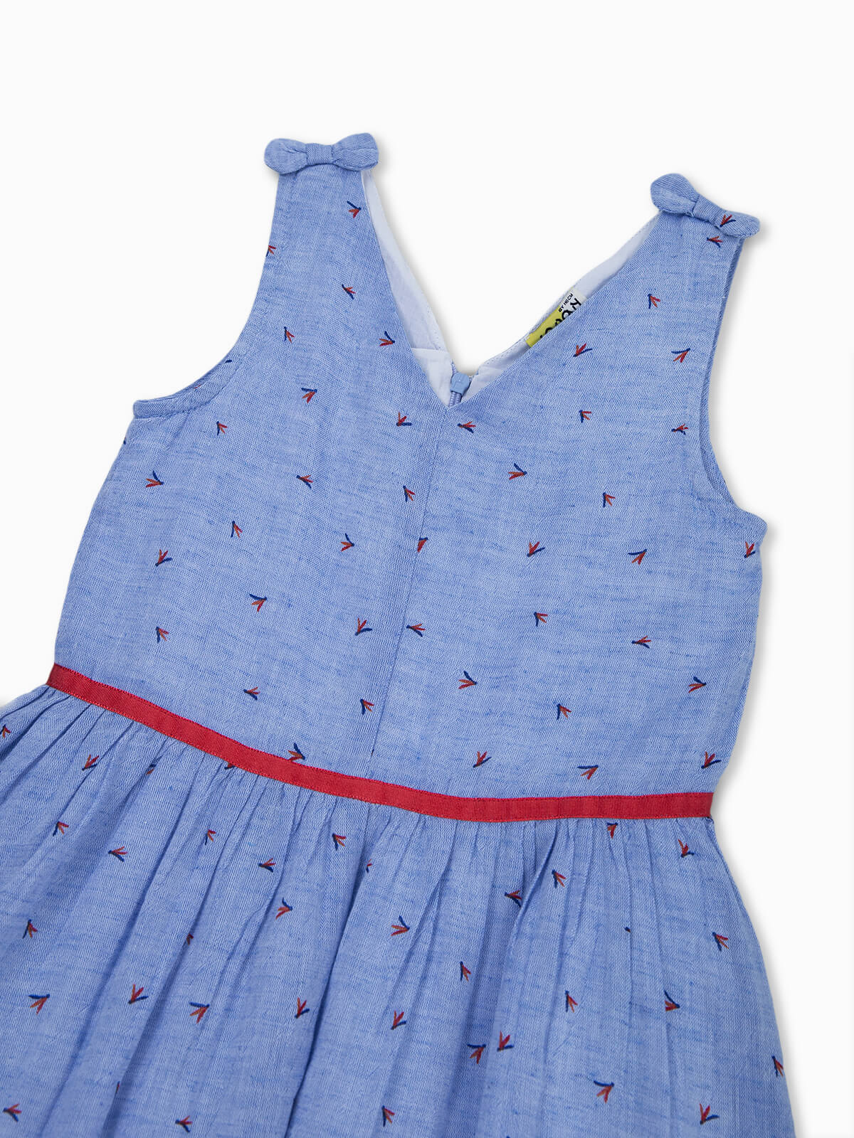 Vestido azul em tecido de linho e algodão para menina. Vestido de alças com pormenor de laços e interior forrado. Decote em bico. Parte posterior com aperto de fecho zíper.