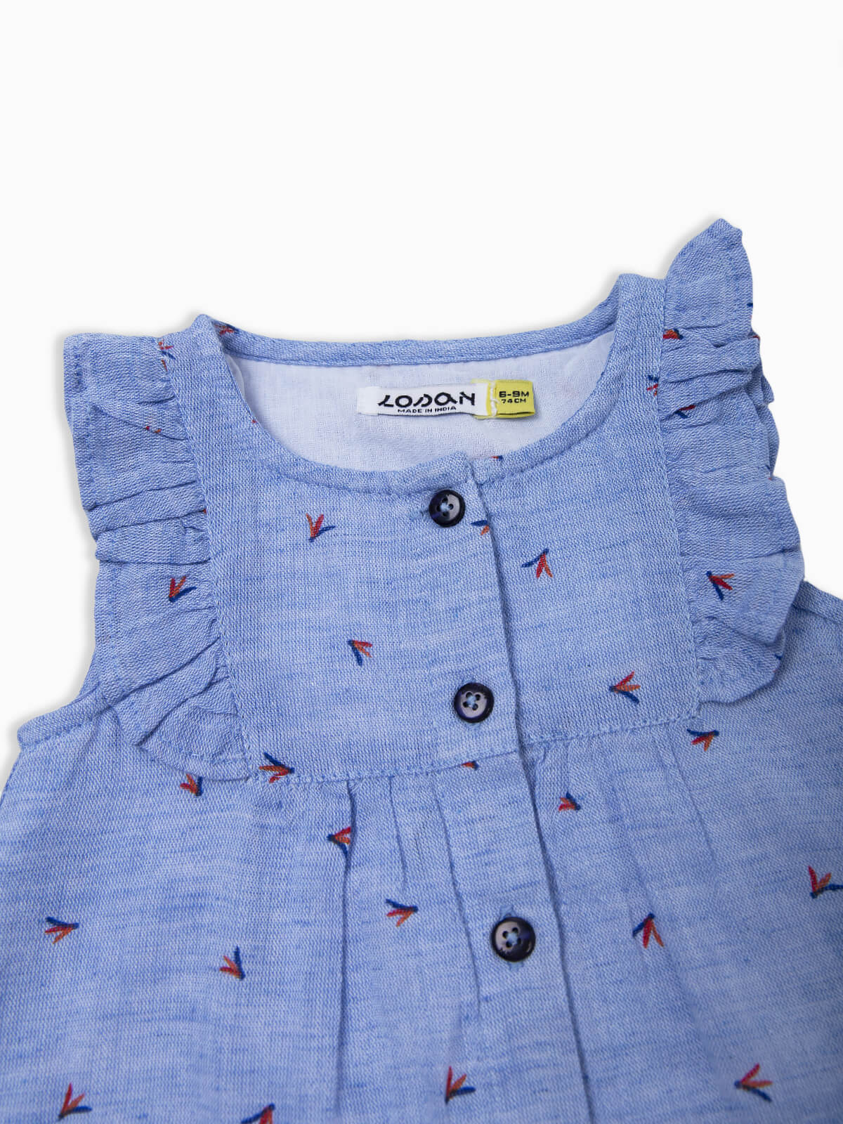Vestido azul em tecido com mistura de linho. Vestido sem mangas com encaixe de folho na cava. Interior forrado. Decote redondo e aperto frontal de botões.