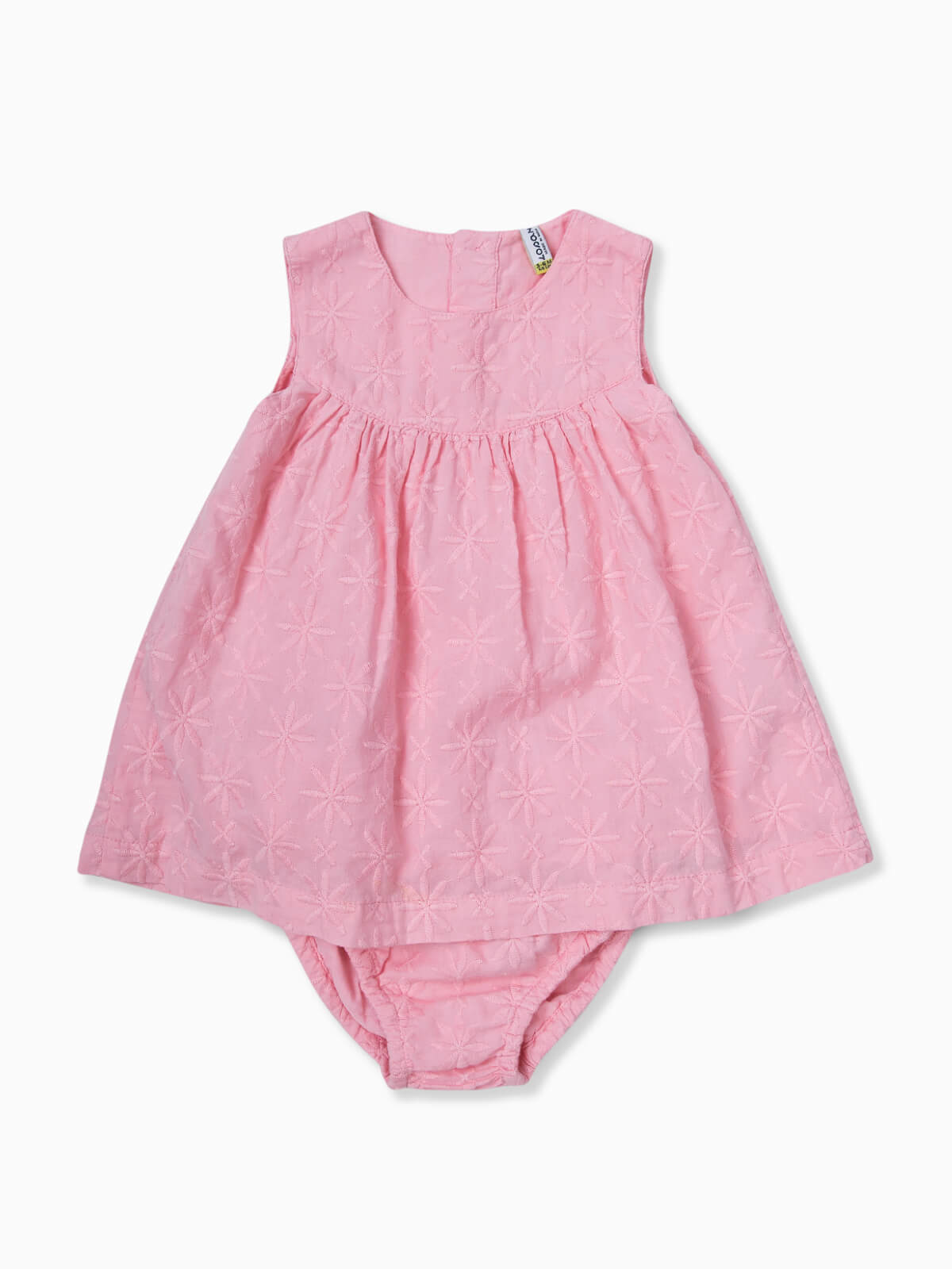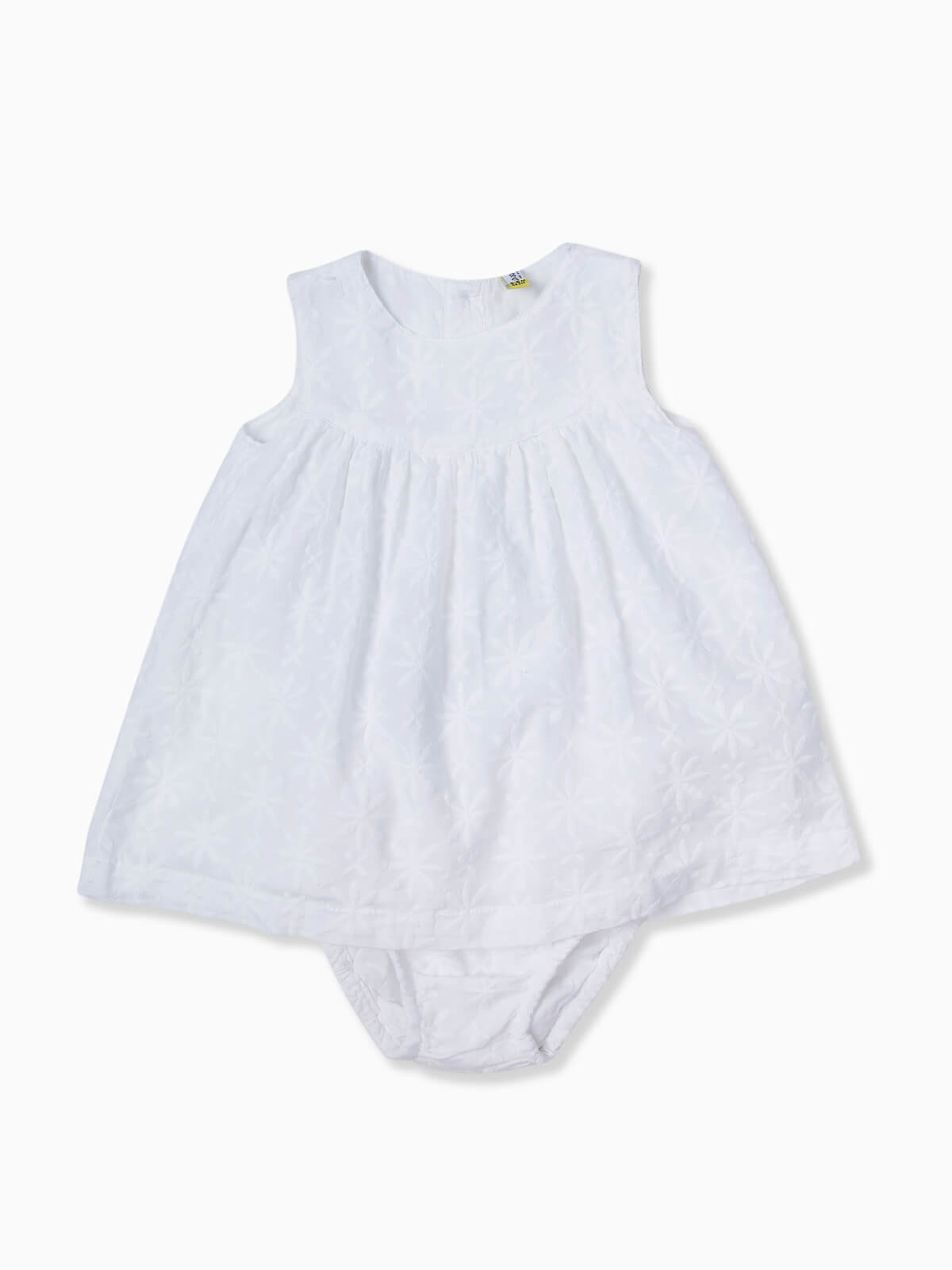 Vestido com interior forrado e bordado de flores à cor. Vestido sem mangas com decote redondo. Aperto posterior de botões. Tapa-fralda com cintura elástica.