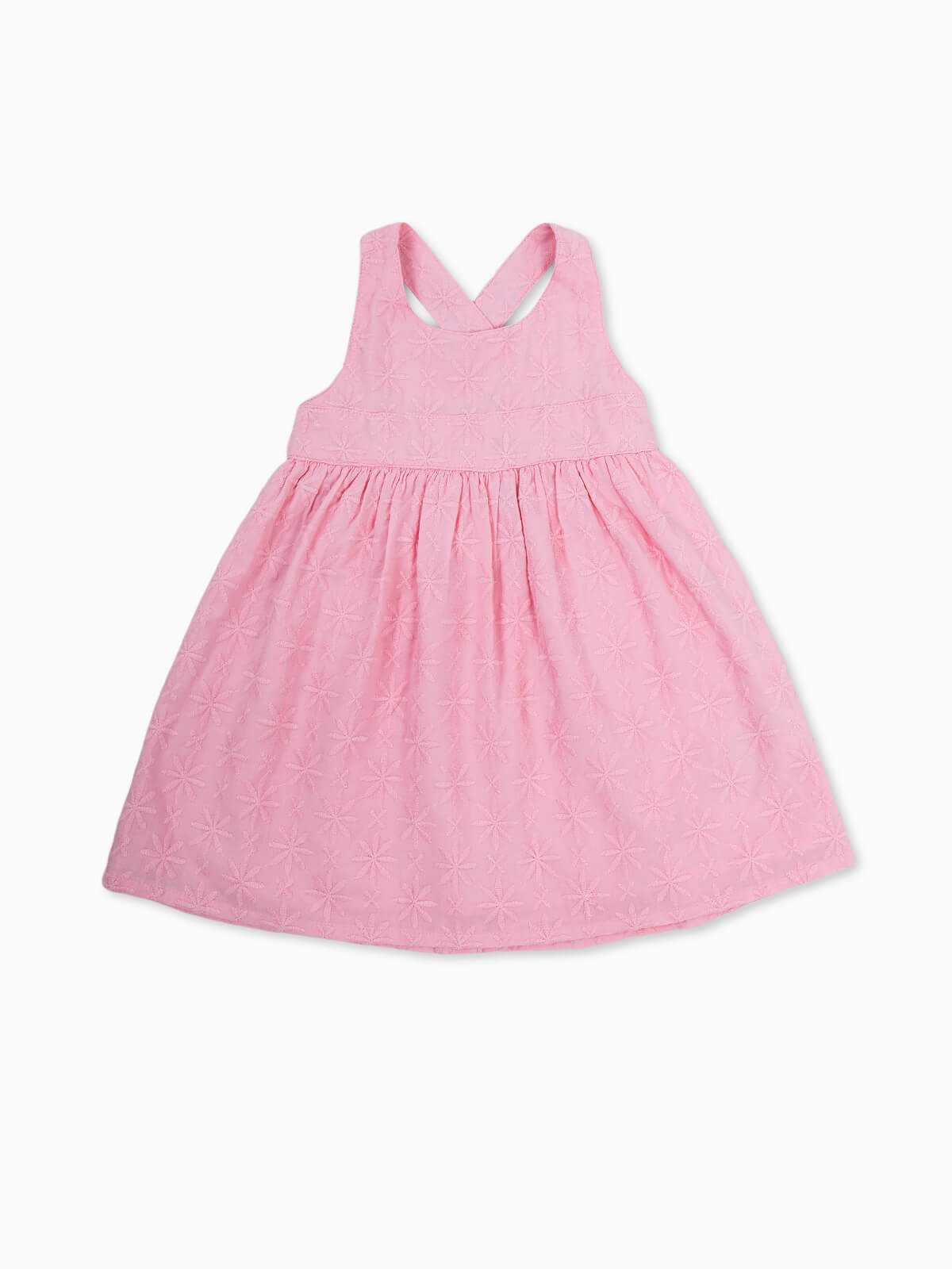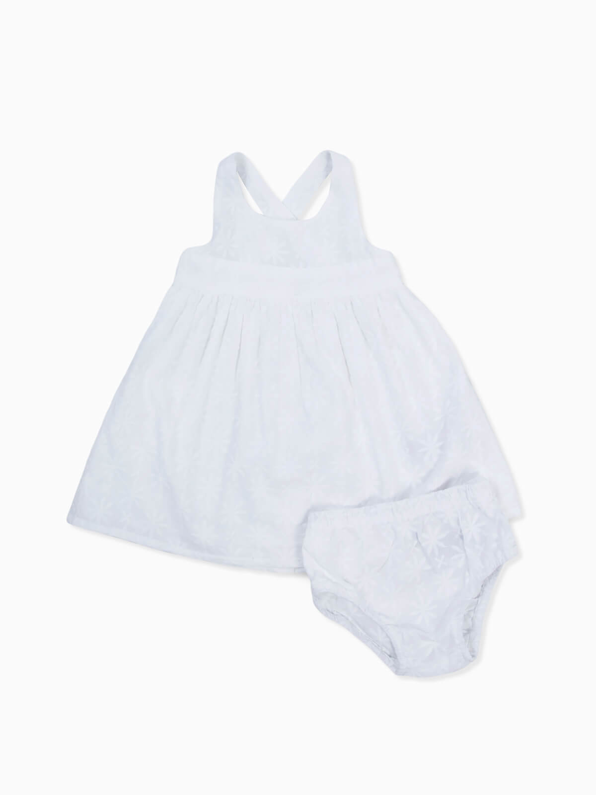 Vestido com bordado de flores à cor e interior forrado. Vestido de alças cruzadas atrás e decote redondo. Aperto posterior de botões. Tapa-fralda com cintura elástica.