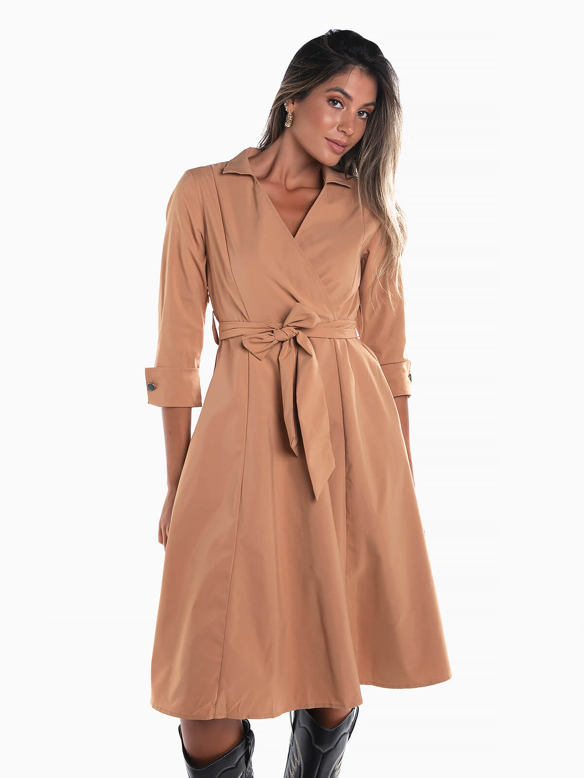 Vestido camel curto em tecido estilo gabardine. Vestido manga 3/4 e corte evasé. Decote cruzado e abas. Cinto para ajustar. 2 bolsos e aperto lateral de fecho éclair oculto na costura.