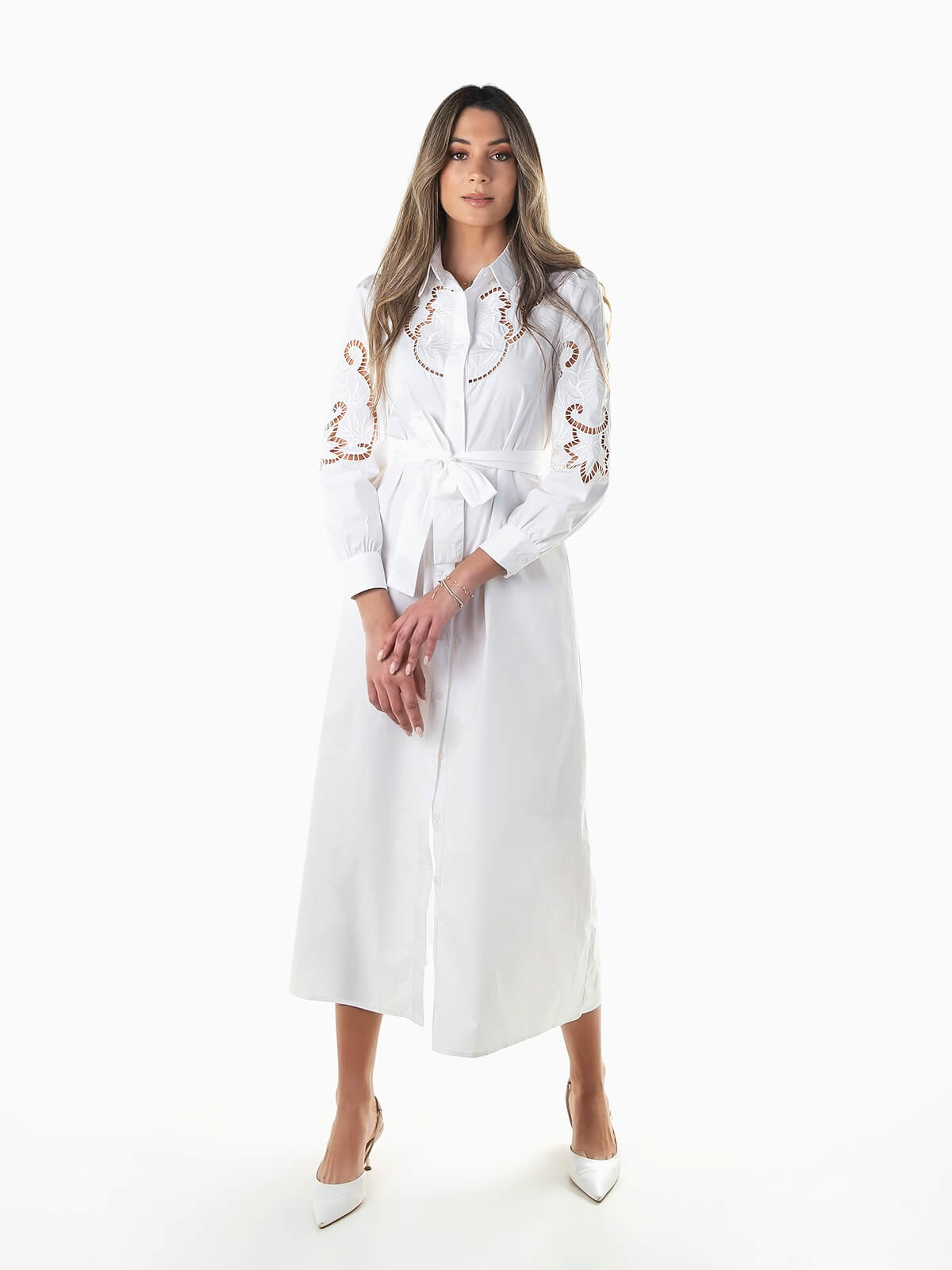 Vestido camiseiro com bordado inglês para senhora. Vestido comprido de manga comprida com punhos abotoados. Gola abas. Cinto removível para ajustar. Aperto frontal de botões.