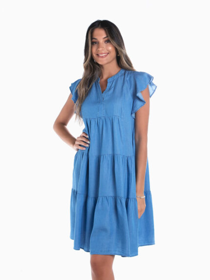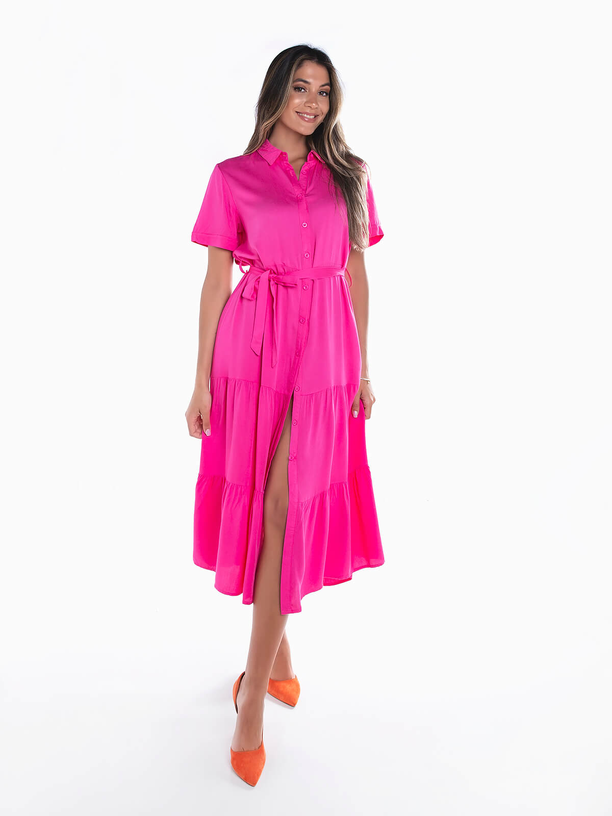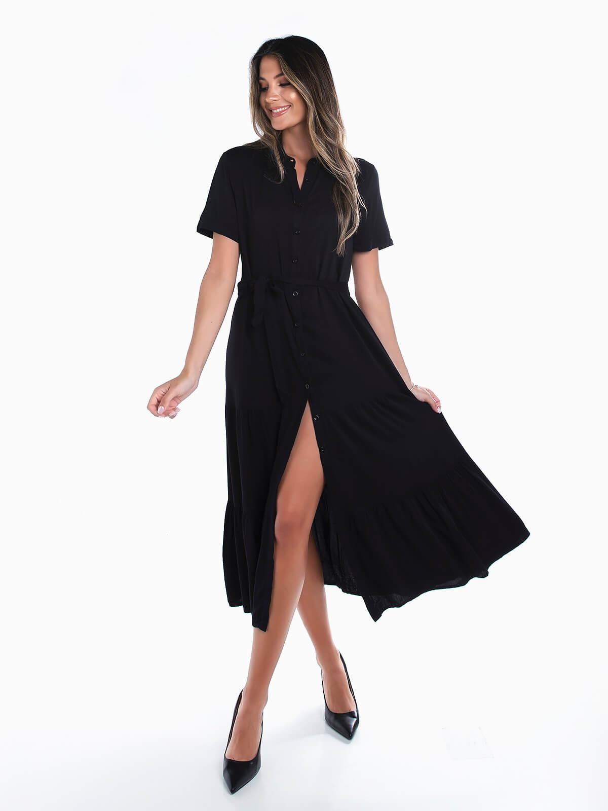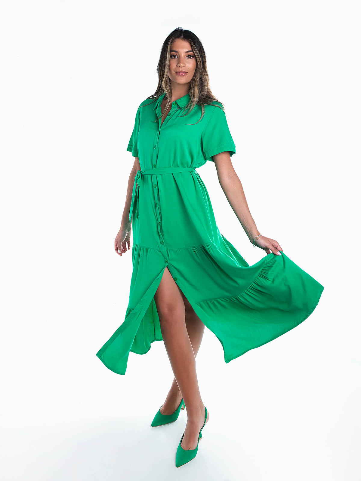 Vestido camiseiro comprido com cinto no mesmo tecido para ajustar. Vestido de manga curta com encaixe de folhos e gola de abas. Aperto frontal de botões.