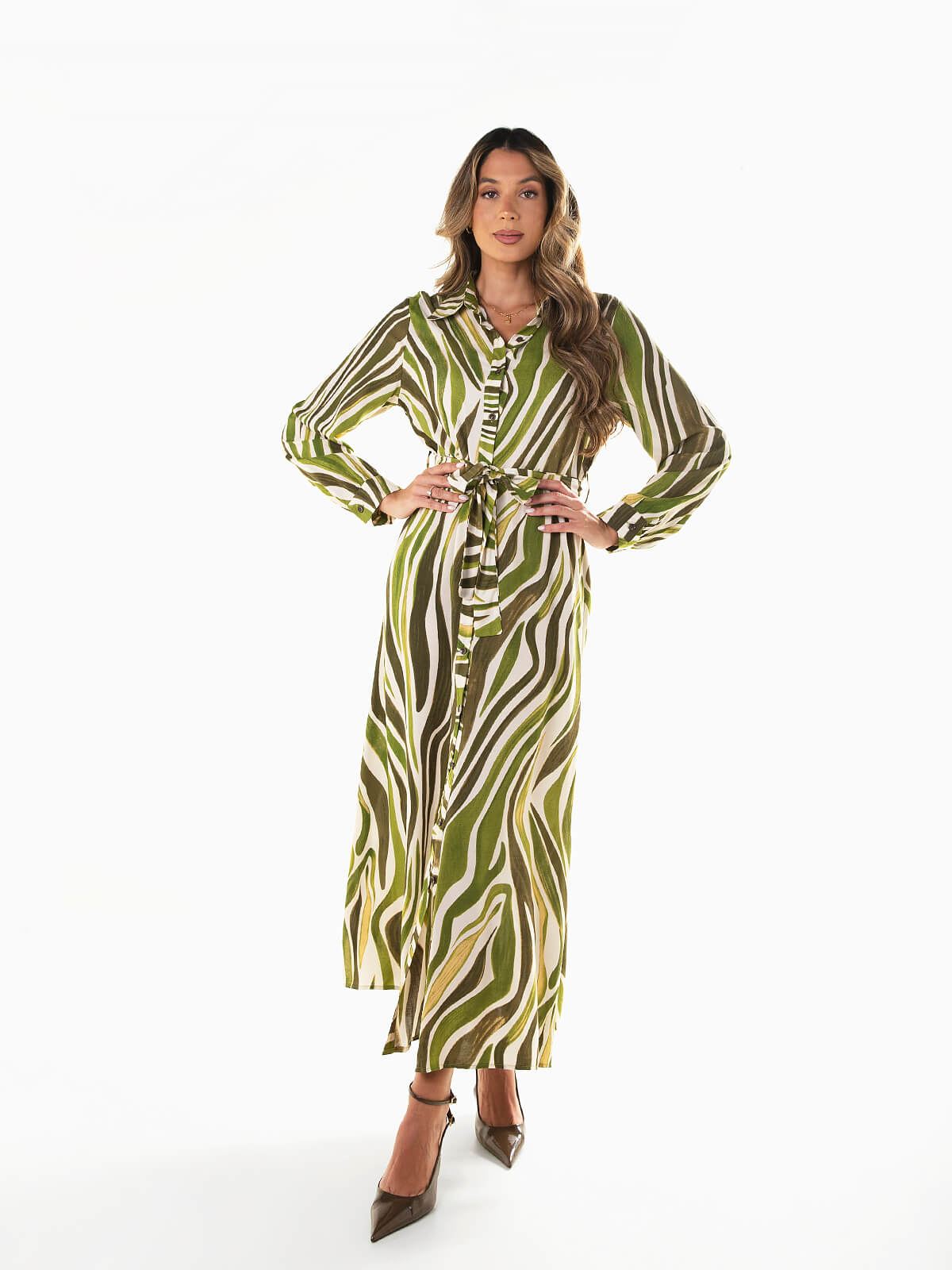 Vestido camiseiro comprido com padrão abstracto. Modelo fluido com gola de abas, manga comprida e cinto do mesmo tecido. Aperto frontal de botões. Um vestido elegante e moderno, perfeito para qualquer ocasião.
