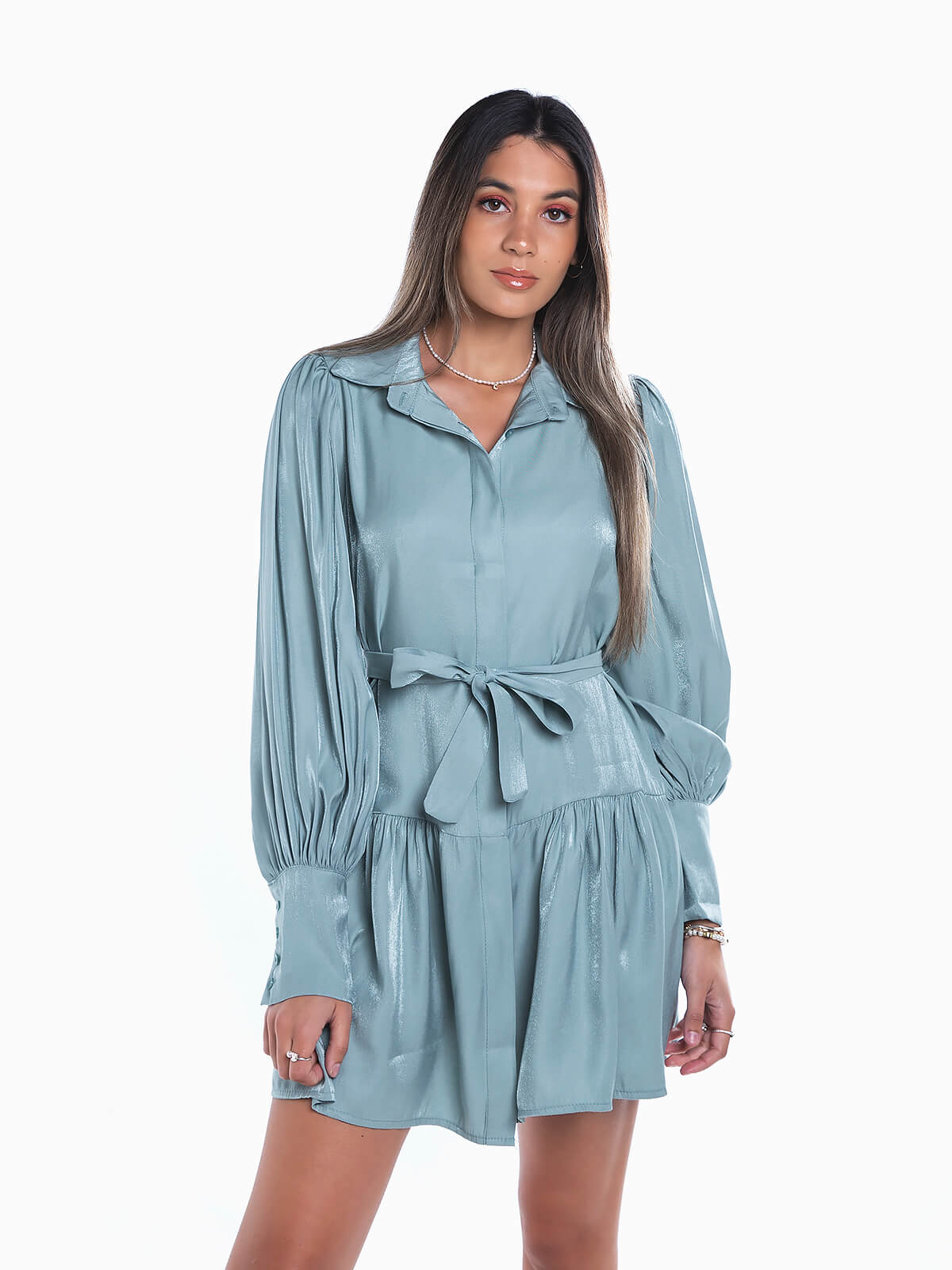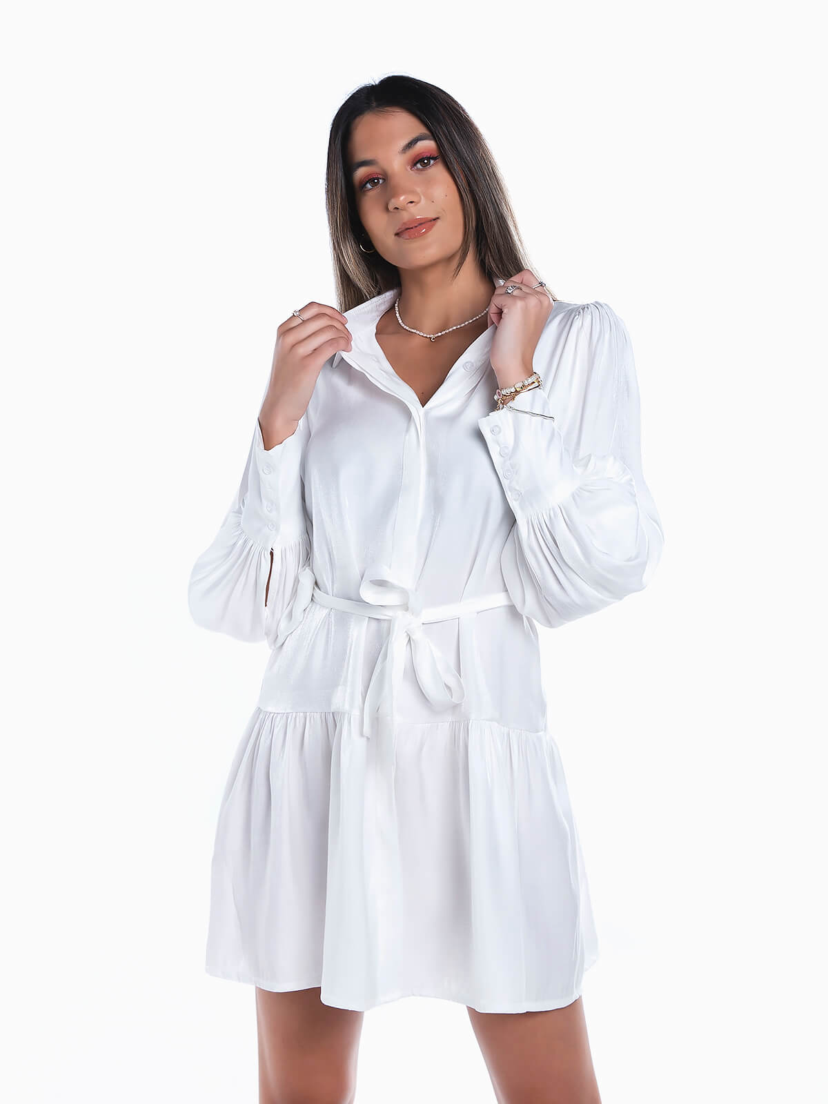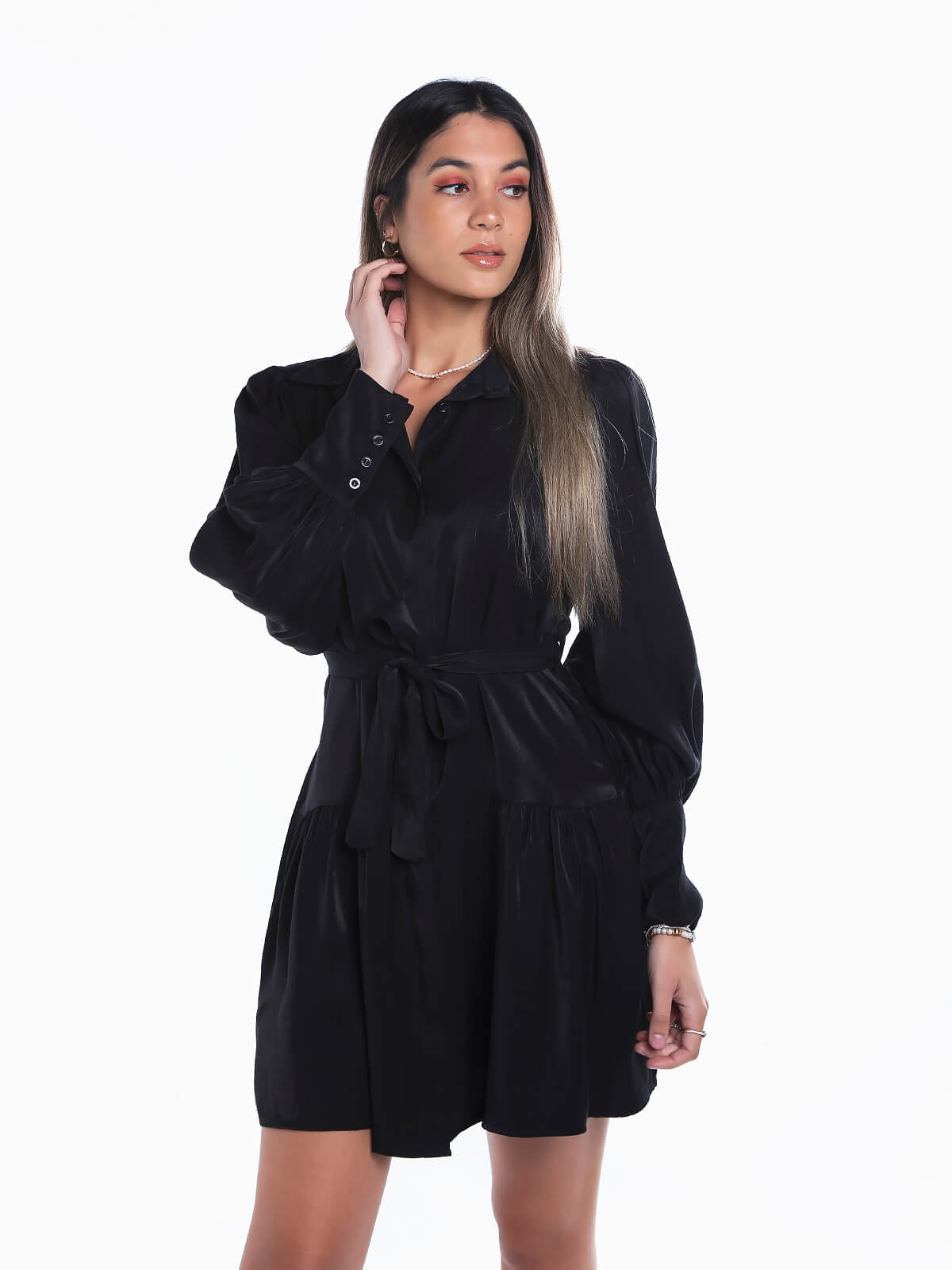 Vestido estilo camiseiro curto com folho no cós. Vestido em tecido brilhante. Punhos abotoados. Mangas balão. Aperto de botões. Gola clássica.