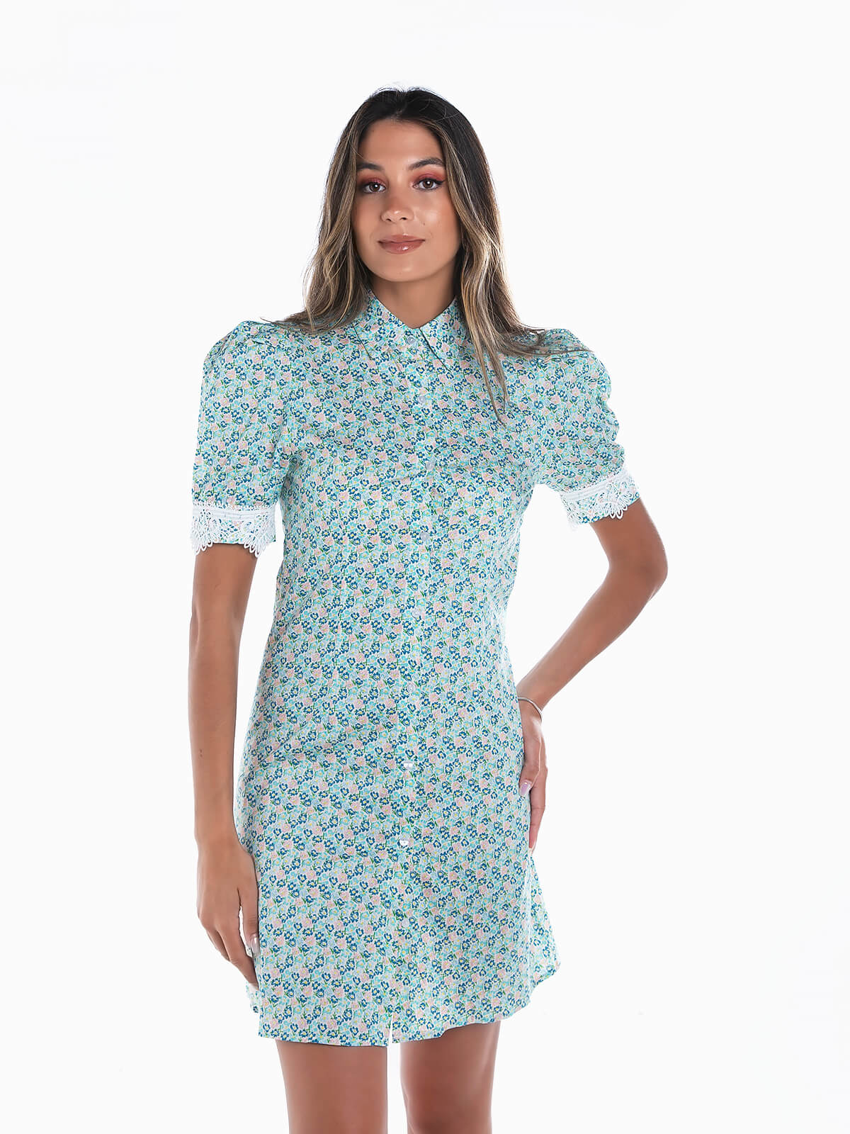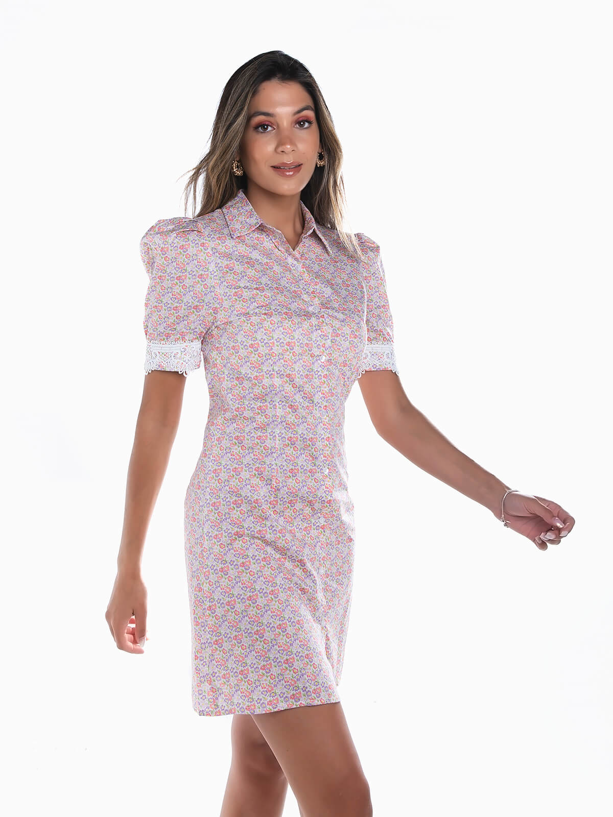 Vestido camiseiro curto em tecido 100% algodão com estampado floral. Vestido de manga curta acabada com bordados. Corte evasé. Gola de abas. Aperto frontal de botões.