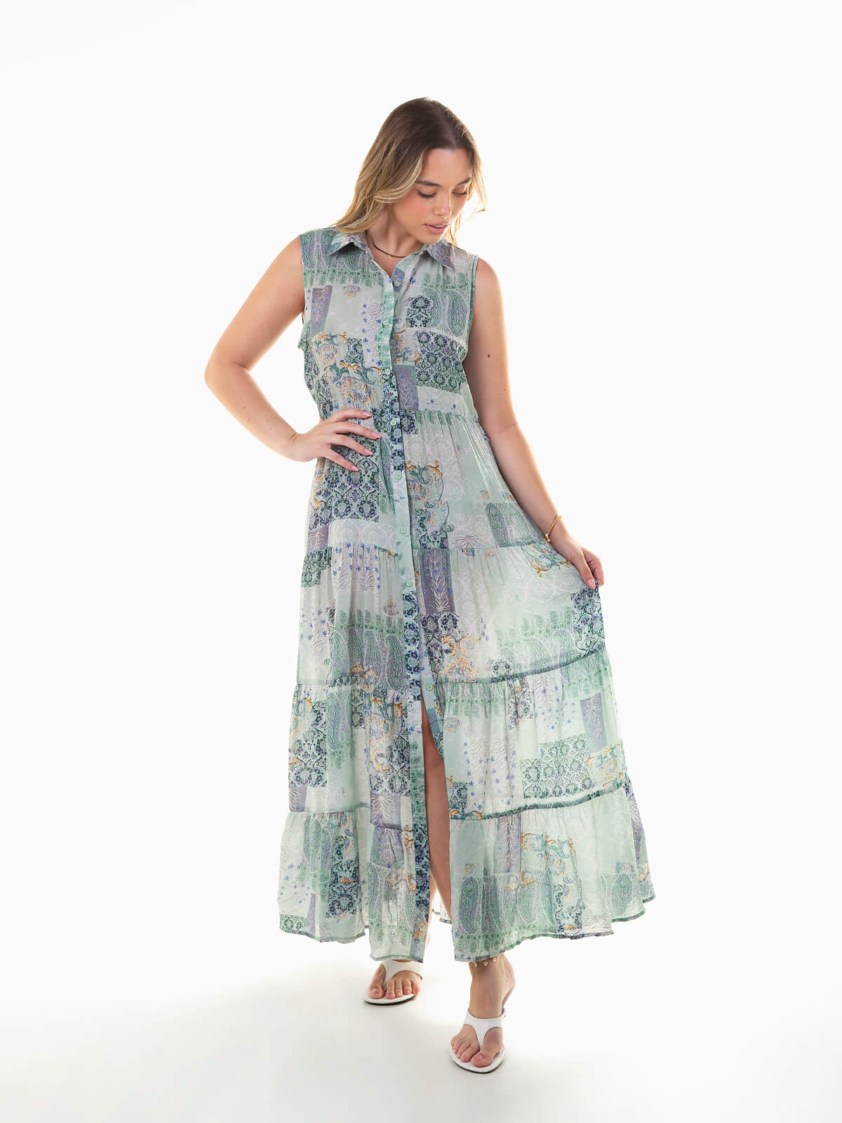 Vestido camiseiro sem mangas com estampado étnico e efeito semitransparente. Modelo comprido com colarinho, abotoamento frontal e corte fluído, ideal para um look leve e descontraído com um toque boho. Um vestido cheio de personalidade, perfeito para os dias de verão com estilo.