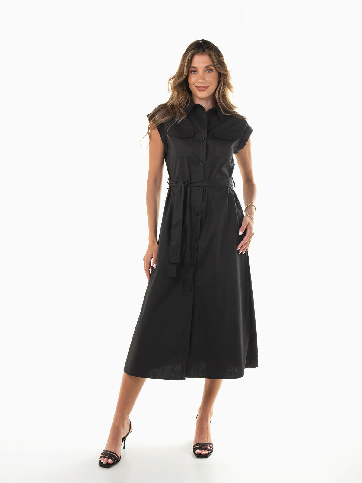 Vestido camiseiro midi com 2 bolsos no peito. Vestido evasé sem mangas com cinto no mesmo tecido para ajustar. Aperto frontal de botões.