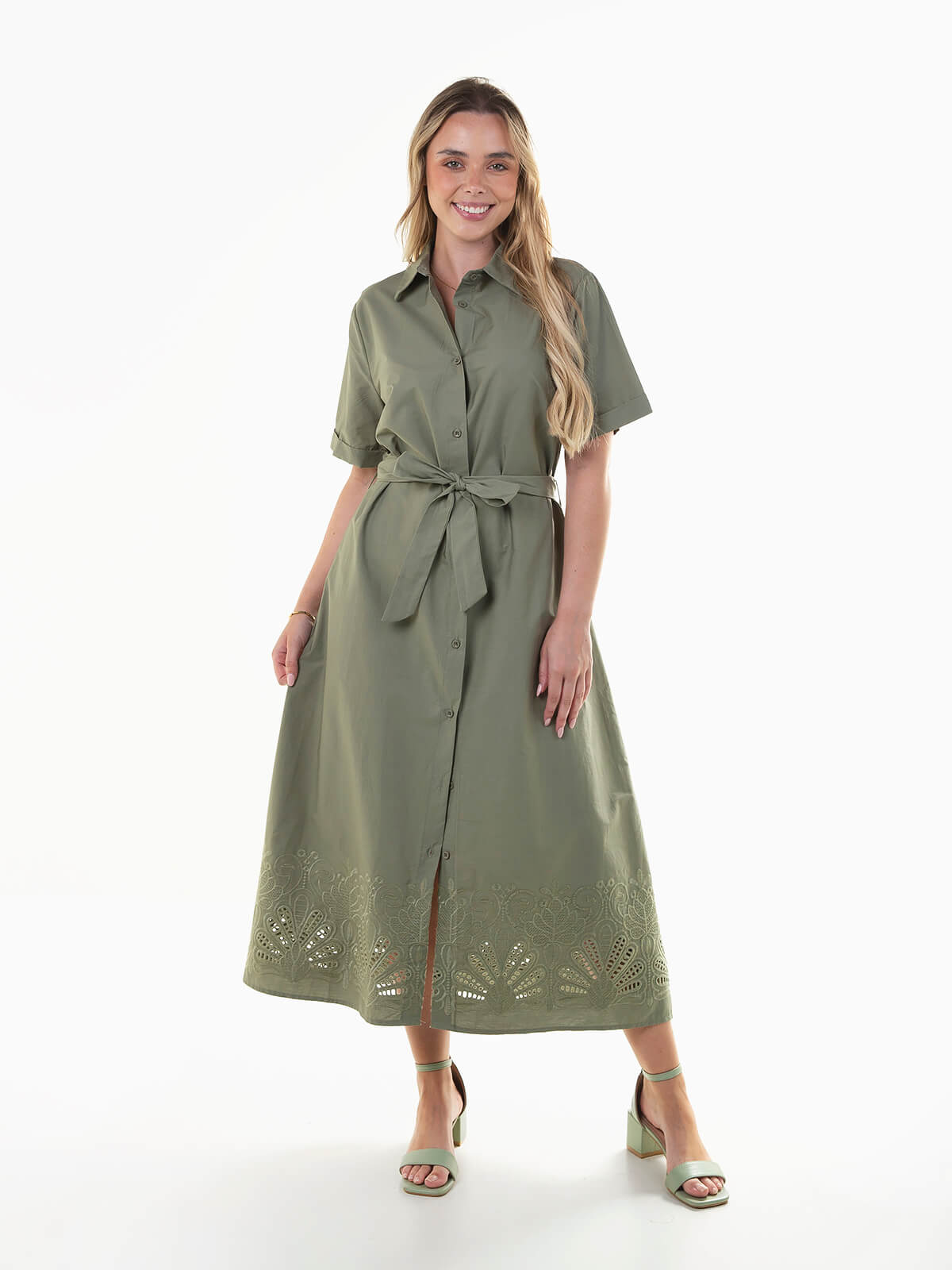 Vestido camiseiro midi com pormenores em bordado inglês na base. Vestido 100% algodão de manga curta com cinto no mesmo tecido para laço. Gola de abas e aperto frontal de botões.