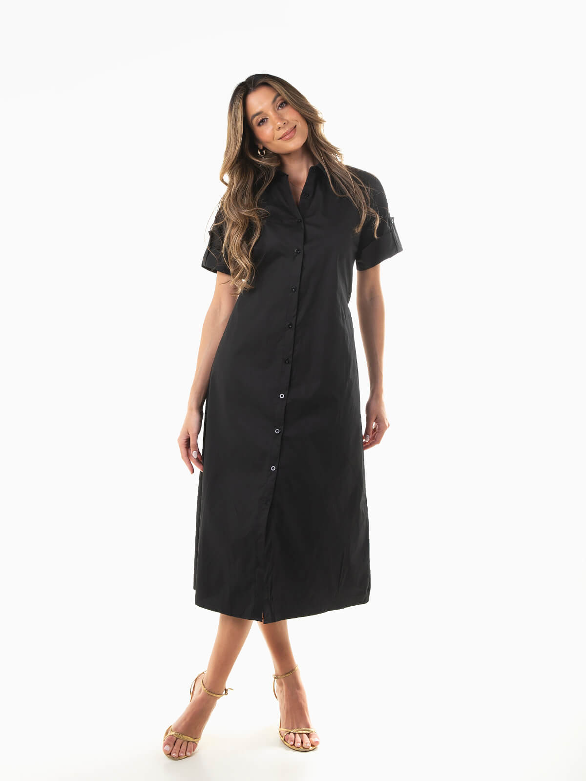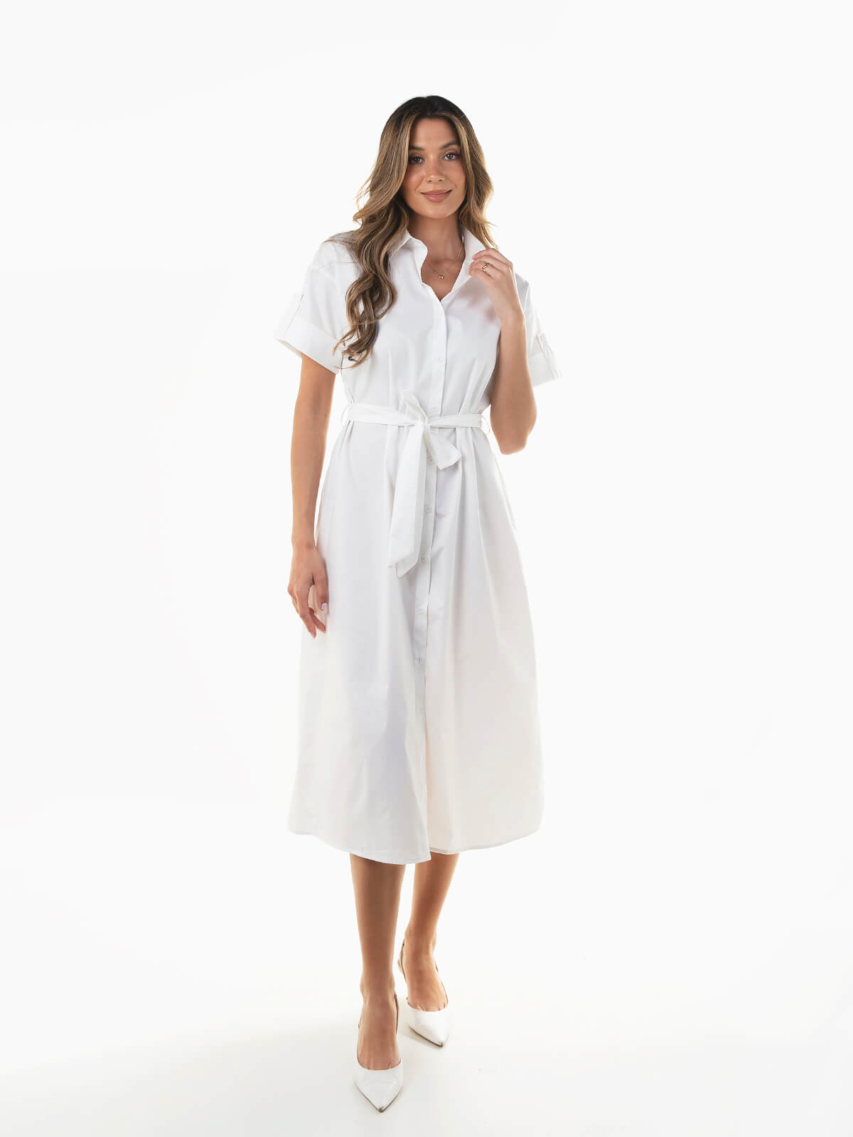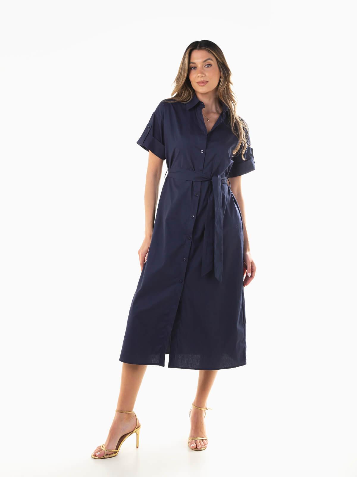 Vestido camiseiro midi de manga curta para mulher. Vestido corte evasé com cinto removível no mesmo tecido para ajustar. Gola abas. Aperto frontal de botões.