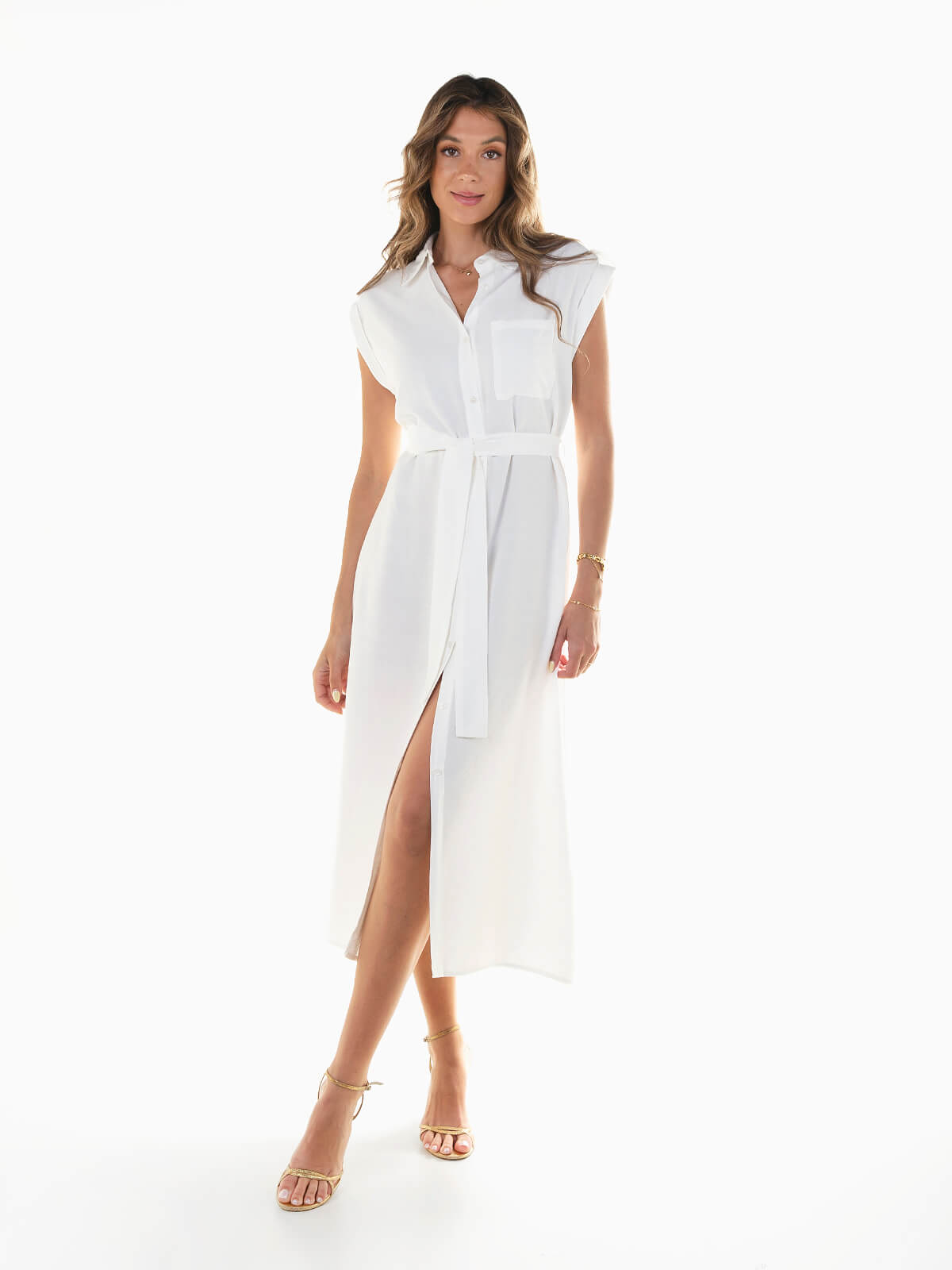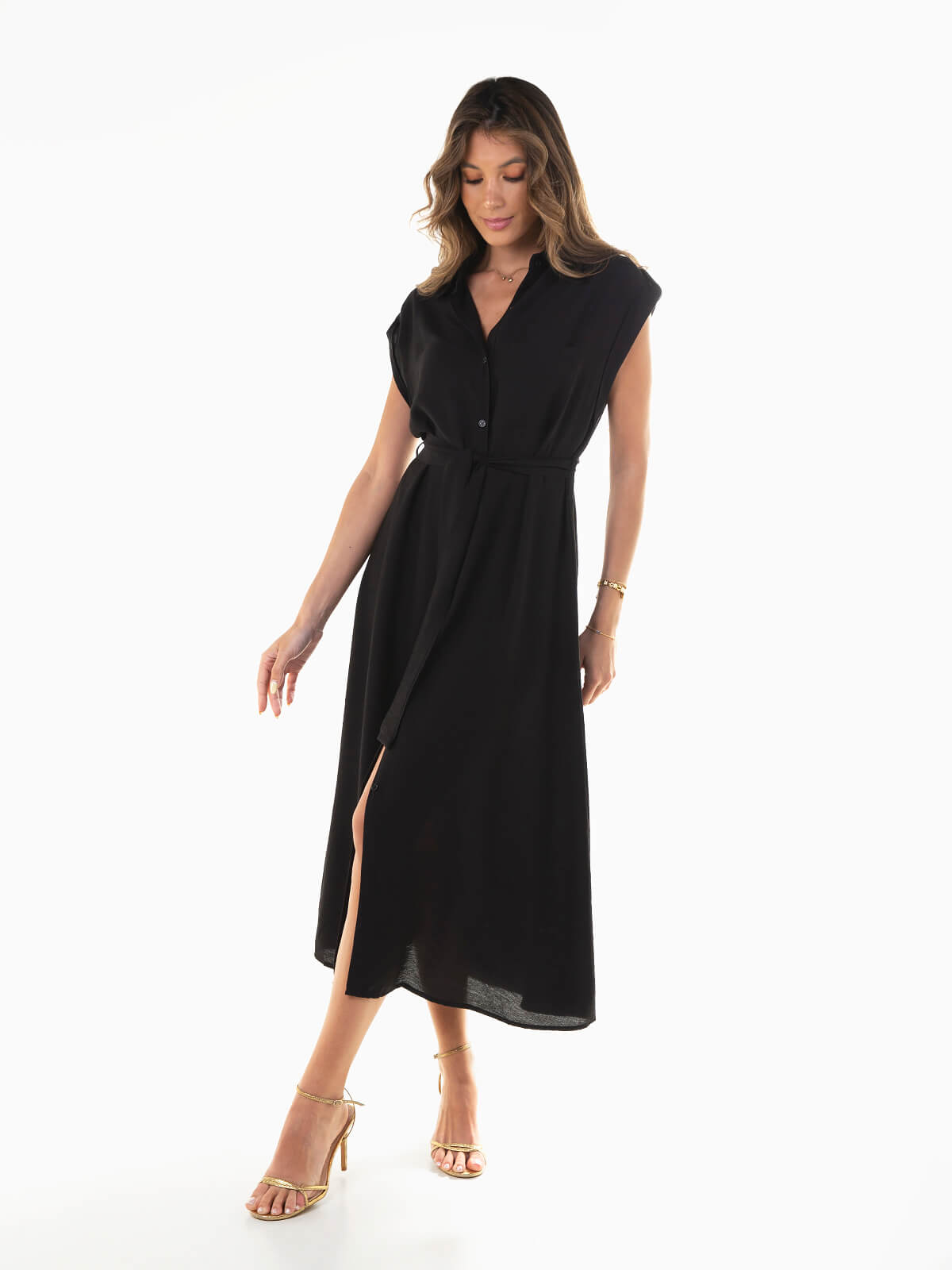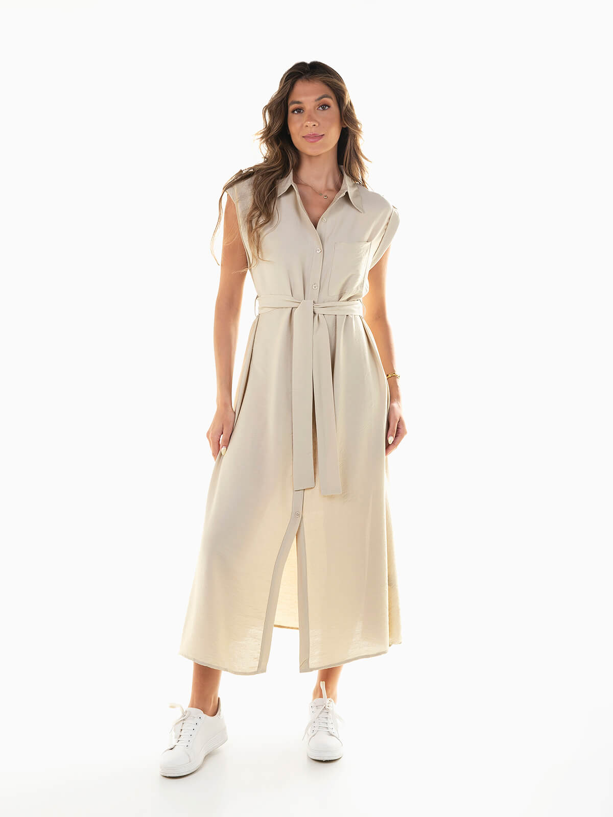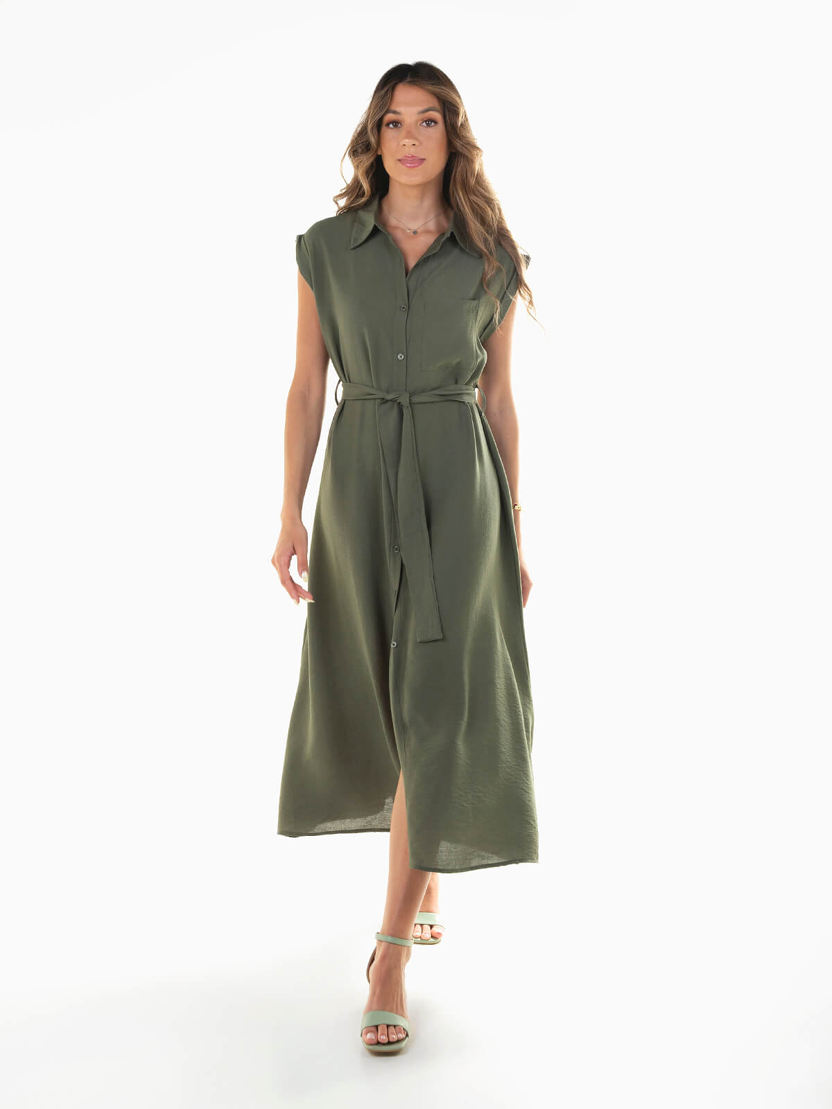 Vestido camiseiro midi sem mangas para senhora. Vestido de corte evasé com cinto no mesmo tecido para ajustar. Presilhas nos ombos e bolso no peito. Gola de abas. Aperto frontal de botões.