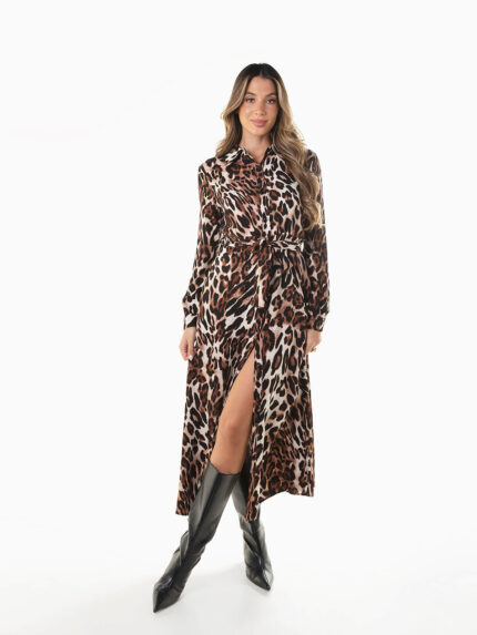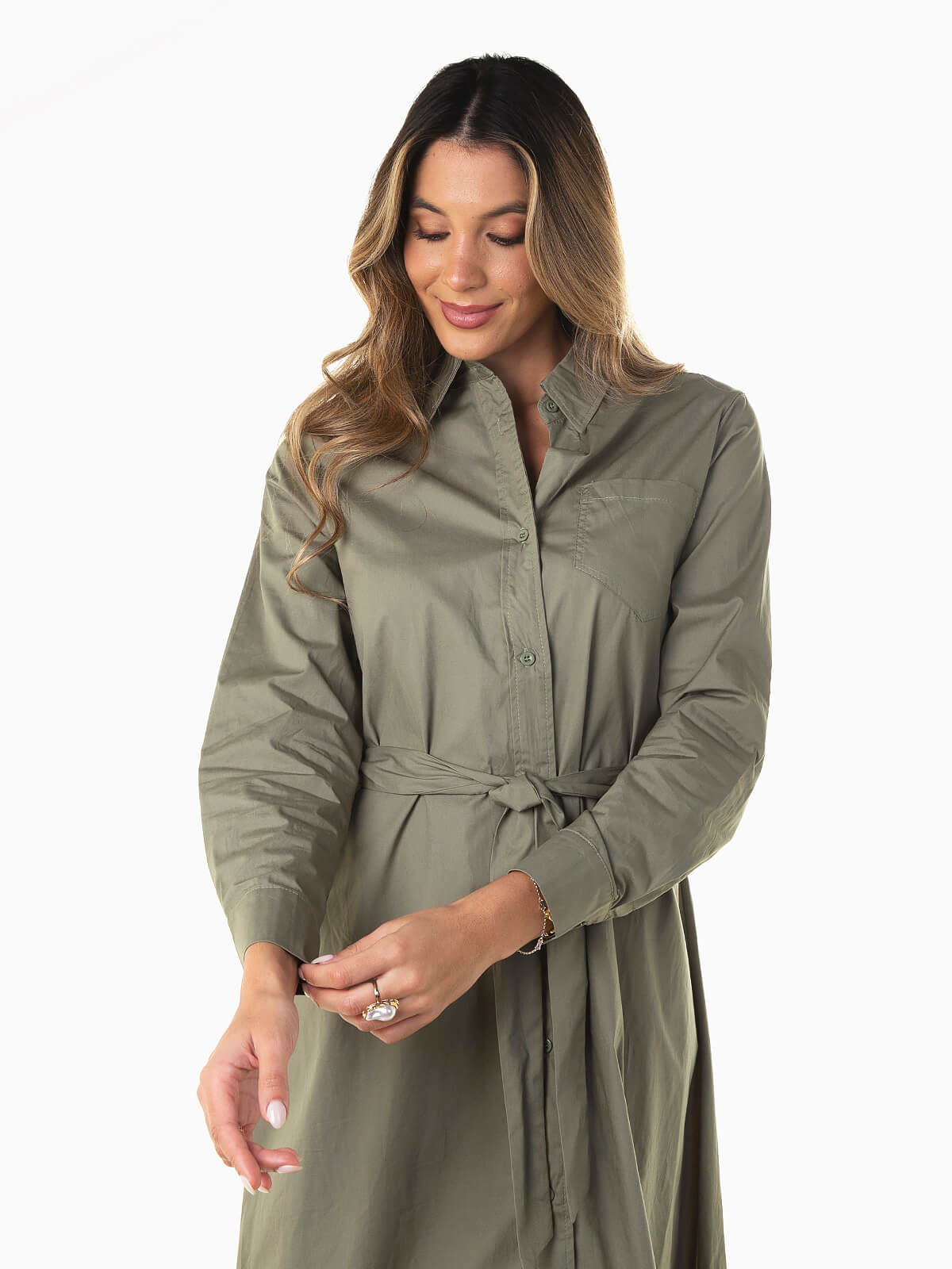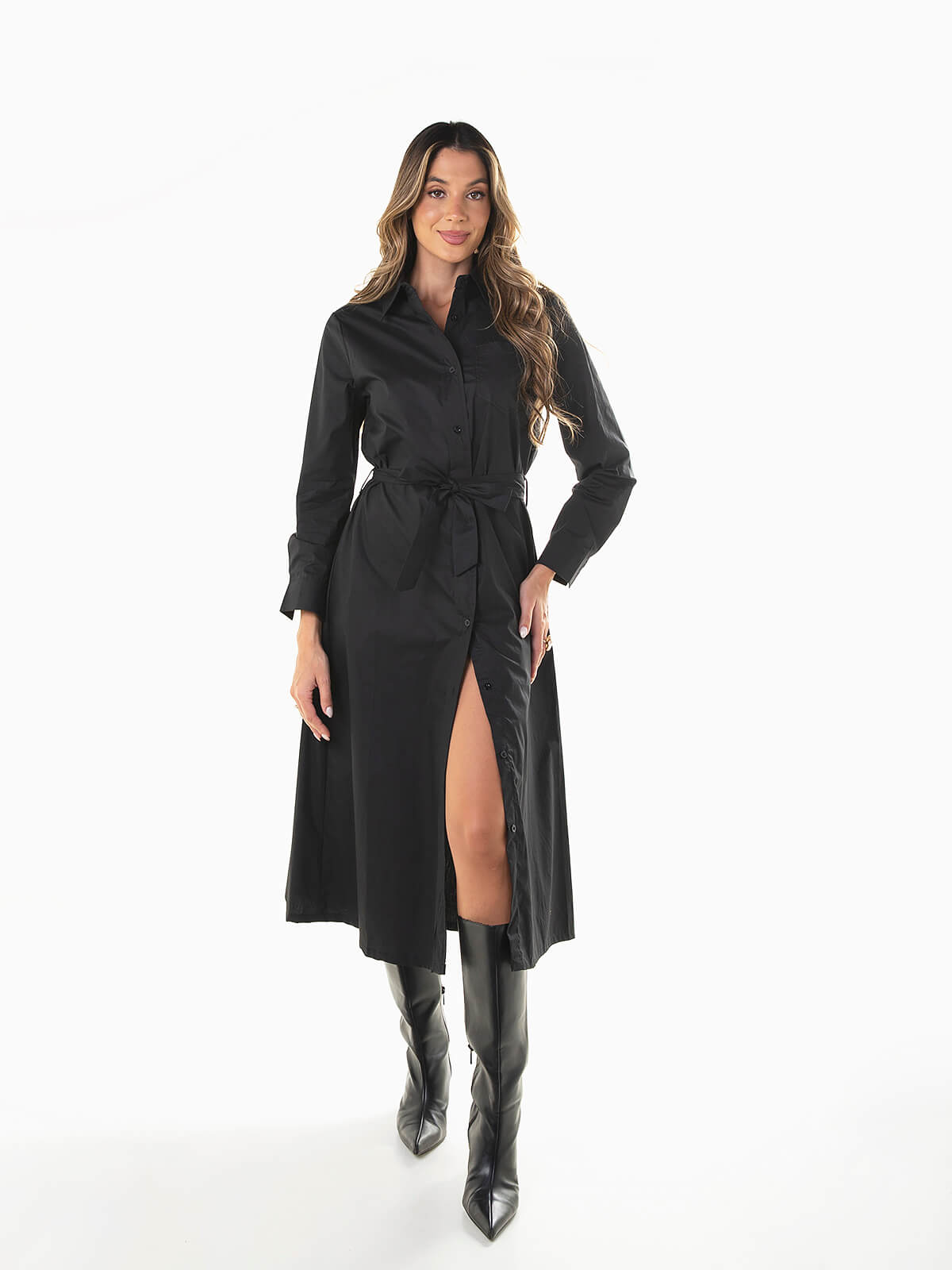 Vestido camiseiro midi em tecido 100% algodão, com gola clássica e fecho de botões à frente. Inclui cinto no mesmo tecido para ajustar na cintura e criar uma silhueta feminina e elegante. Modelo versátil e confortável, ideal para usar no dia a dia com botas ou em looks mais sofisticados de outono.