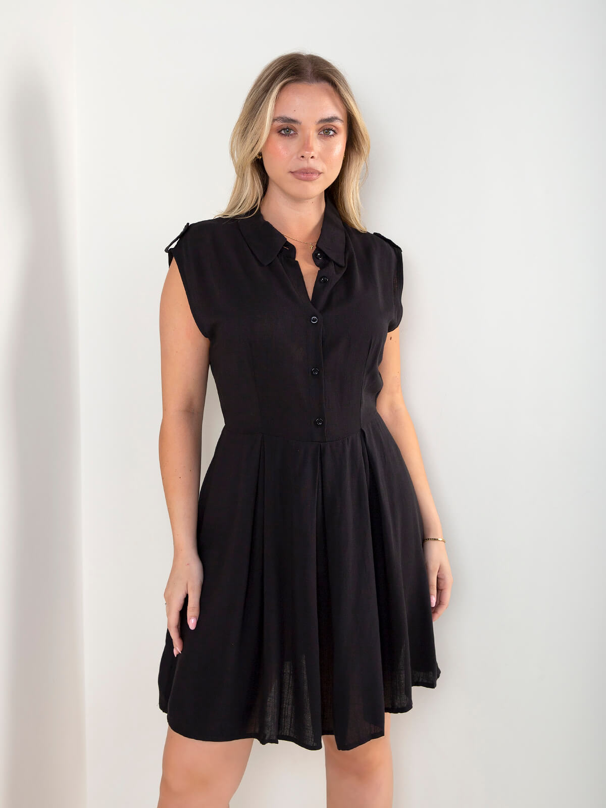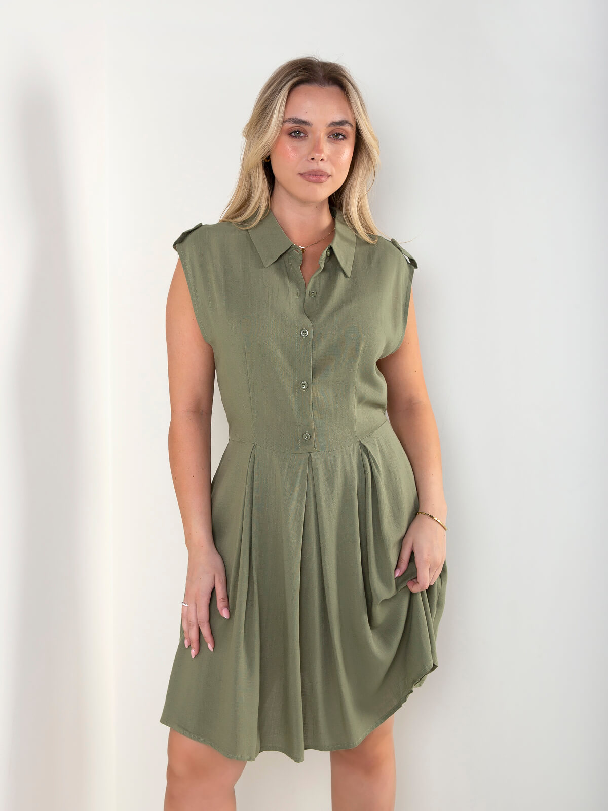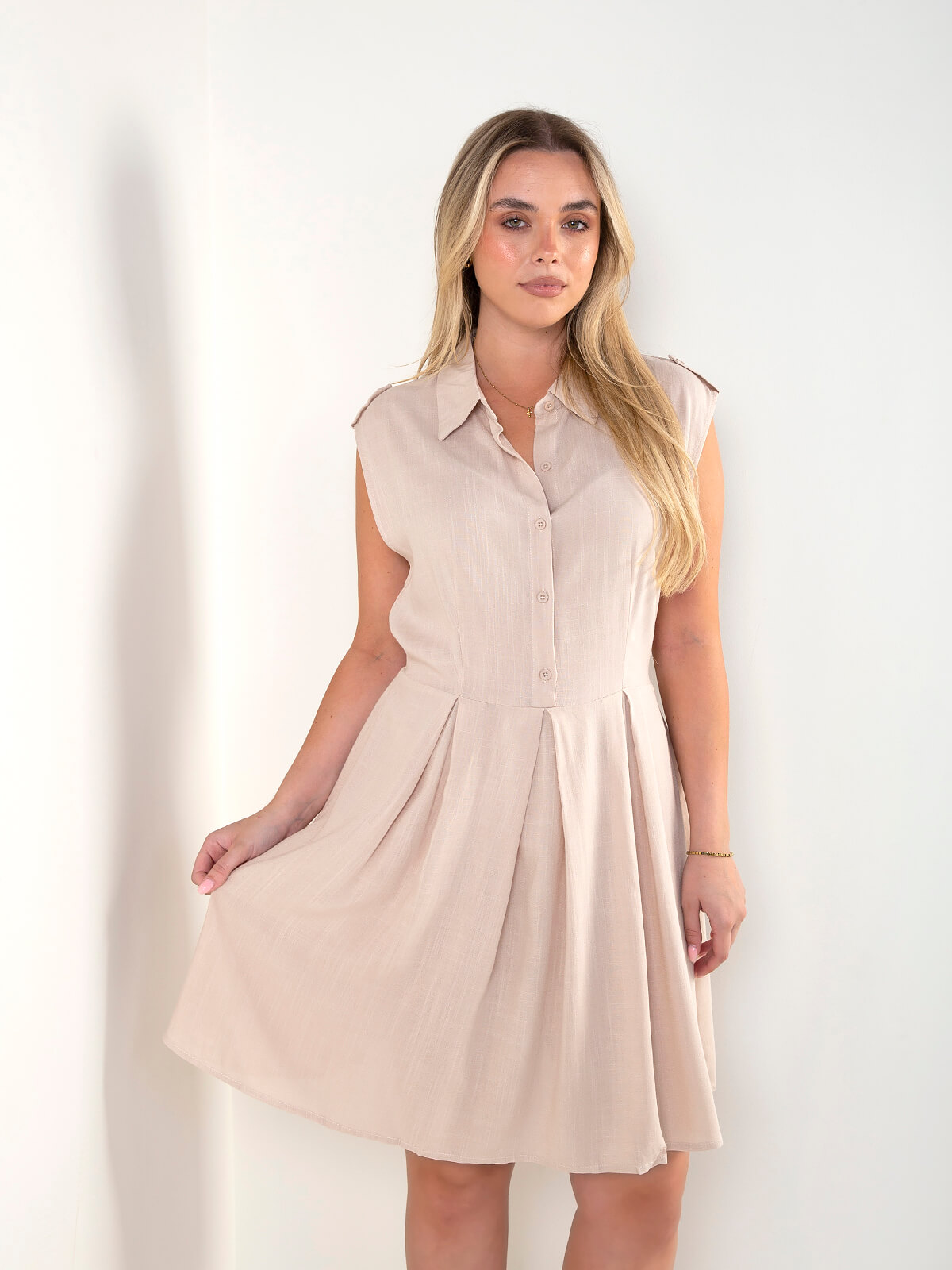 Vestido camiseiro sem mangas com botões frontais e gola clássica. Modelo fluido com corte na cintura que cria um efeito leve e feminino.