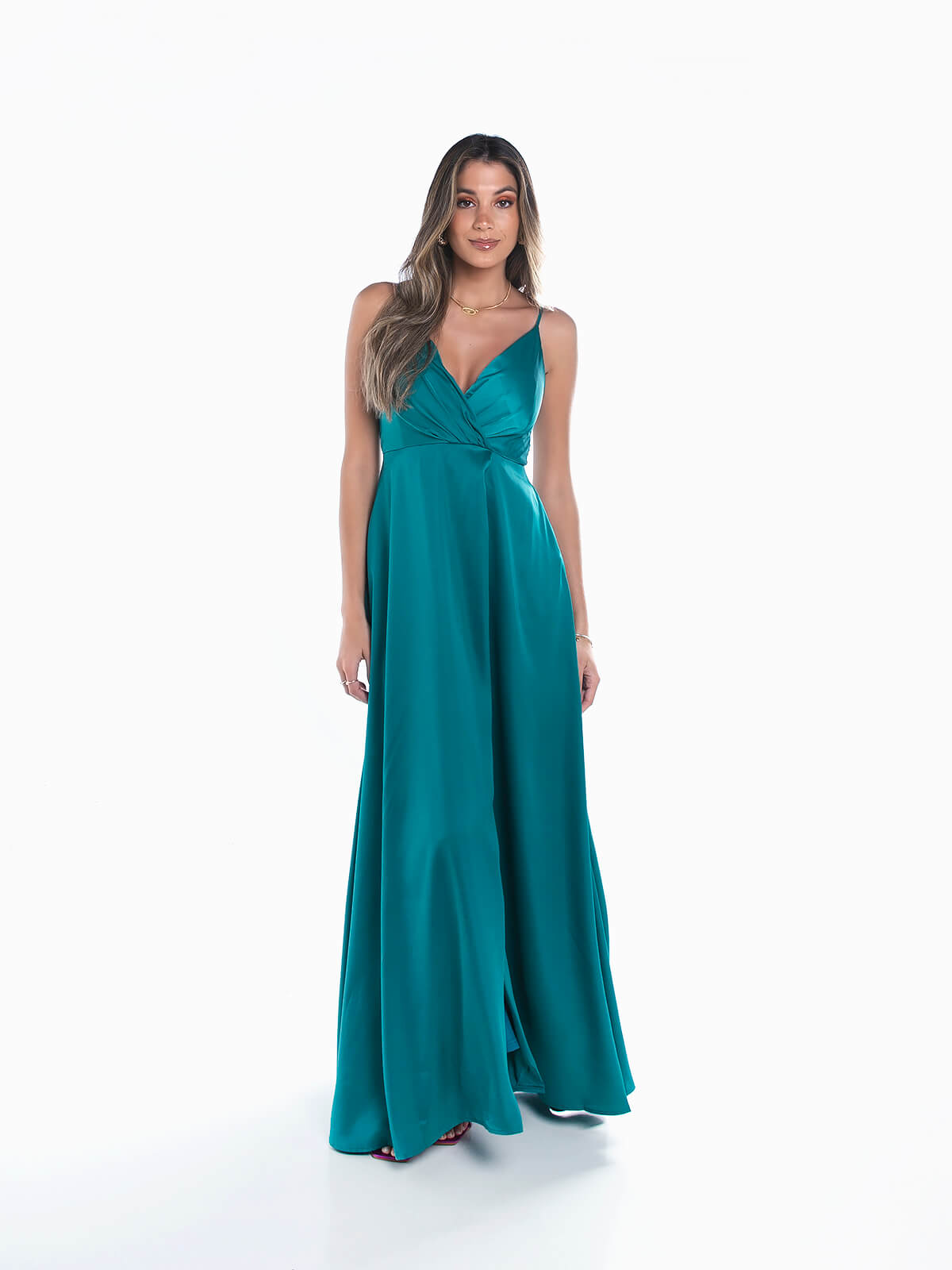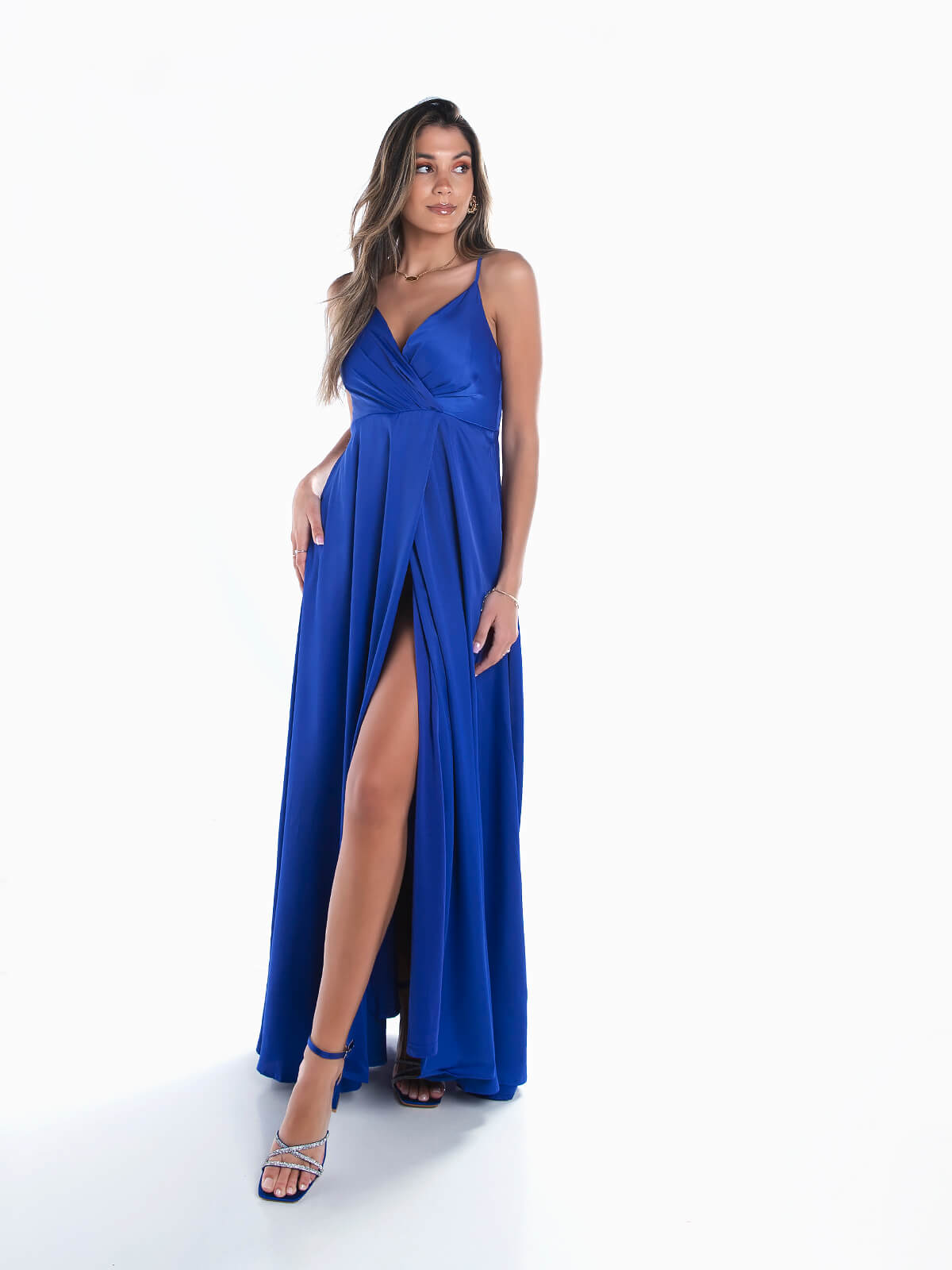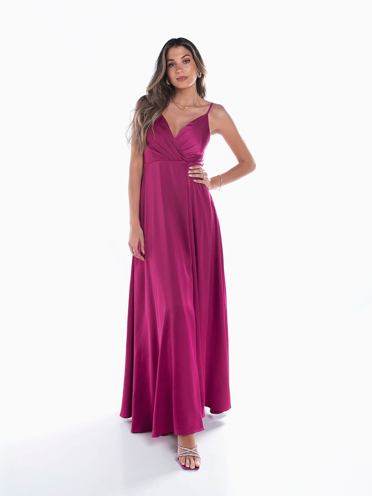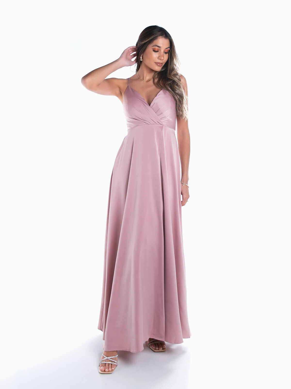 Vestido de cerimónia comprido acetinado para senhora. Vestido de festa com alças finas ajustáveis. Decote cruzado. Almofadado. 2 bolsos laterais. Pormenor de abertura. Aperto posterior de fecho éclair.