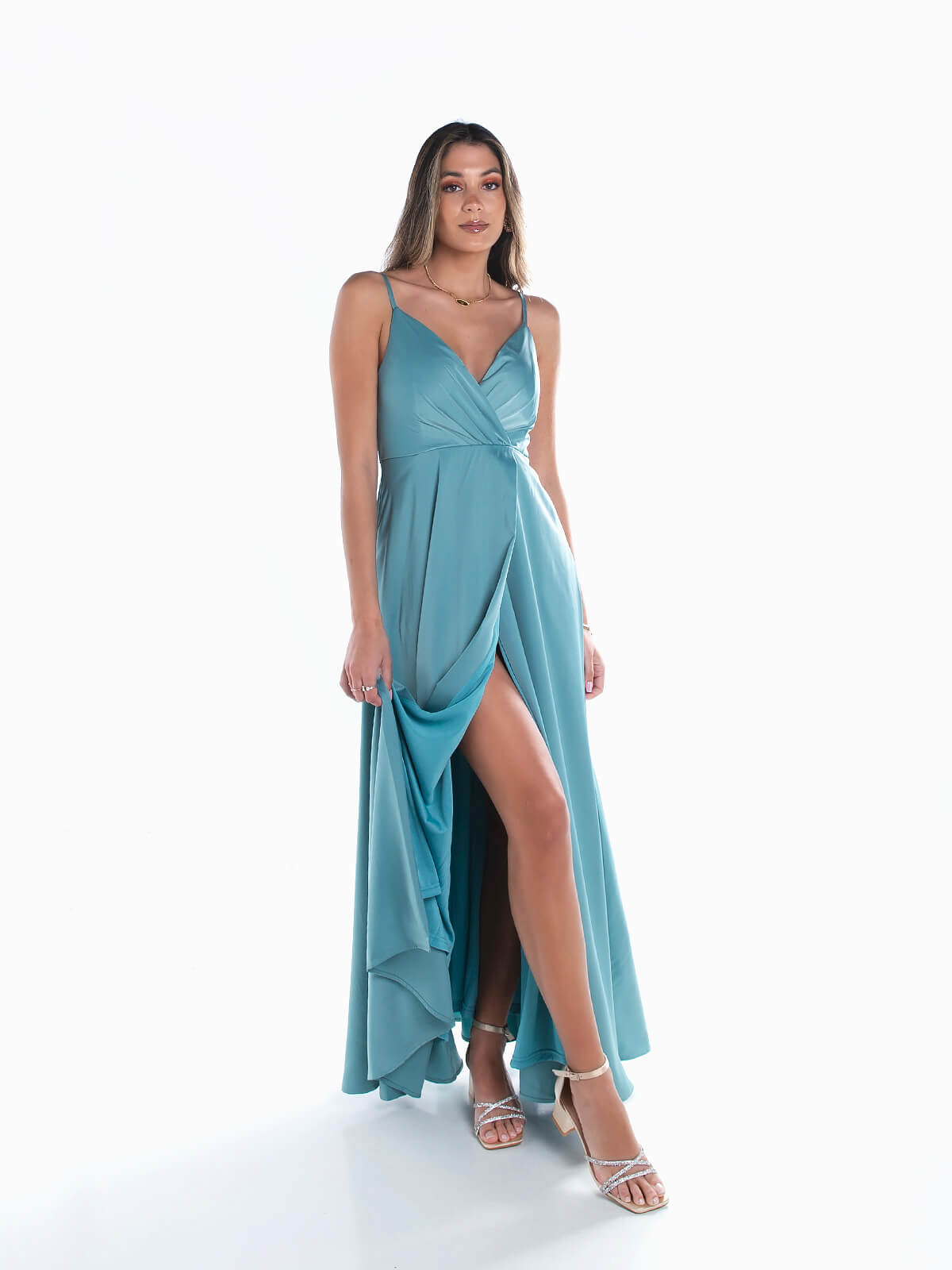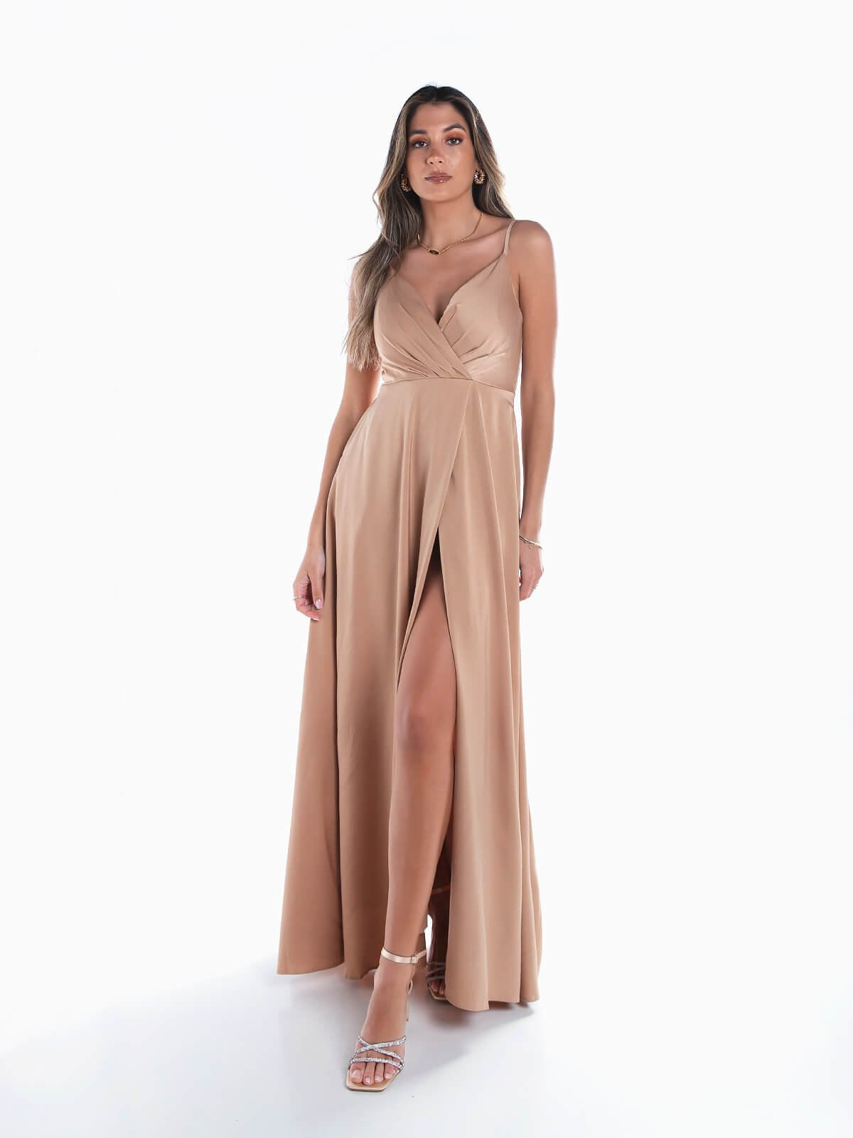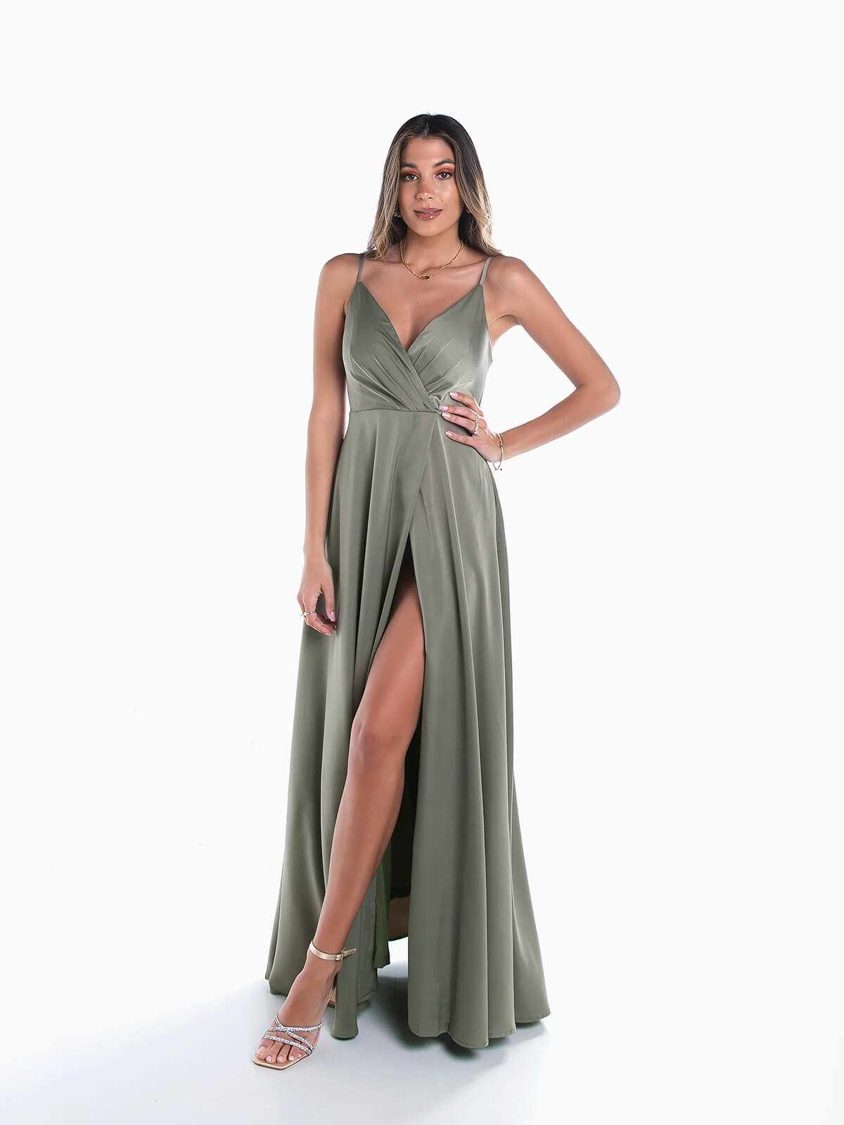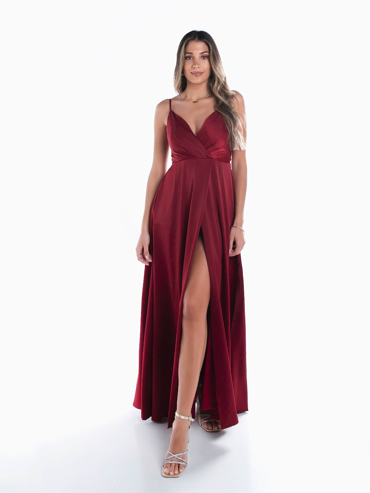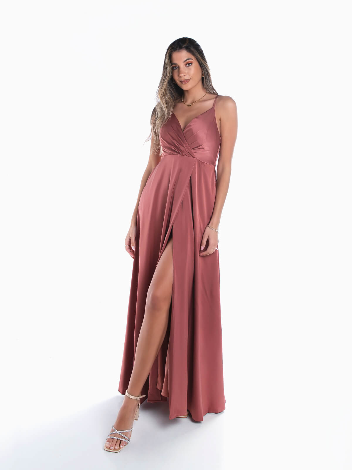 Vestido de cerimónia comprido acetinado para senhora. Vestido de festa com alças finas ajustáveis. Decote cruzado. Almofadado. 2 bolsos laterais. Pormenor de abertura. Aperto posterior de fecho éclair.